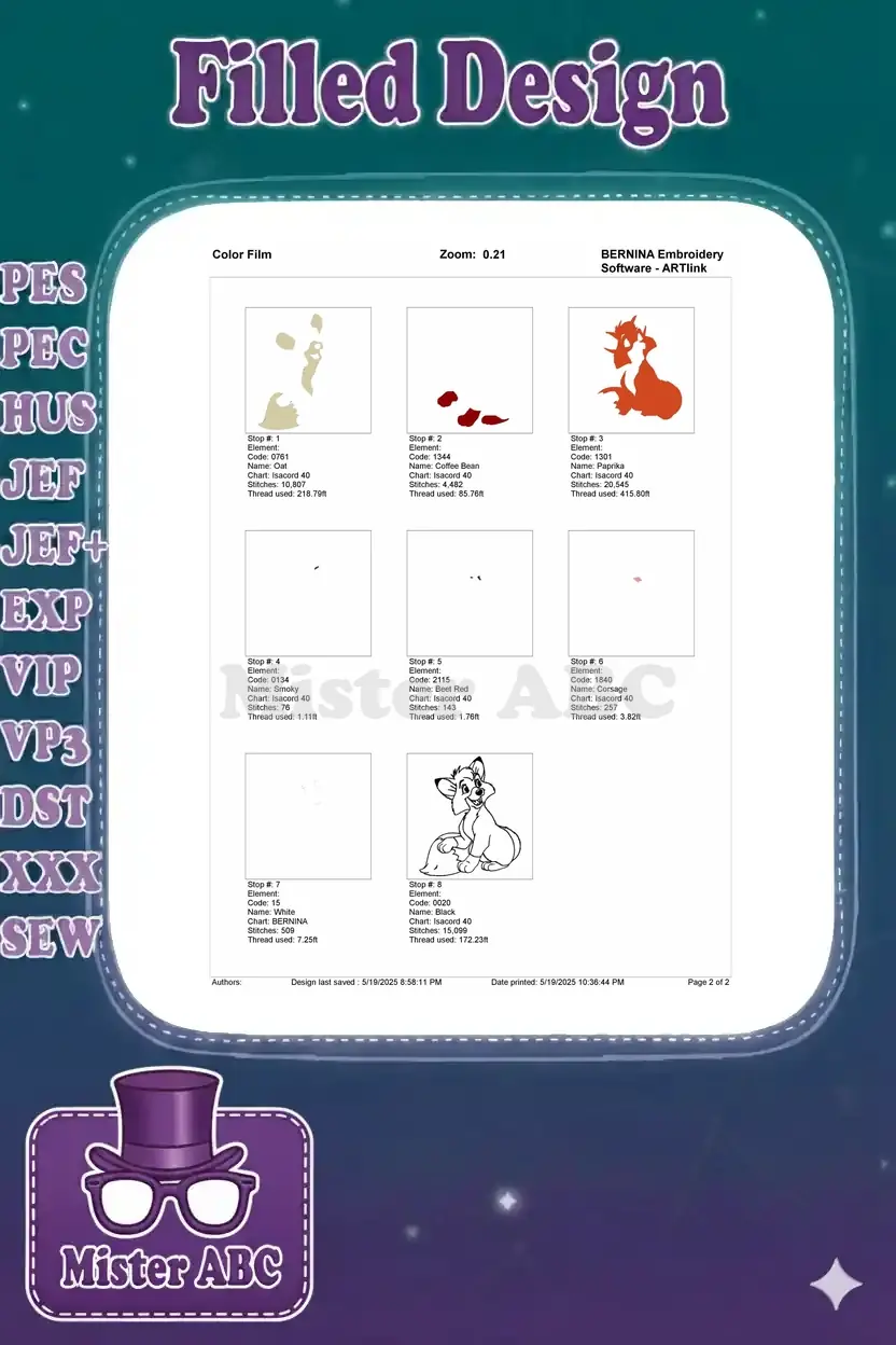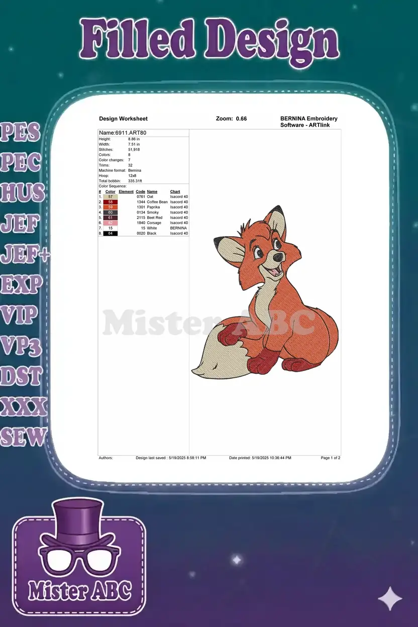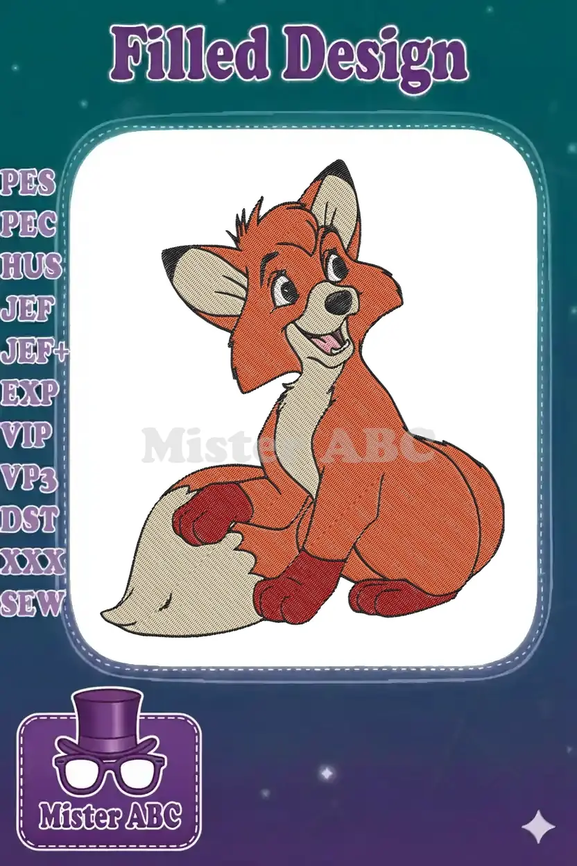 Charming Todd the fox embroidery design, perfect for Disney fans. High-quality digital pattern for apparel & decor.