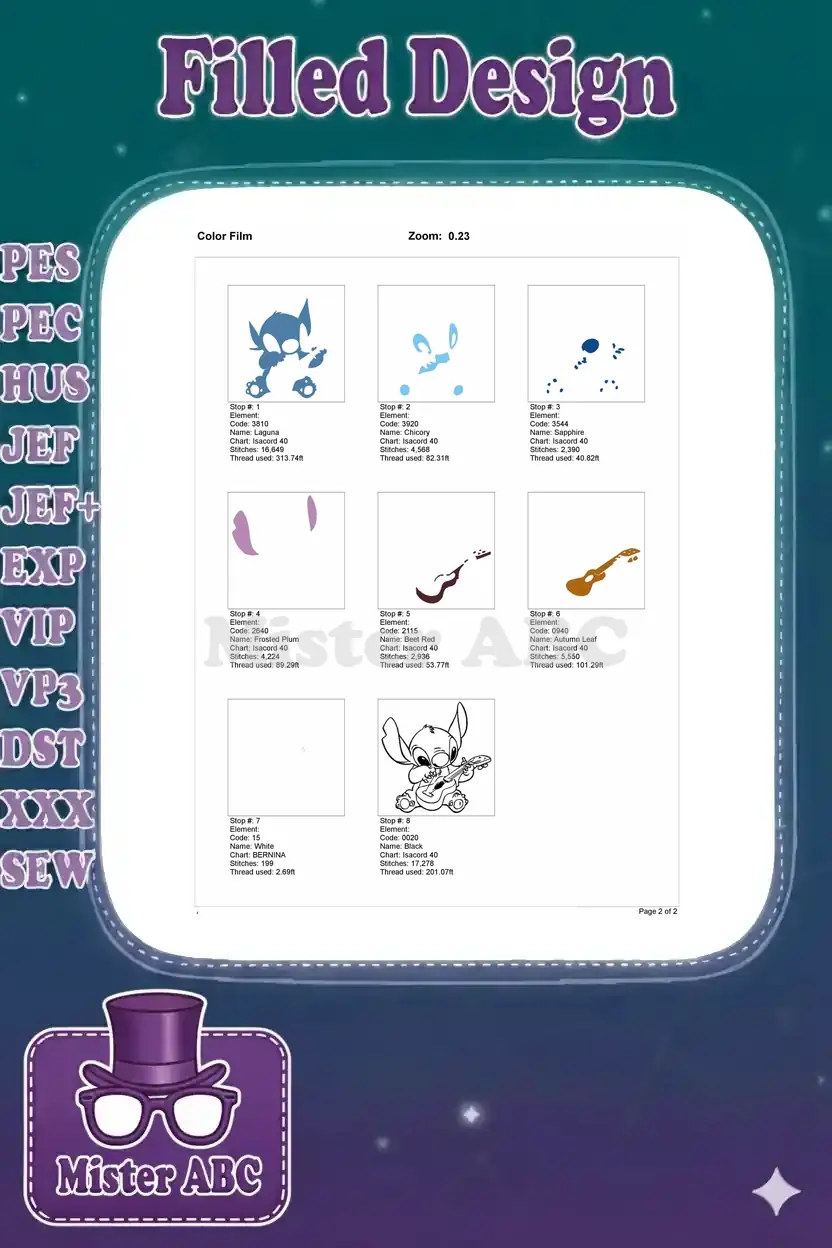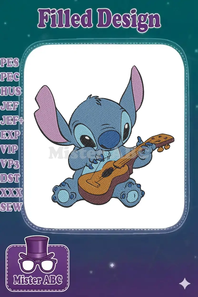 Cute Stitch playing ukulele embroidery designs for tropical themed projects