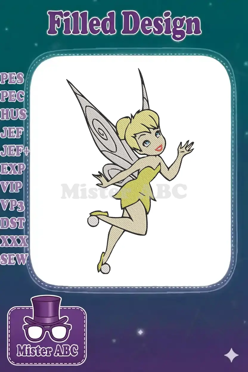 Cute Tinker Bell flying fairy character embroidery designs