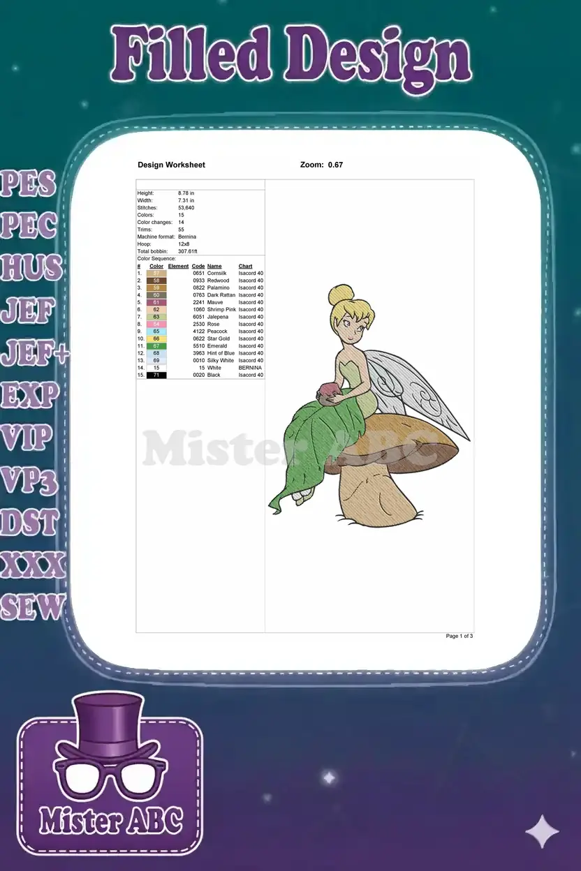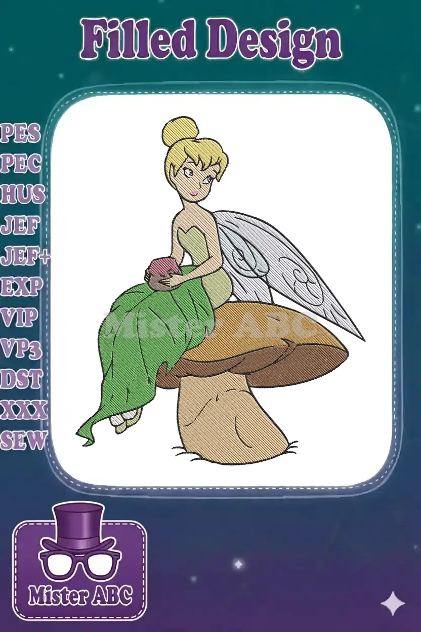 Cute Tinkerbell Fairy Sitting on Mushroom Leaf Dress Embroidery Designs