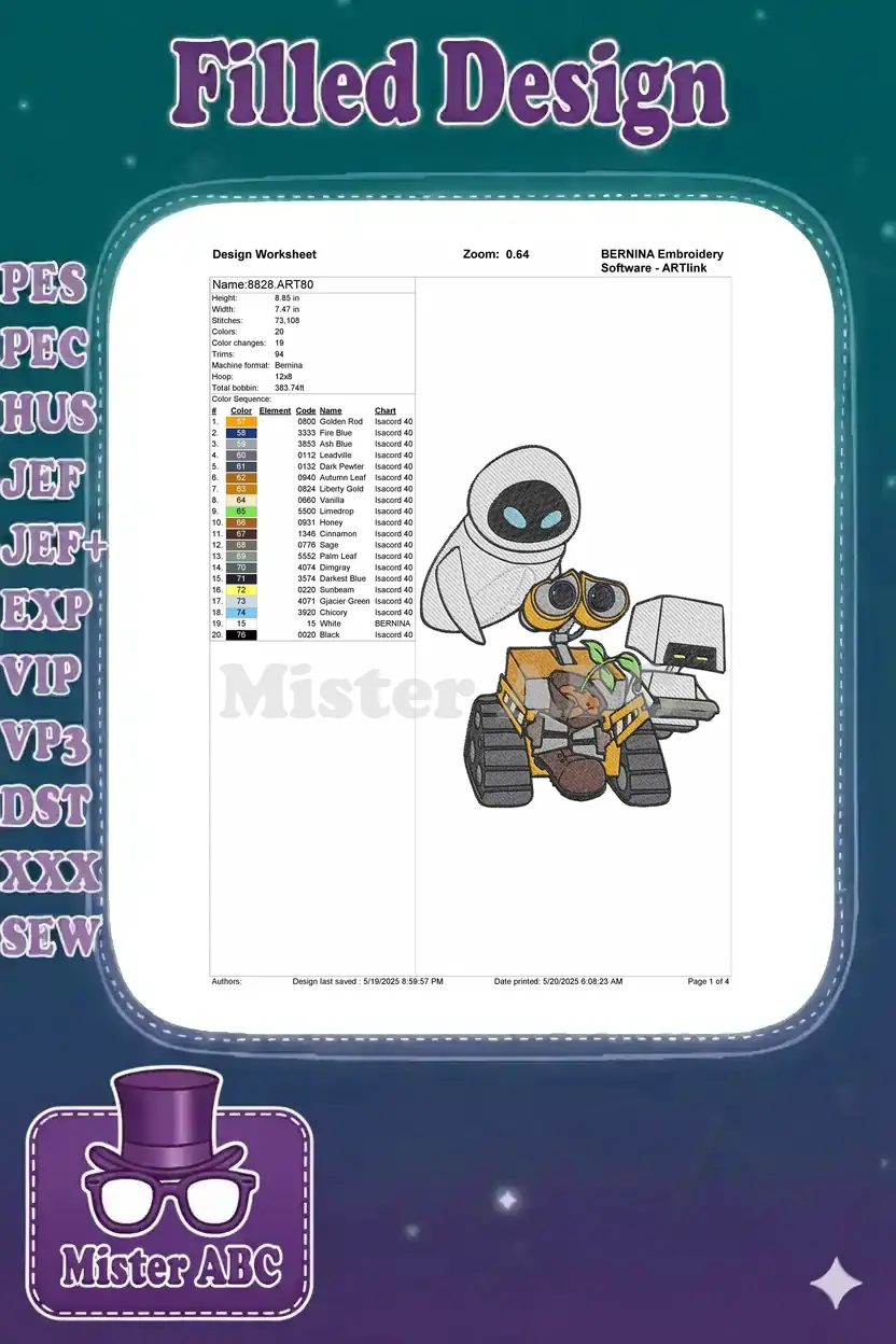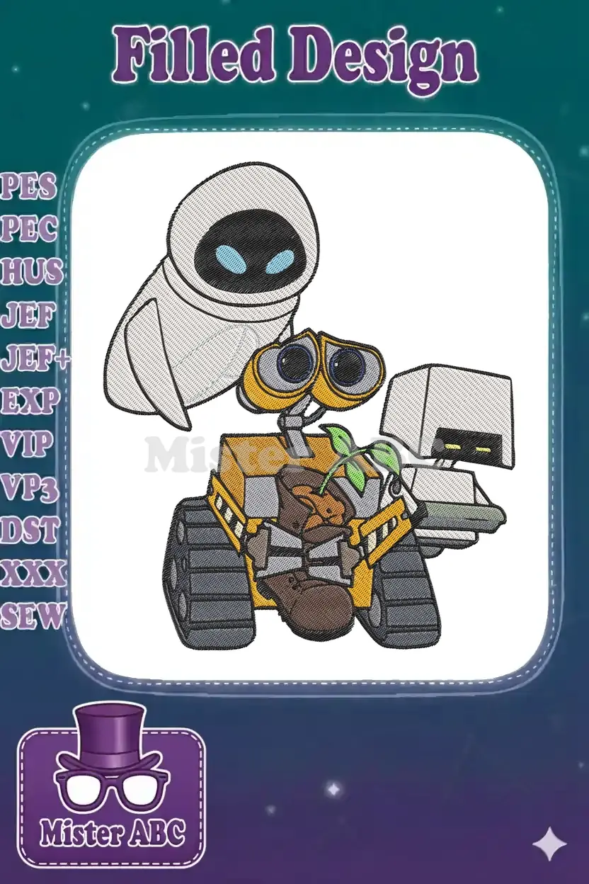 Cute WALL-E and EVE robot plant movie embroidery designs