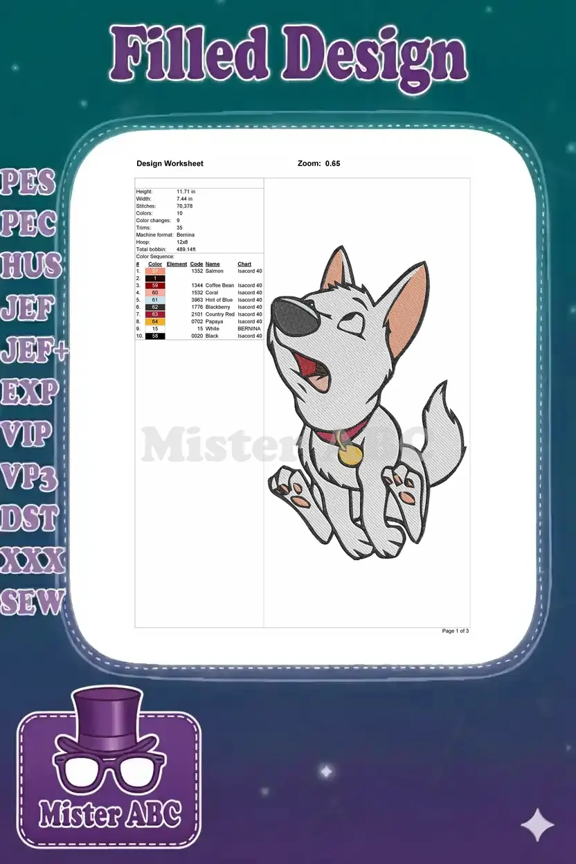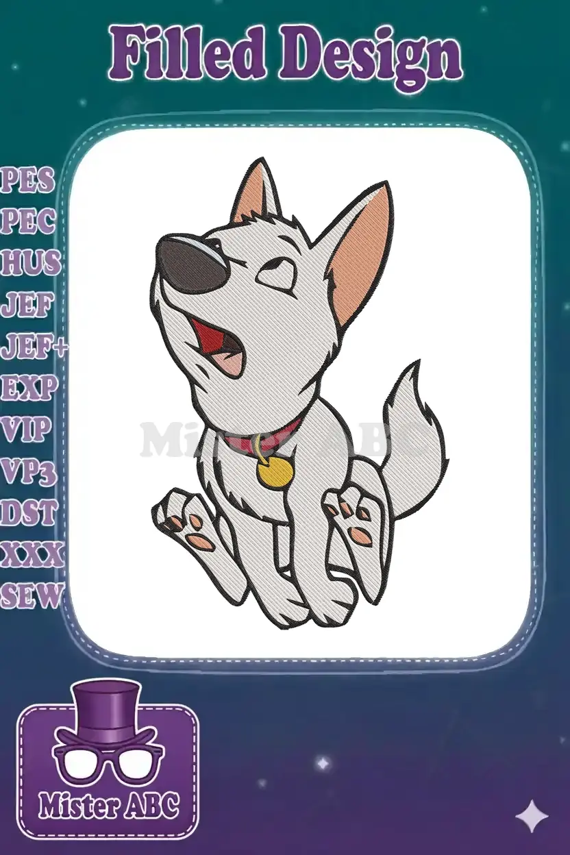 Unleash the hero in your crafts with this dynamic Bolt embroidery design, perfect for fans of the adventurous dog.