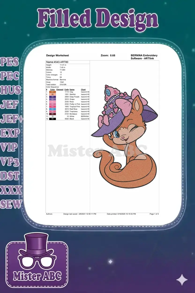 Cute winking fox-squirrel with purple heart hat embroidery designs