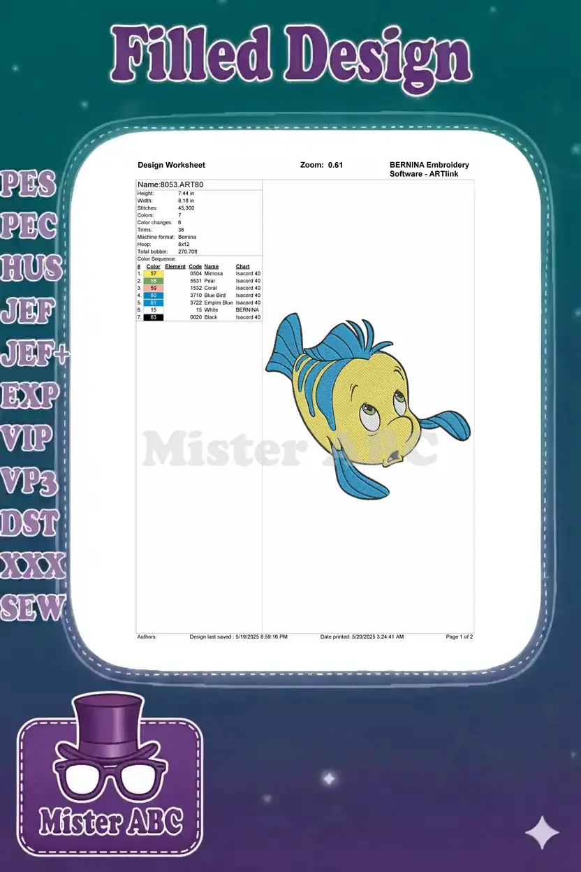 Cute yellow and blue Flounder fish embroidery designs