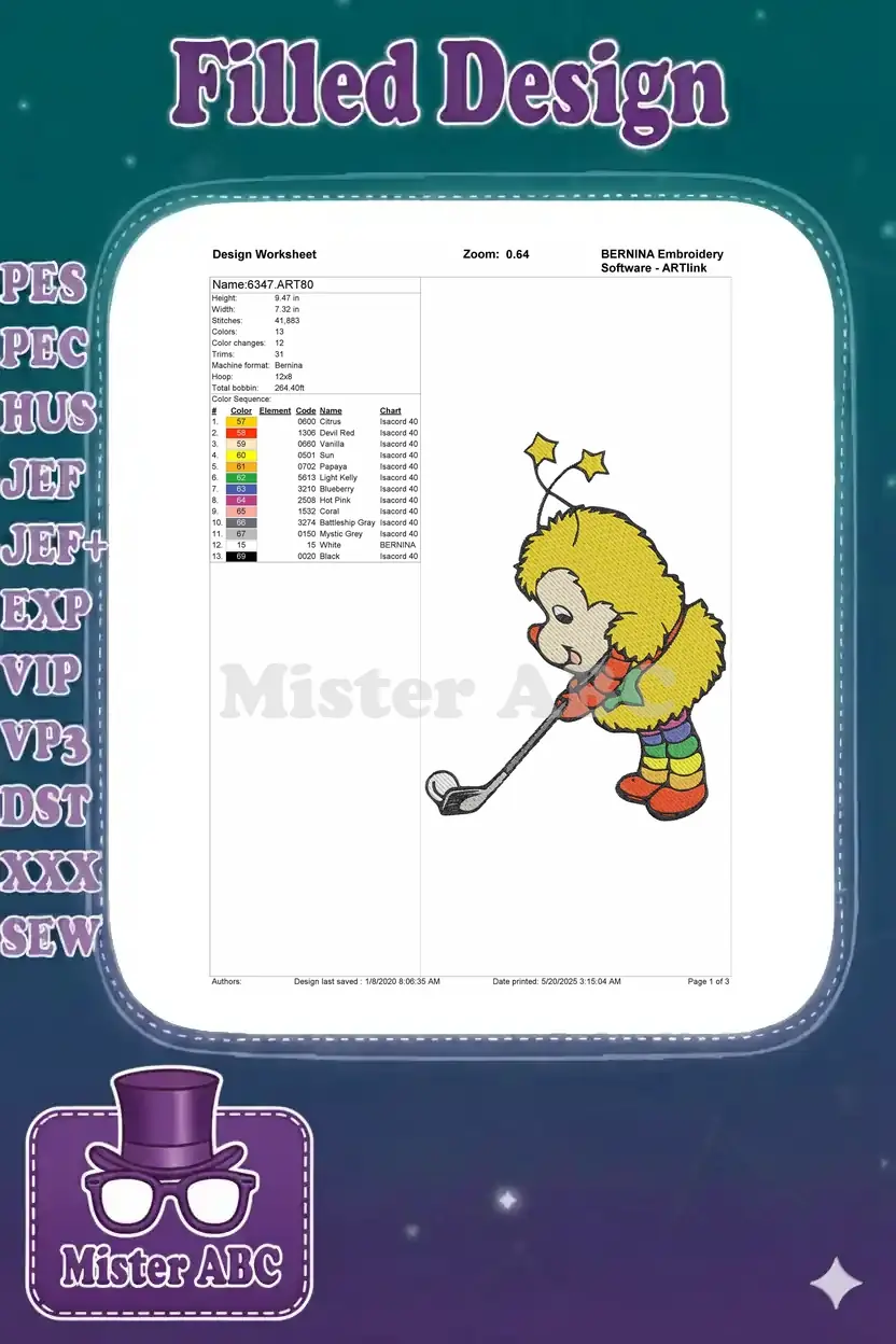 Cute yellow fluffy golfing creature with star antennas embroidery designs