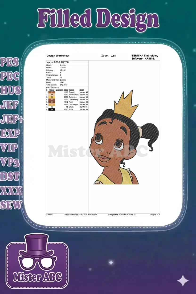 Cute young Princess Tiana cartoon embroidery designs for children - Instant Download Cute young Princess Tiana cartoon embroidery designs for children – Instant Download