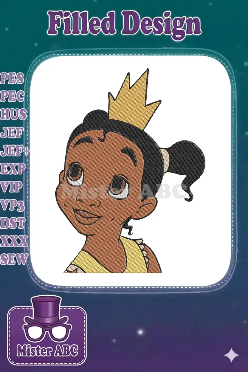 Adorable young Princess Tiana embroidery design, perfect for adding royal charm to any project. Capture her sweet, hopeful gaze!