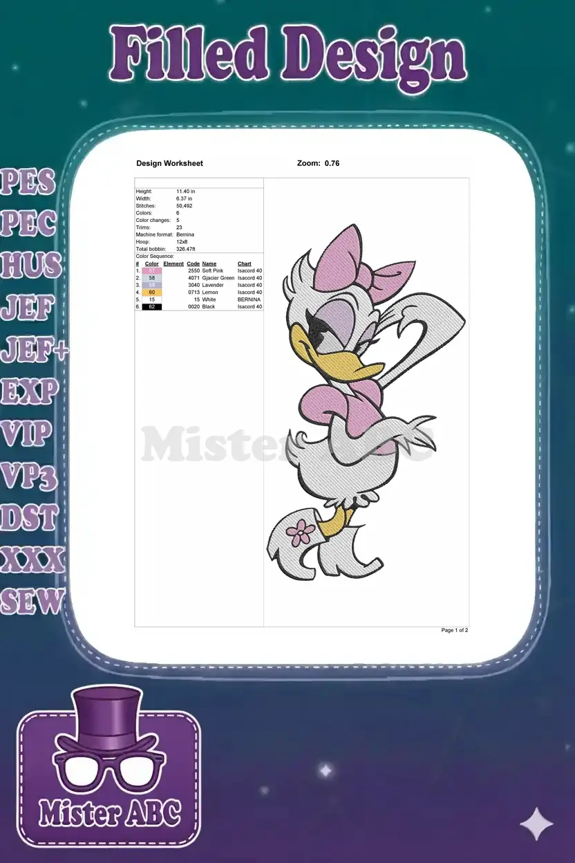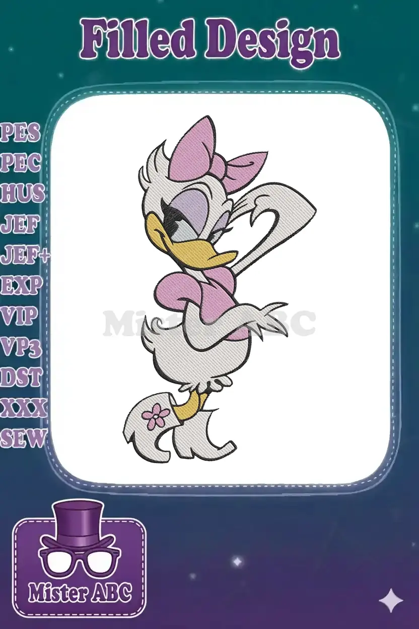 Charming Daisy Duck embroidery design, perfect for adding a touch of playful Disney magic to any project. Vibrant colors and detailed stitching for fans.