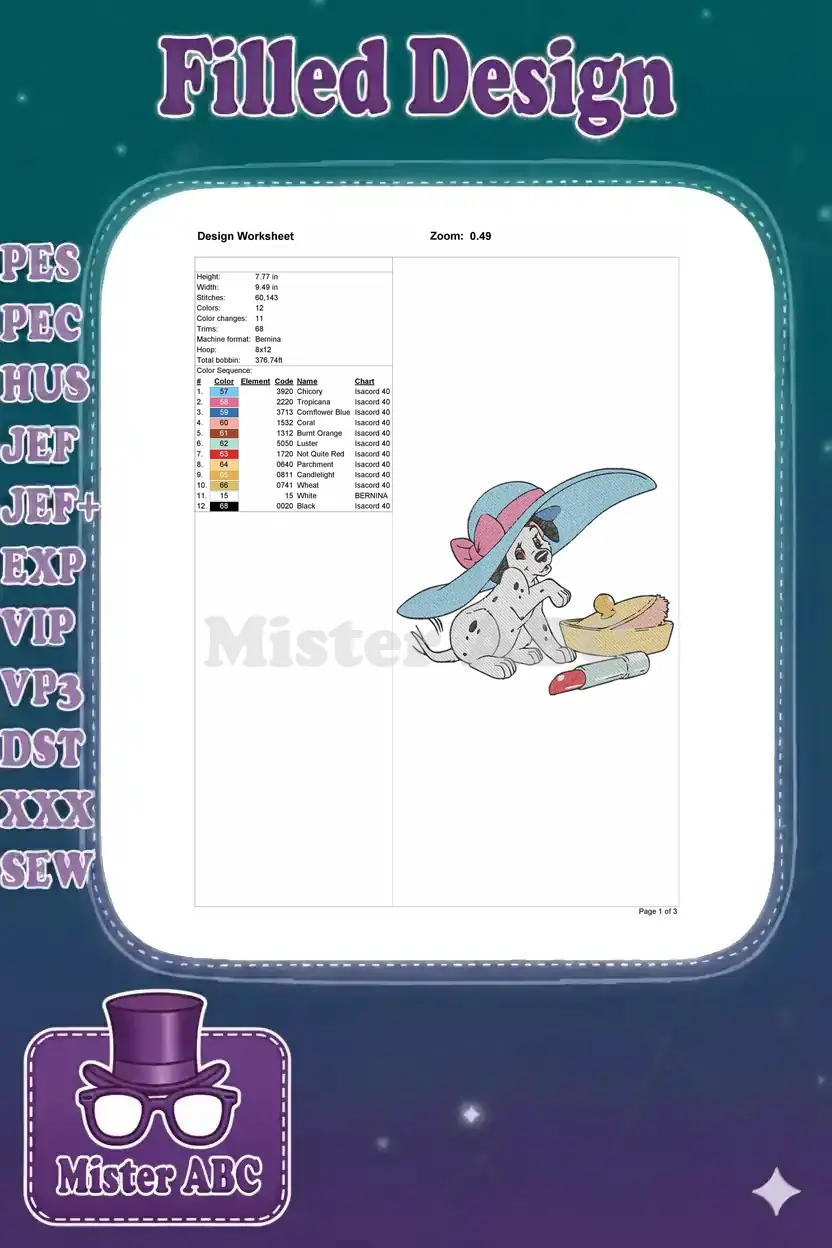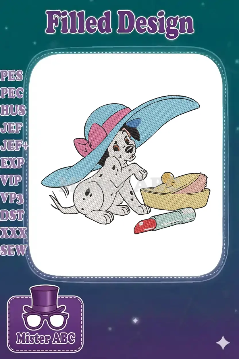 Dalmatian puppy playing dress-up with hat and makeup embroidery designs