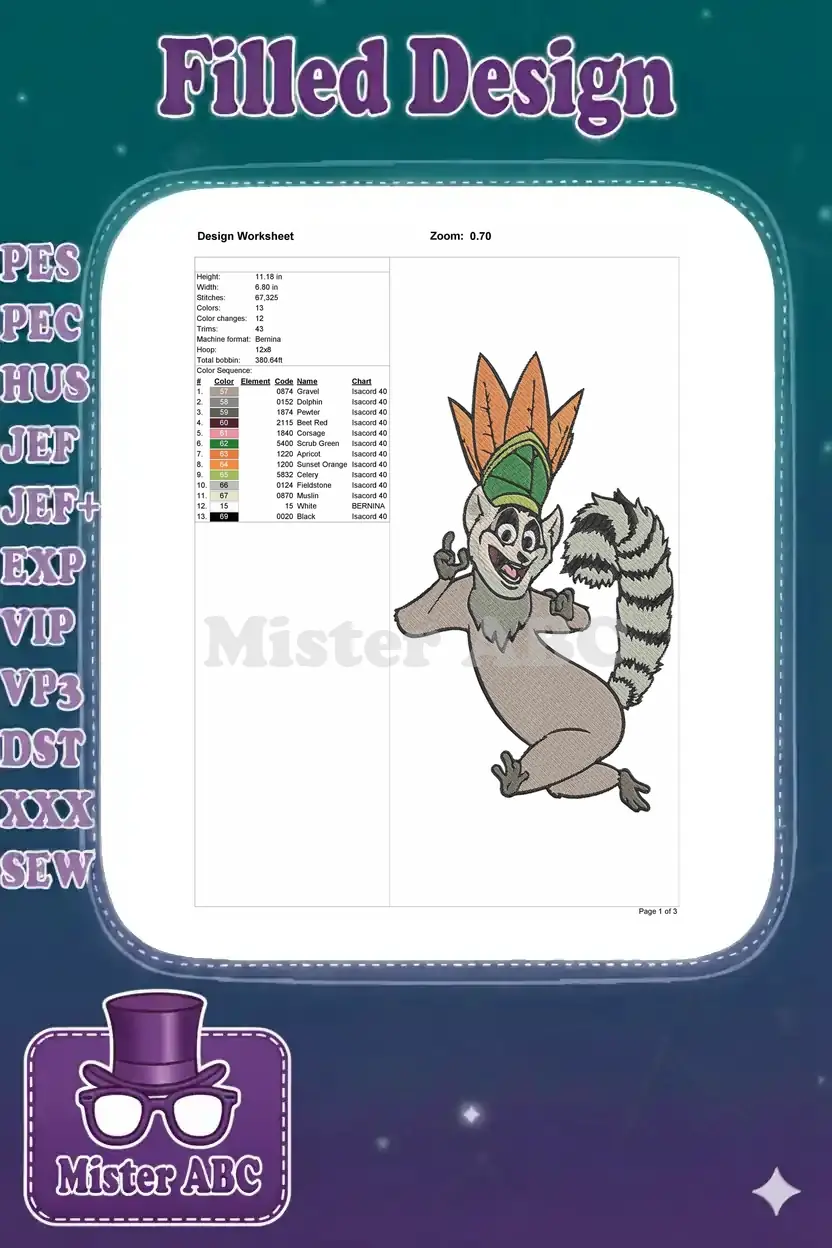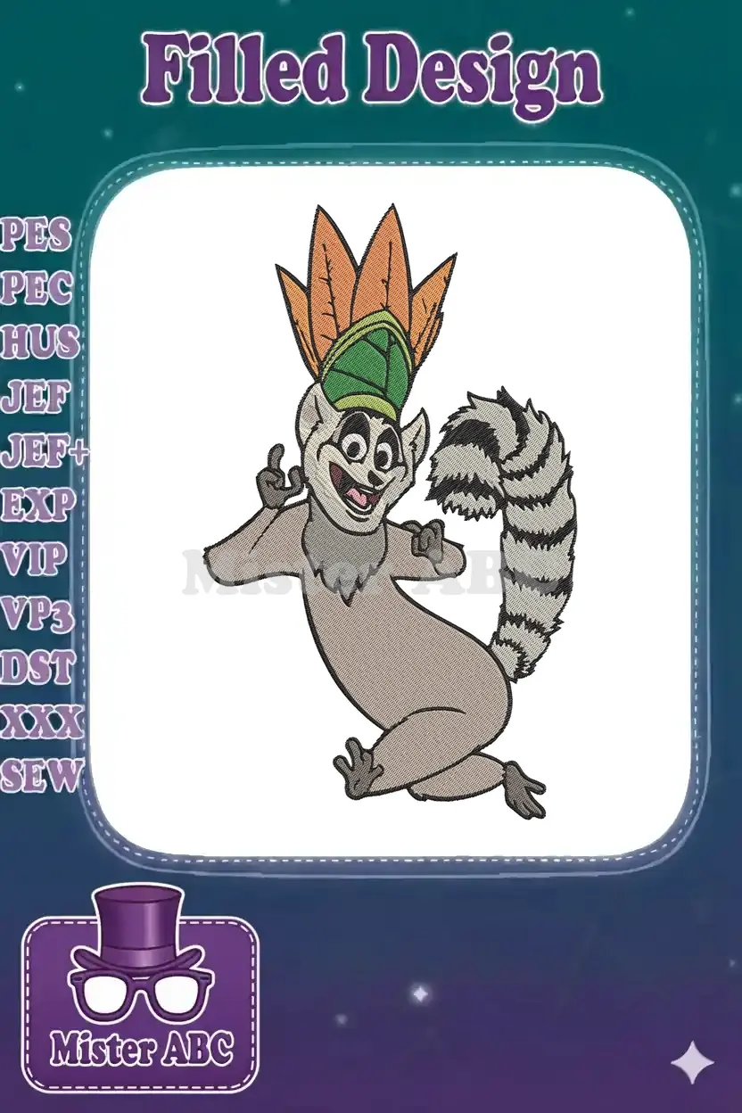 Dynamic King Julien embroidery design, bringing the iconic lemur to life with vibrant stitches and playful charm.