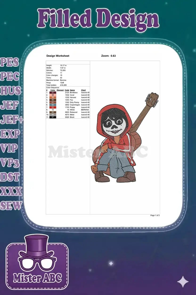 Day of the Dead Coco Miguel guitar player embroidery designs