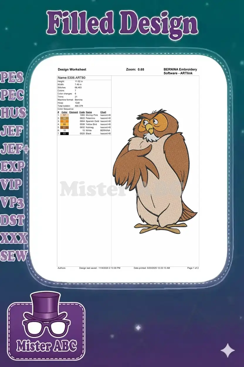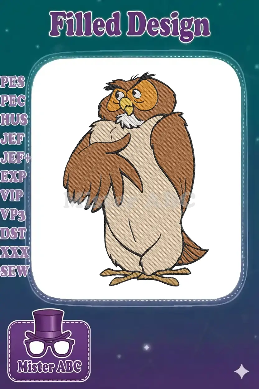 Charming Professor Owl embroidery design, perfect for adding a touch of classic animation wisdom to any project. High-quality stitching.