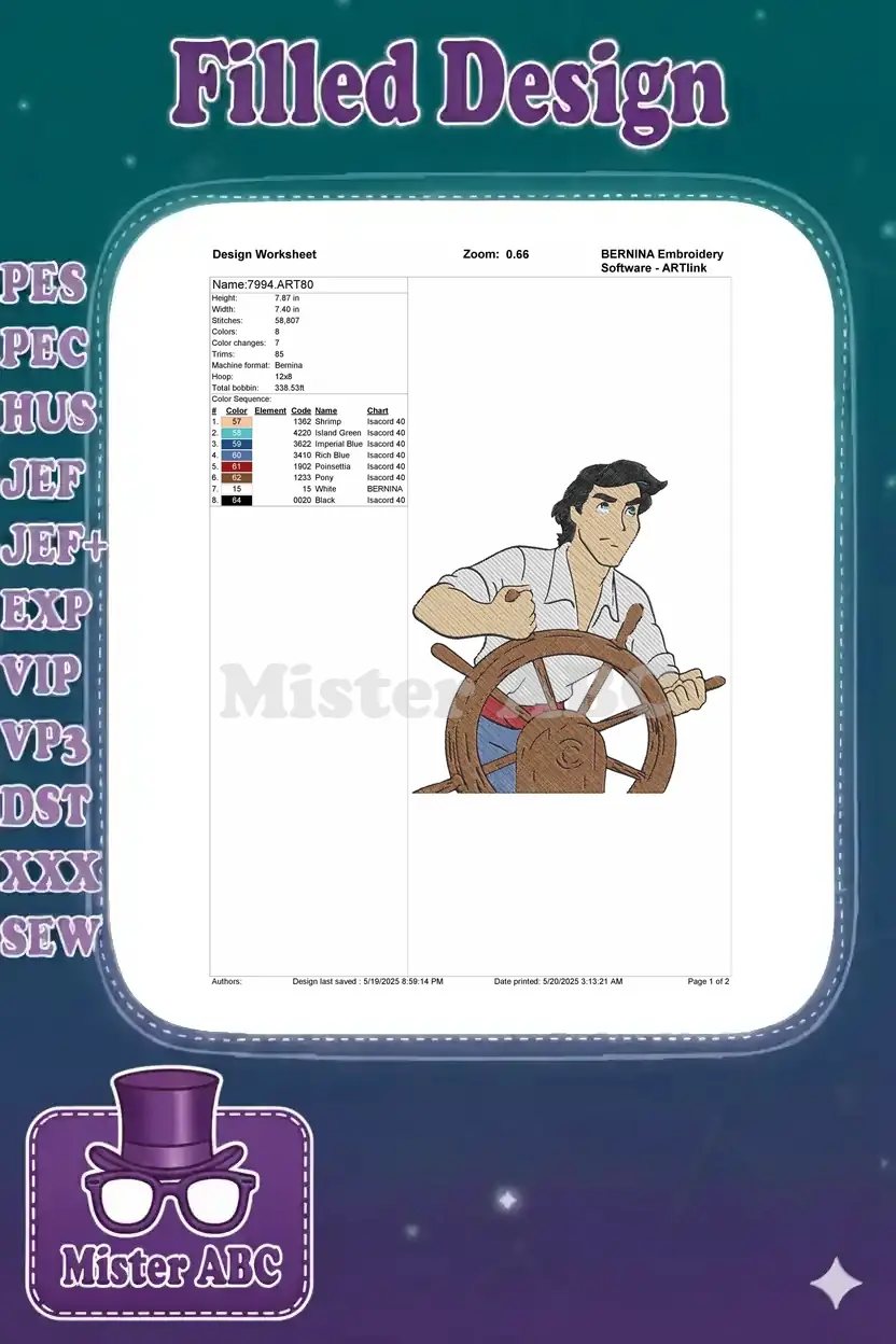 Determined Prince Eric steering ship wheel nautical adventure embroidery designs