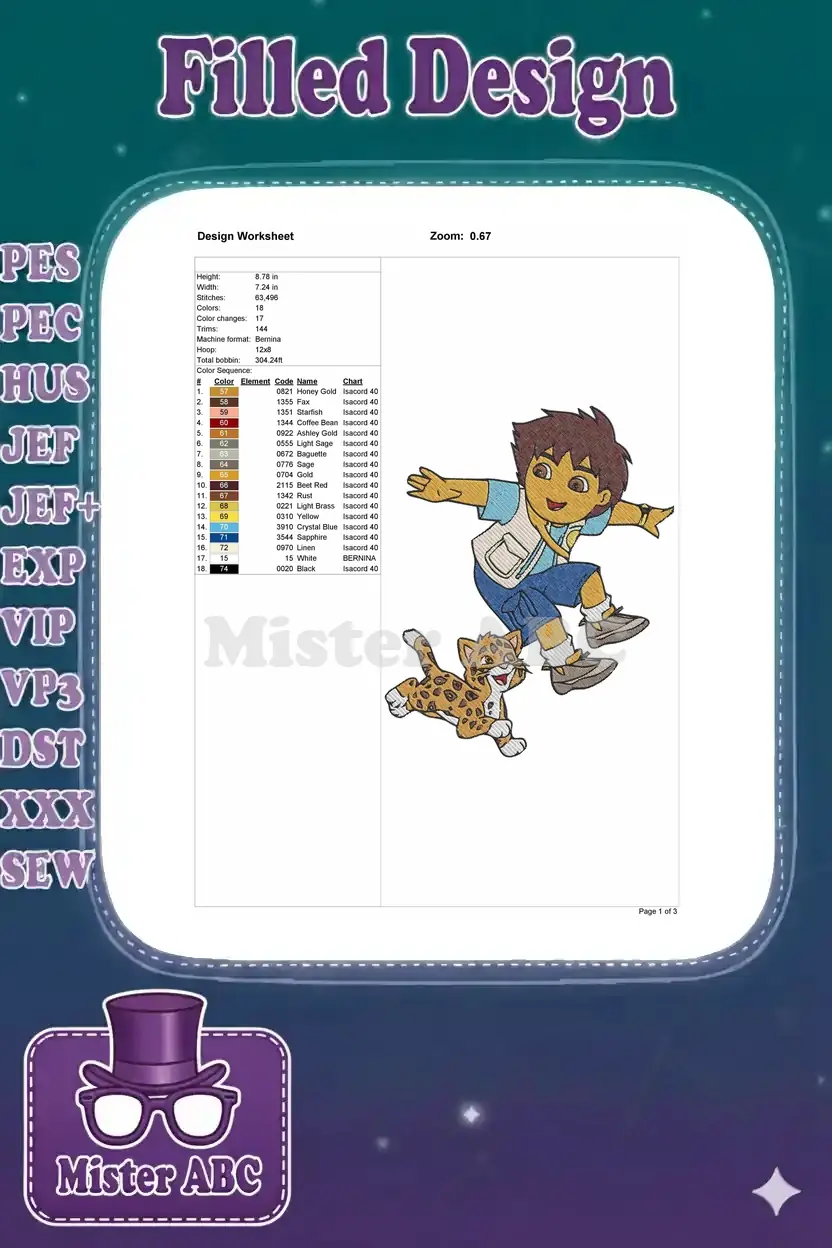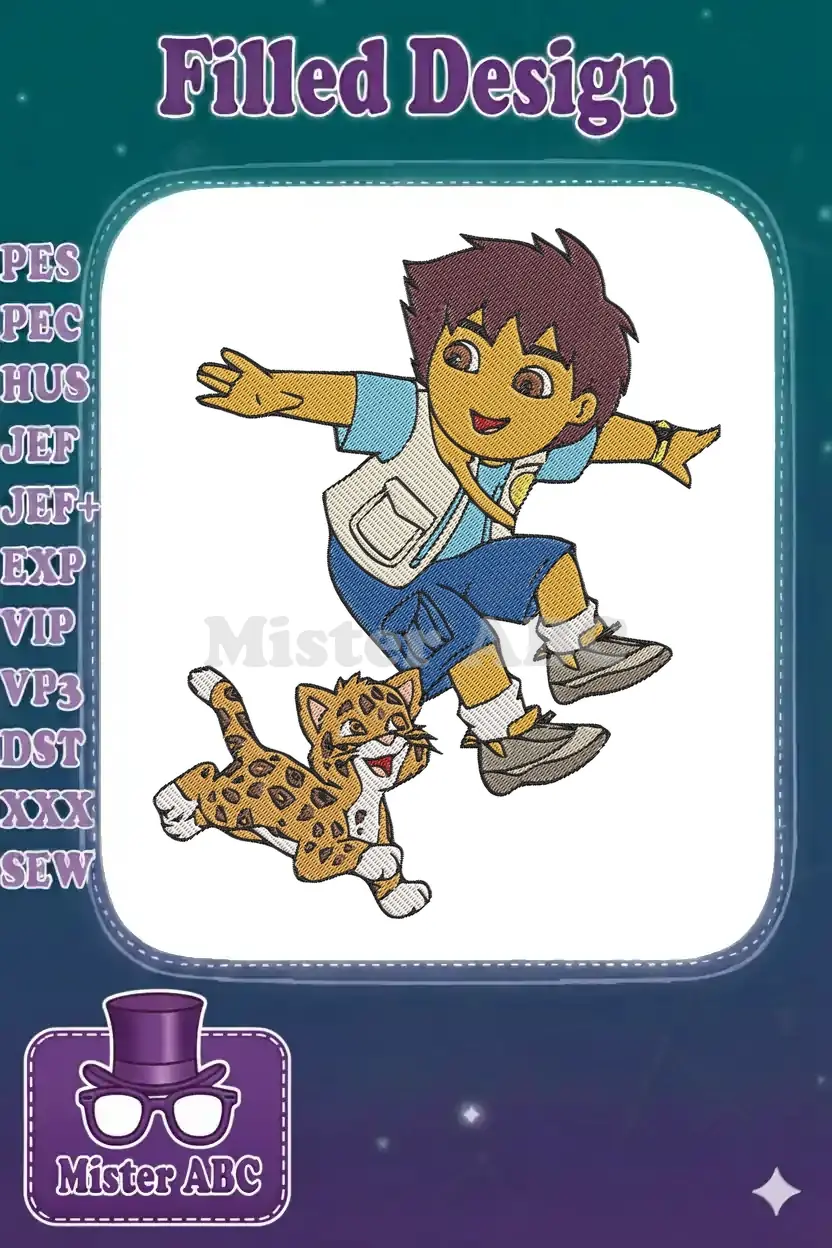 Diego and Baby Jaguar Jumping Adventure Cartoon Embroidery Designs