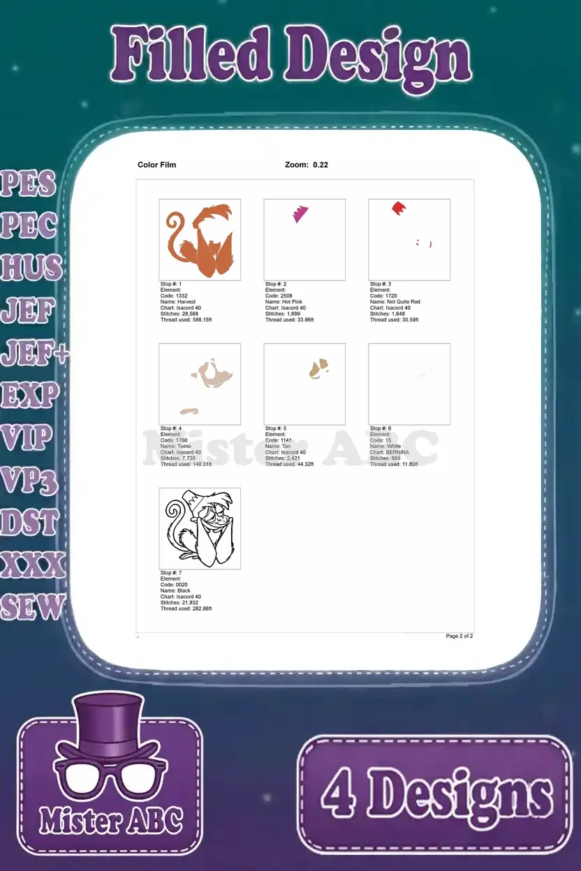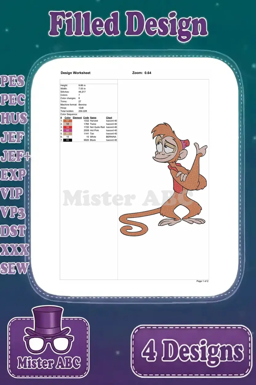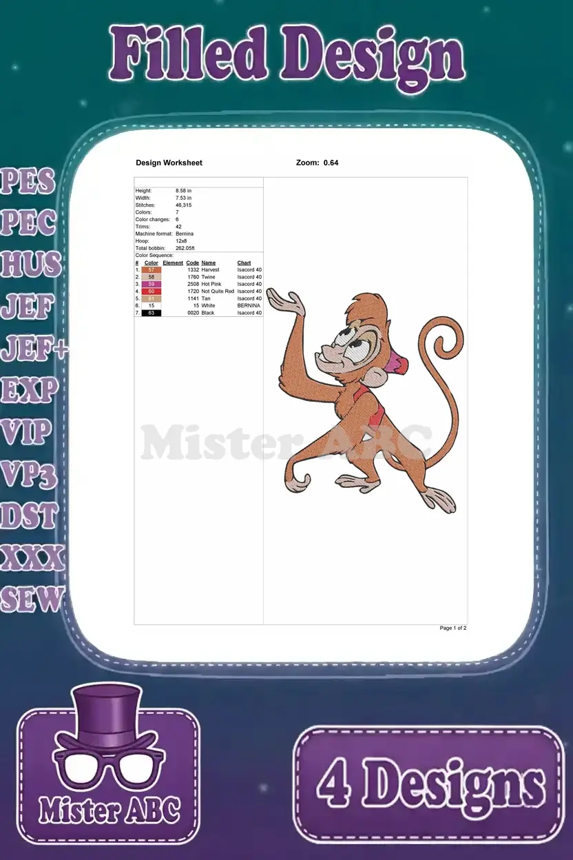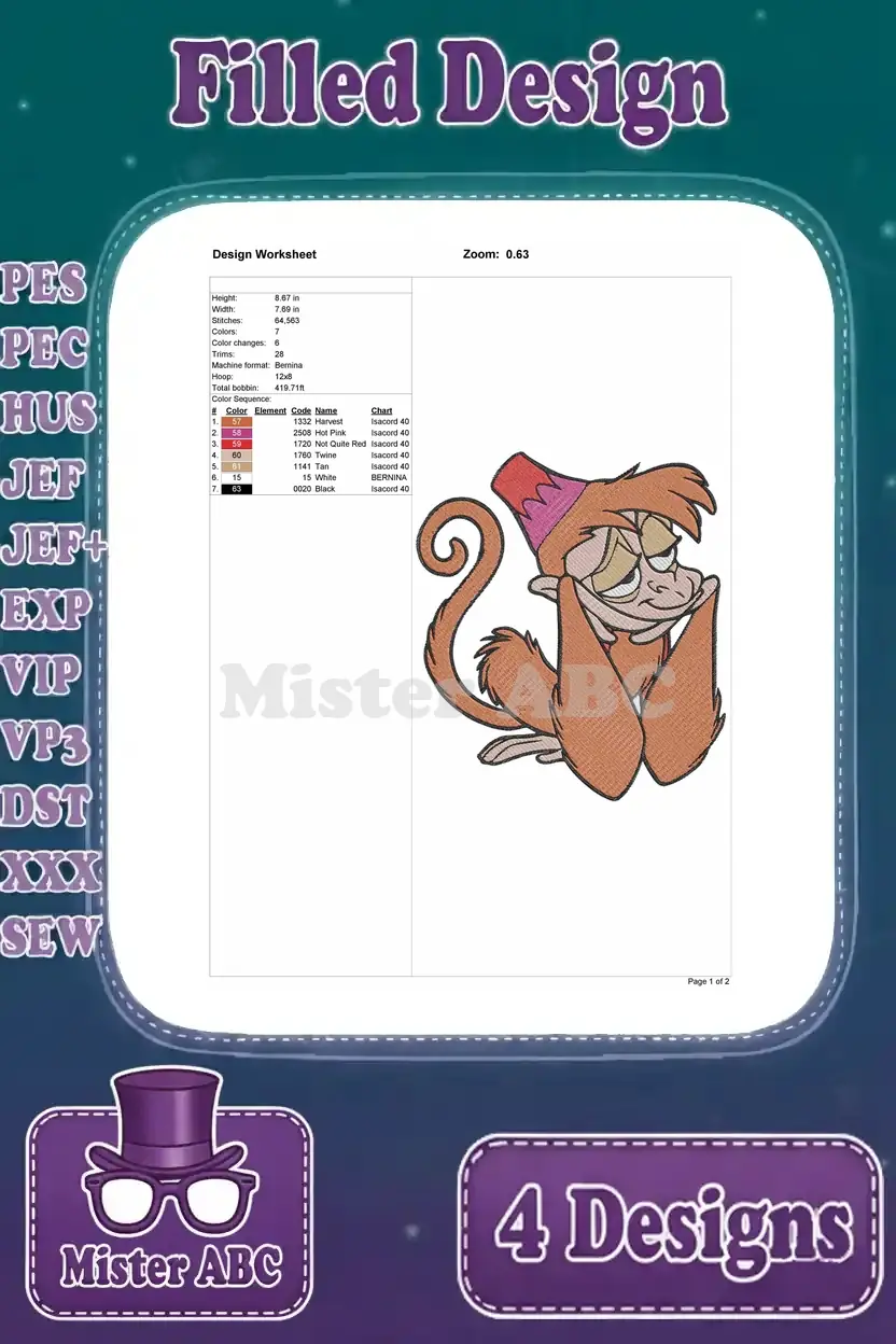 Disney Aladdin Abu Monkey Expressive Poses Thinking Happy Surprised Character Designs – Filled Embroidery Design