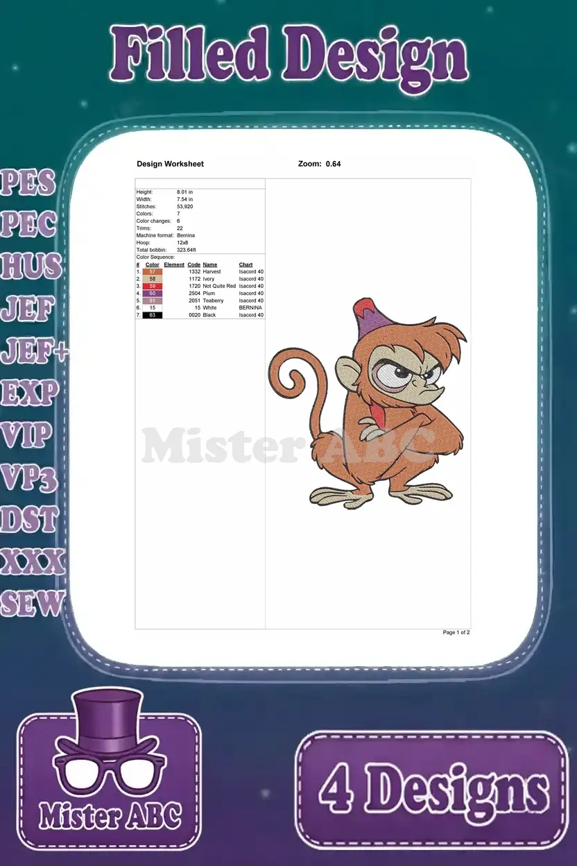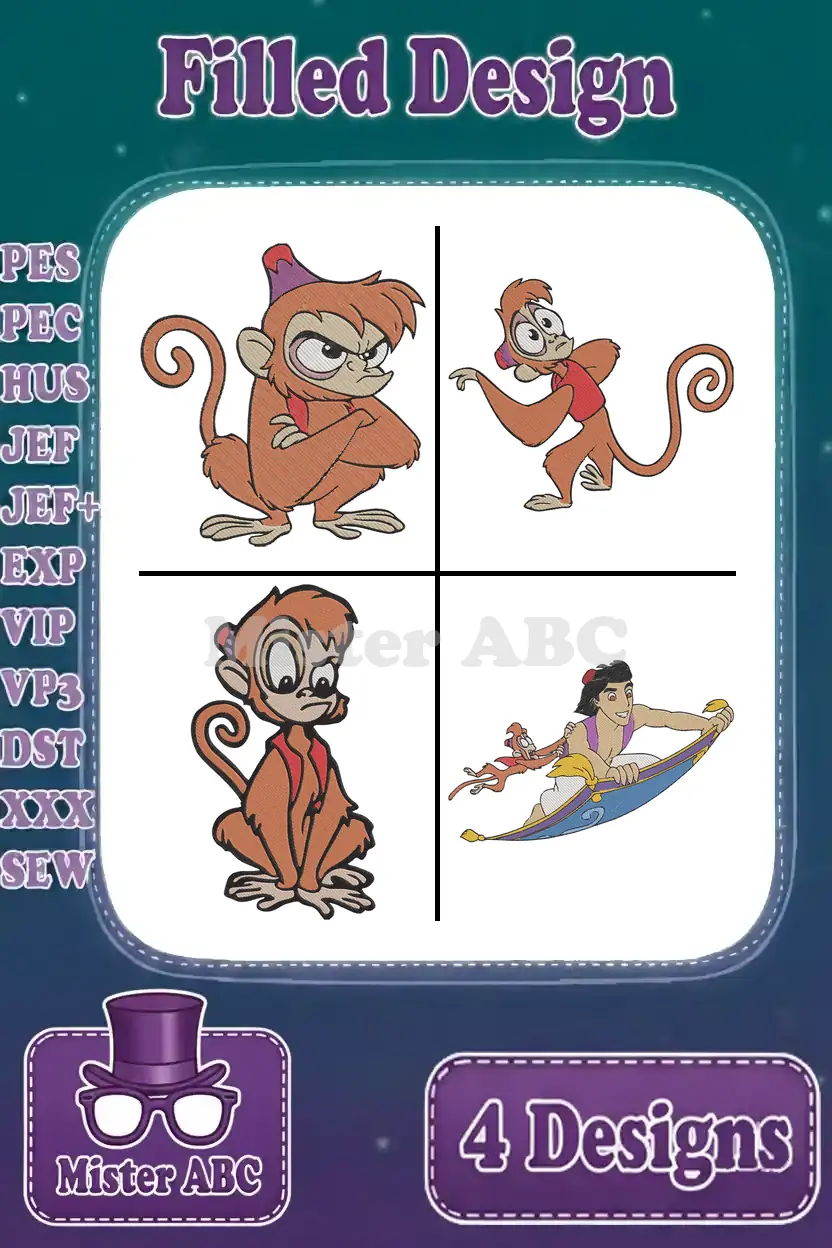 Disney Aladdin Abu Monkey Cute Poses Aladdin On Magic Carpet Flying Adventure – Filled Embroidery Design