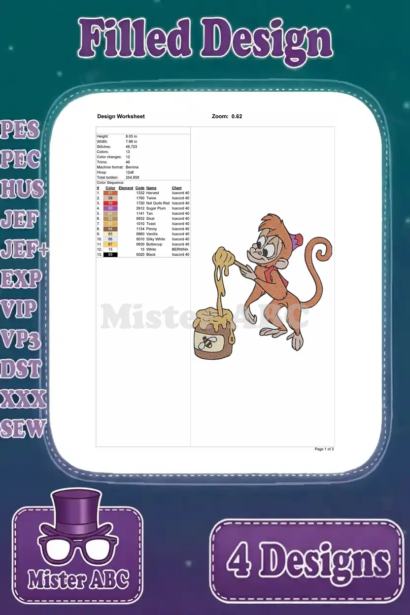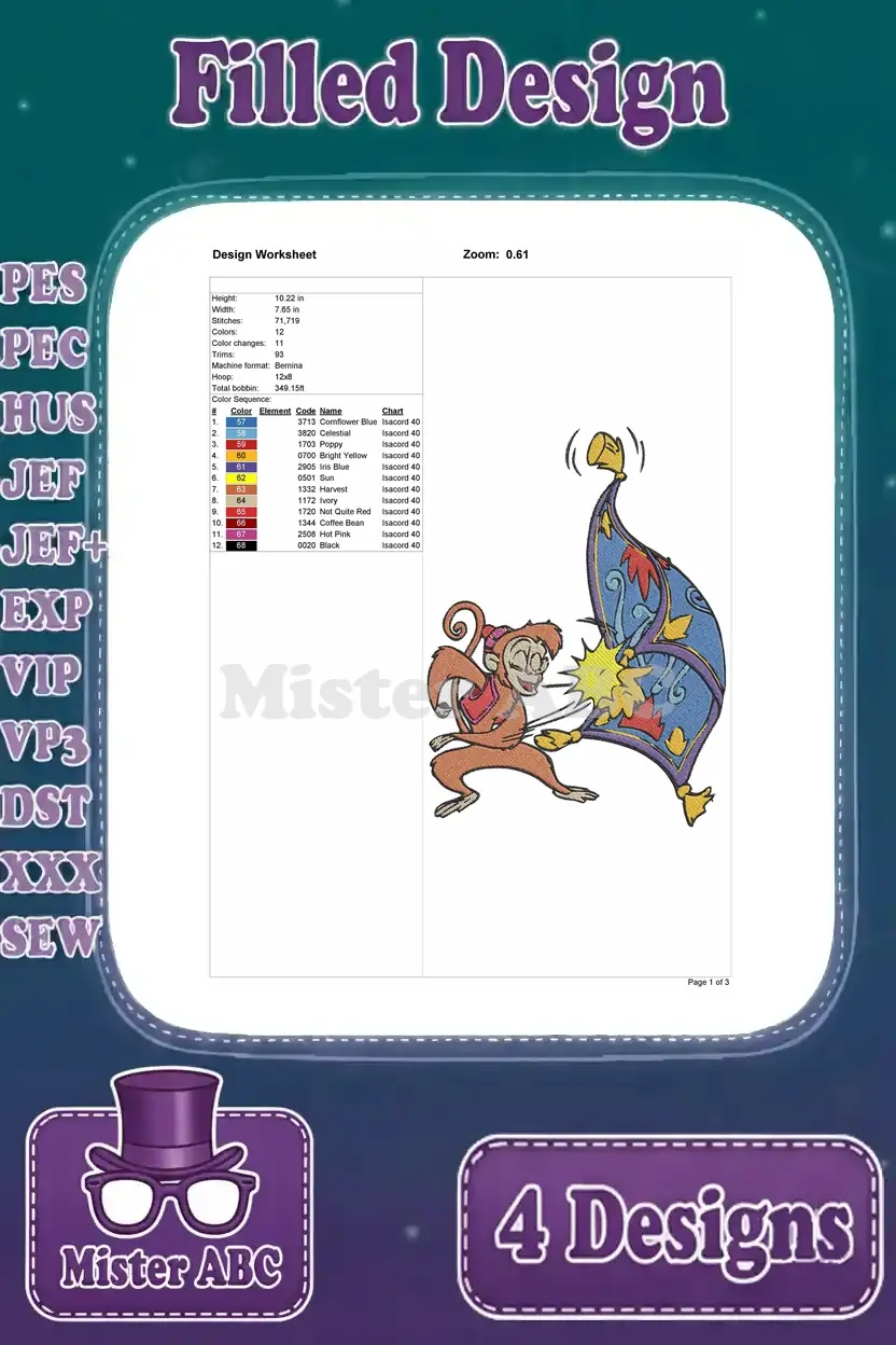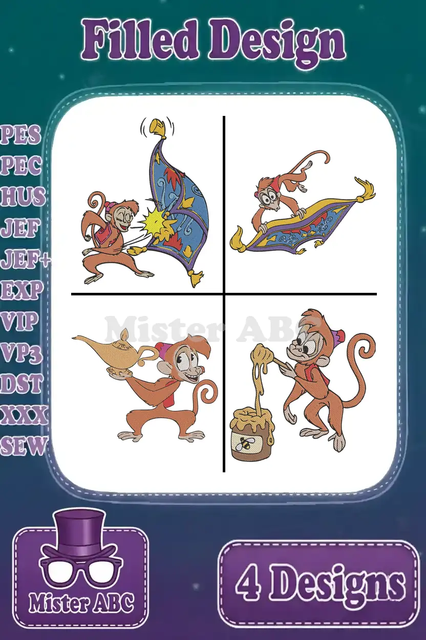 Disney Aladdin Abu Monkey Magic Carpet Ride Sorcerer Jafar Staff Honey Pot – Filled Embroidery Design