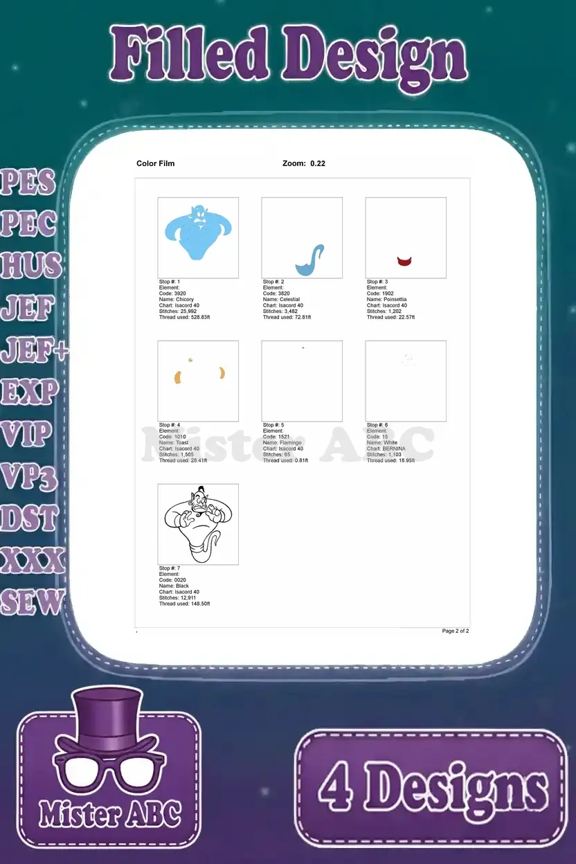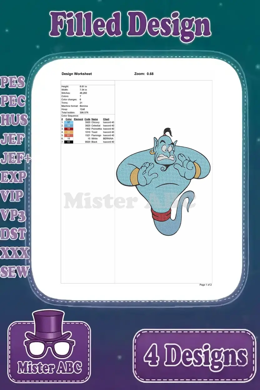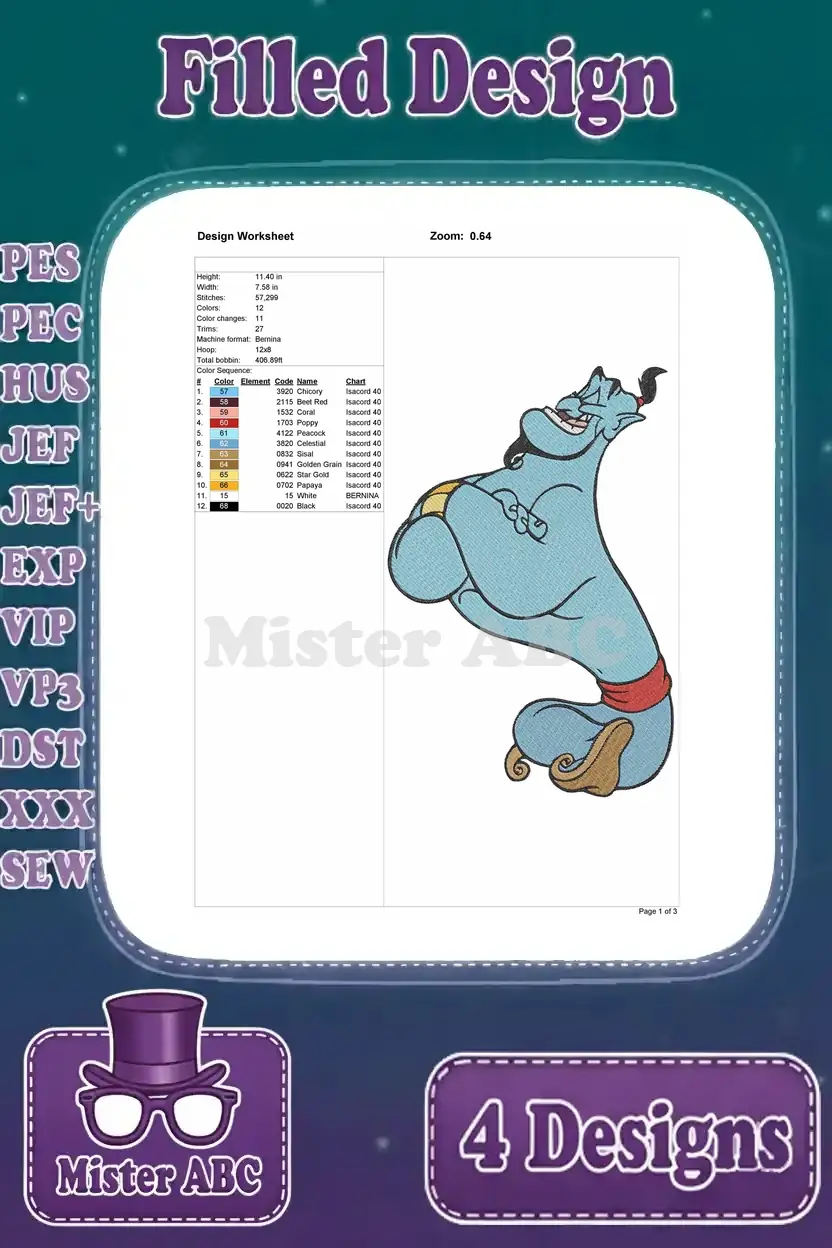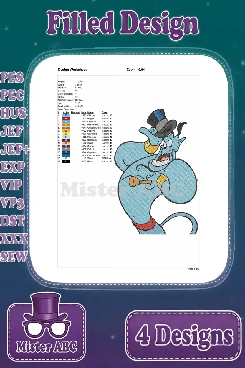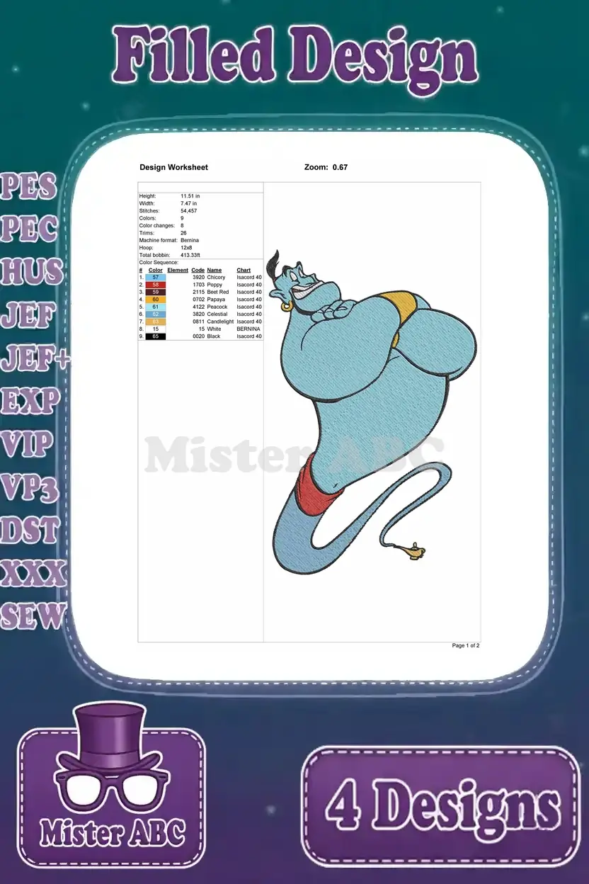 Disney Aladdin Genie Classic Poses Thumbs Up Flight Top Hat Magical Being Bundle – Filled Embroidery Design