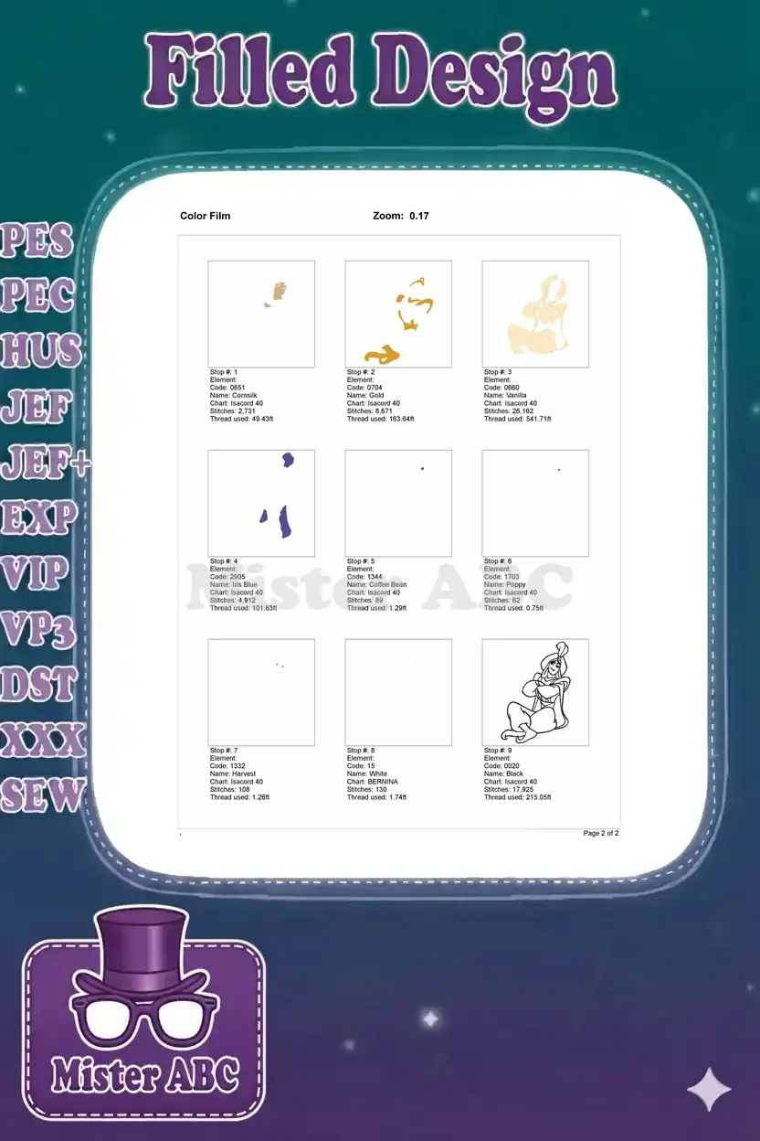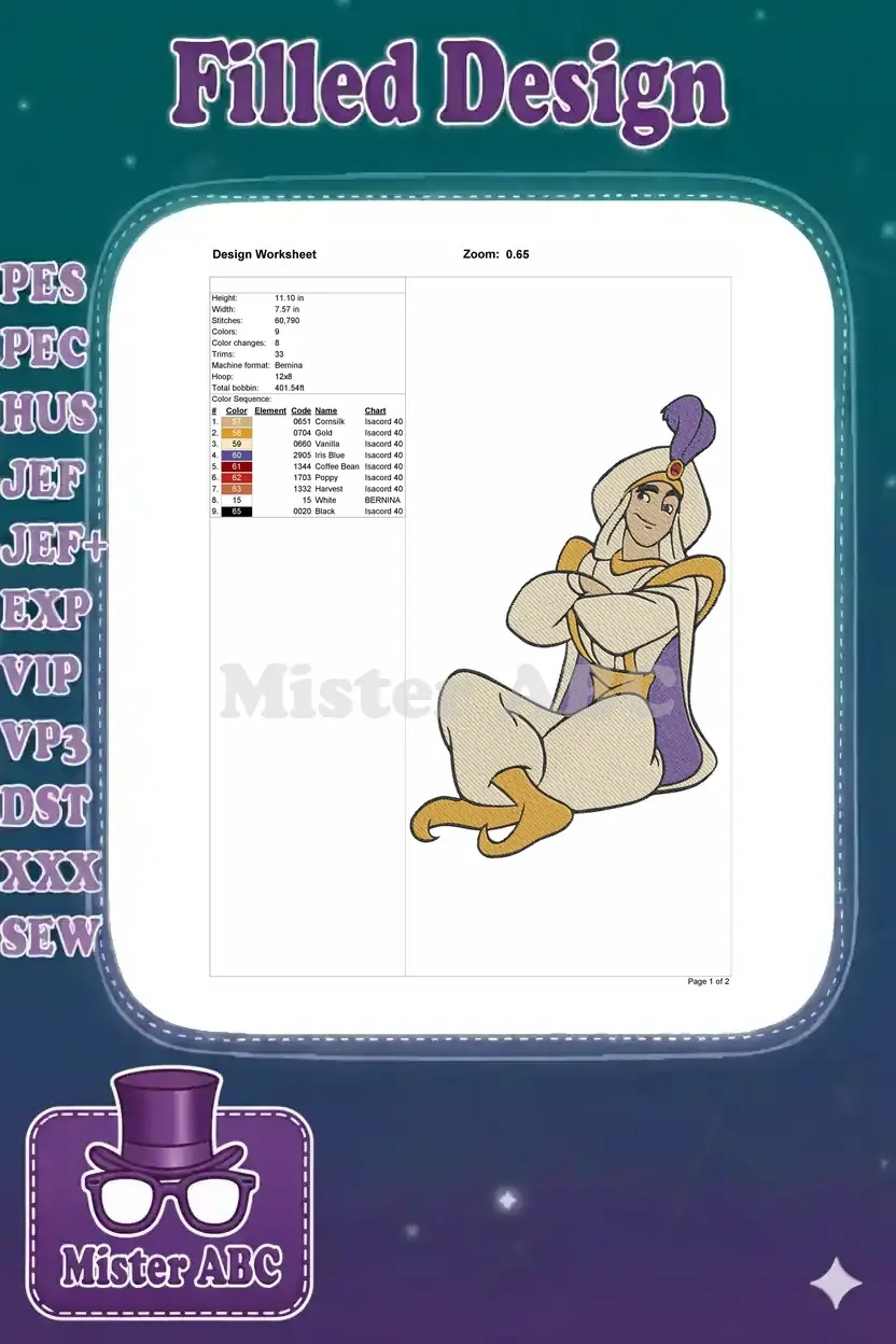 Bring the magic of Agrabah to life with this detailed Aladdin embroidery design. Perfect for fans of classic animated tales.