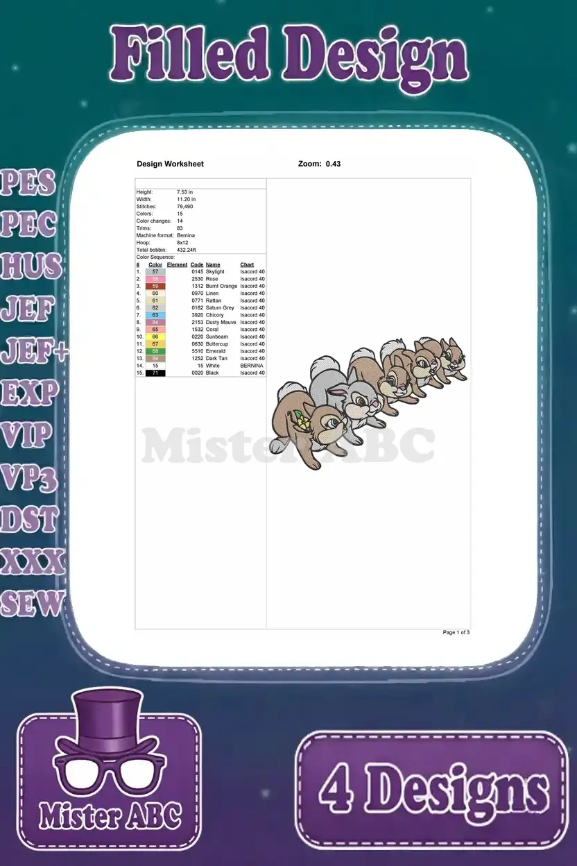 Delightful Thumper & sisters filled embroidery designs! Perfect for adding a touch of Disney charm to any project. This bundle offers four unique, playful scenes.