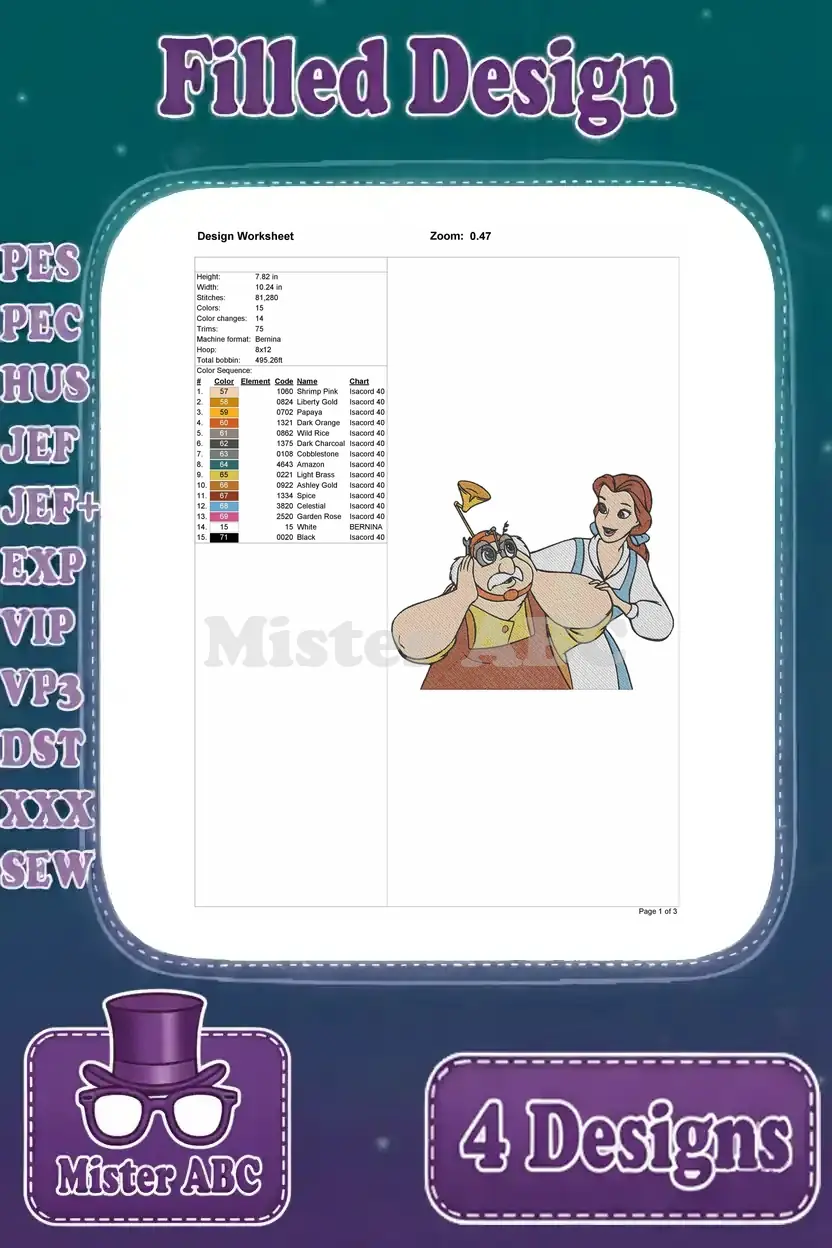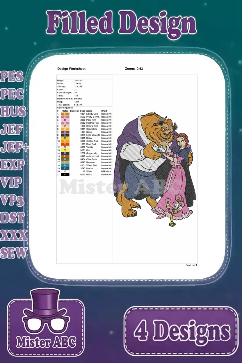 Experience the magic of Beauty and the Beast with this enchanting 4-design embroidery bundle, perfect for fans.