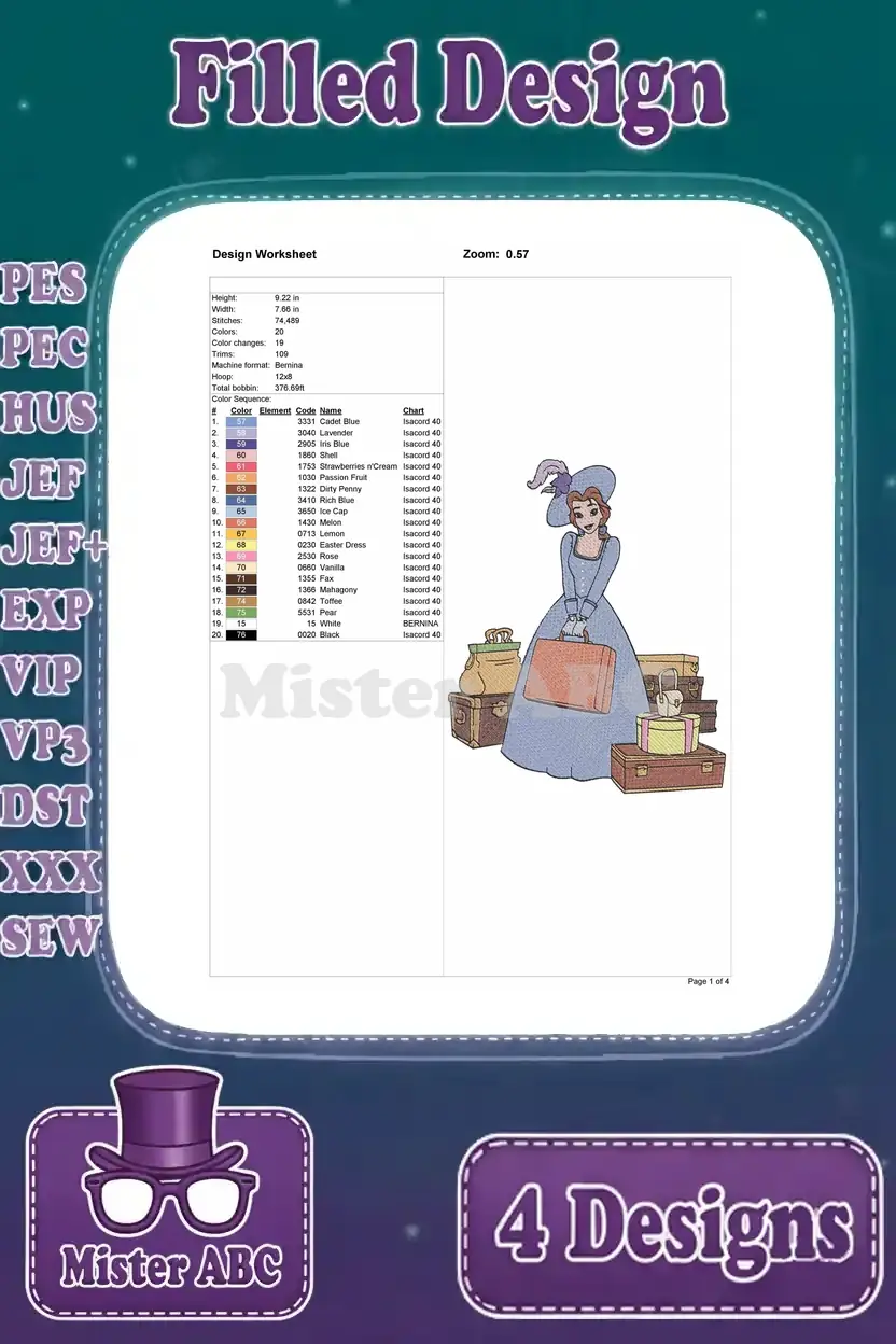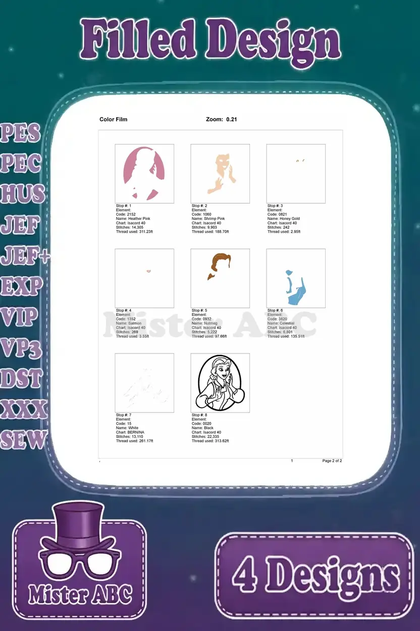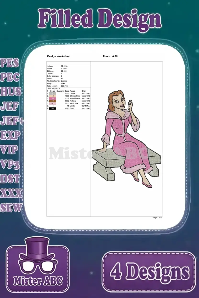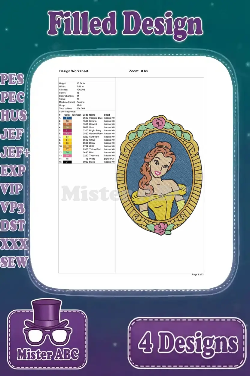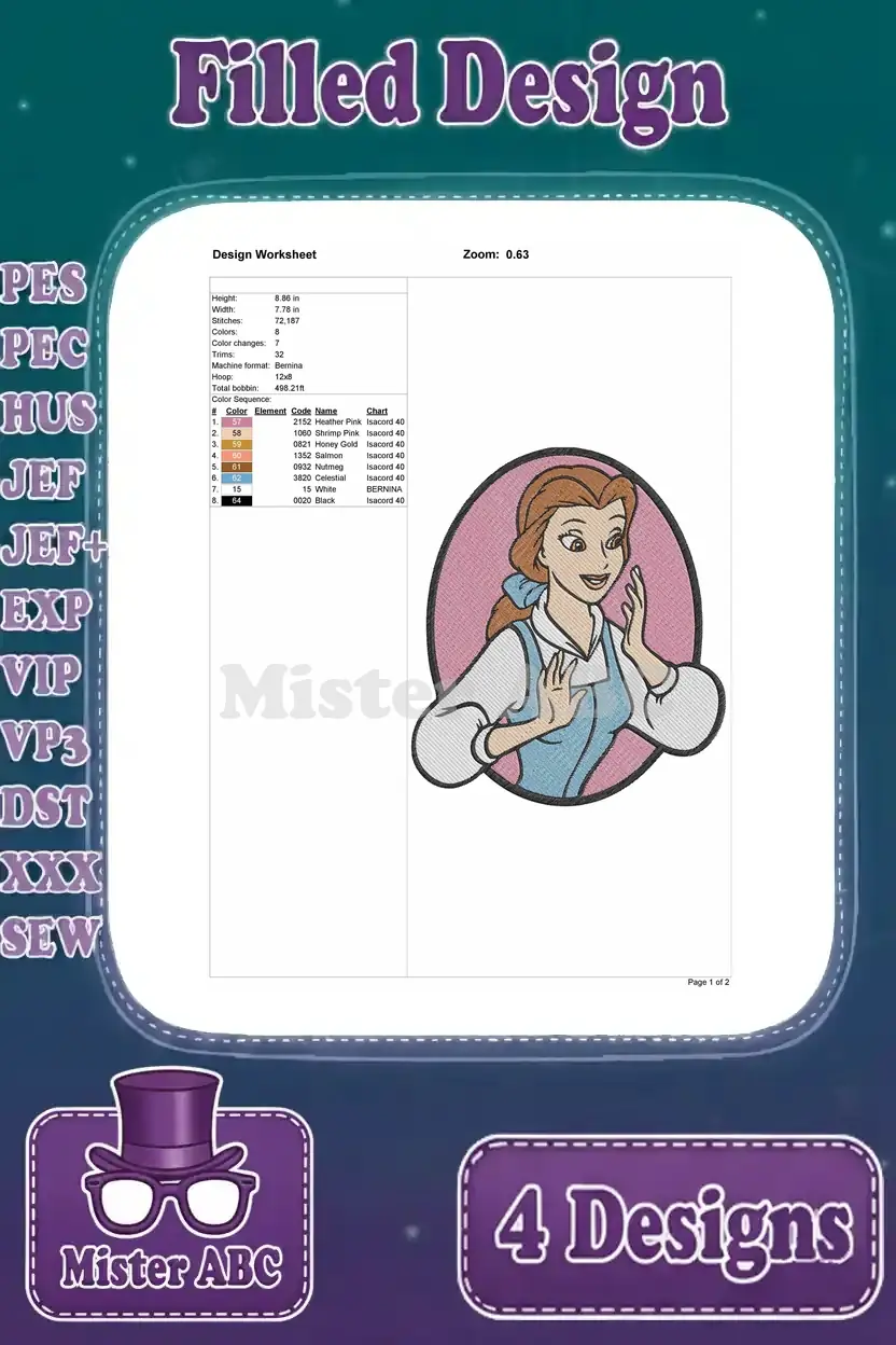 Disney Beauty Beast Belle Village Girl With Books Portrait Frame Close Up Set – Filled Embroidery Design
