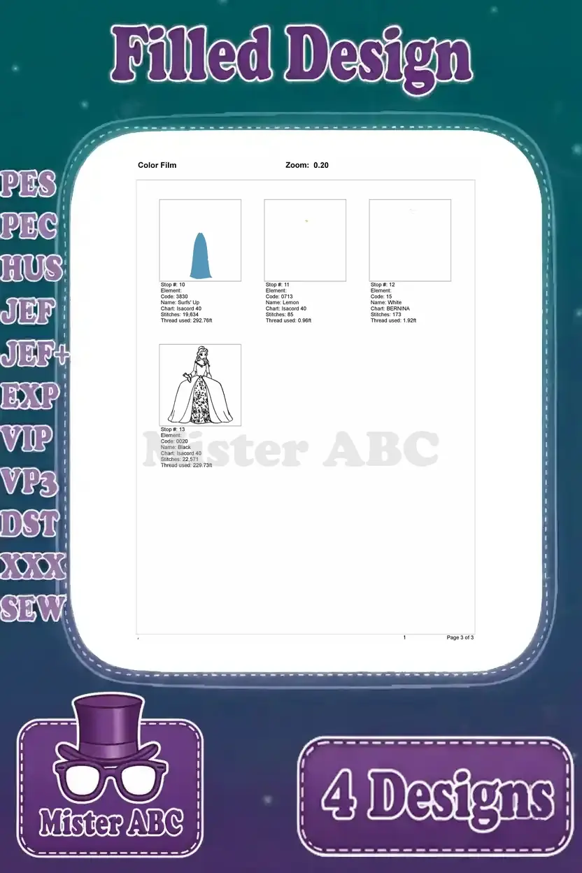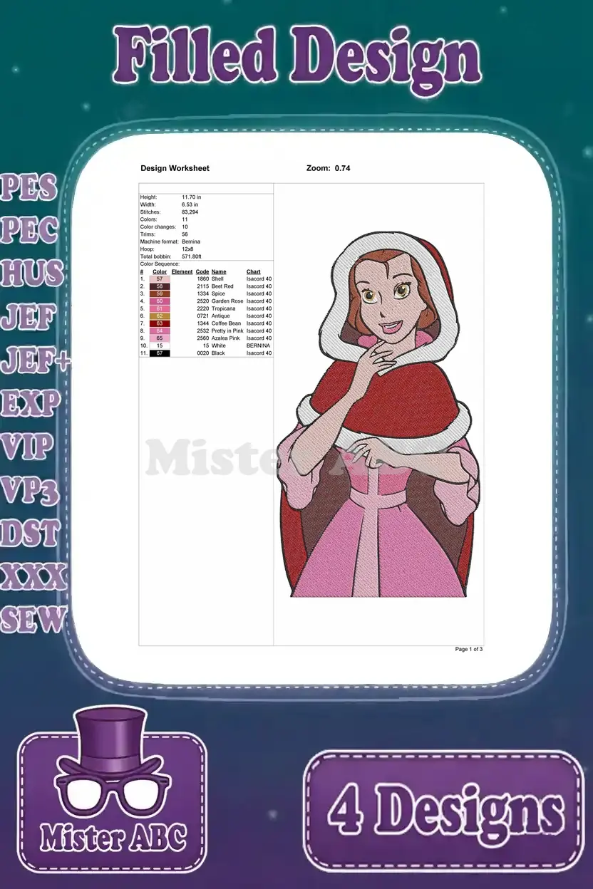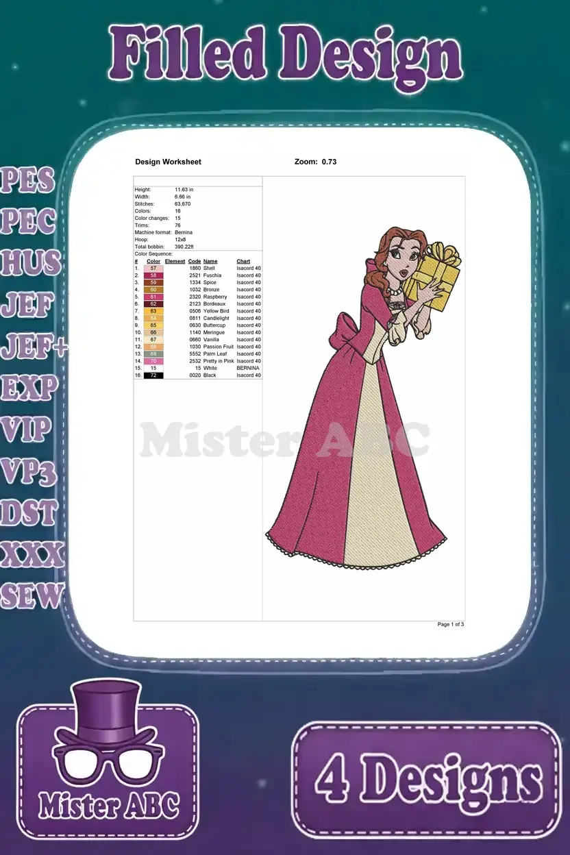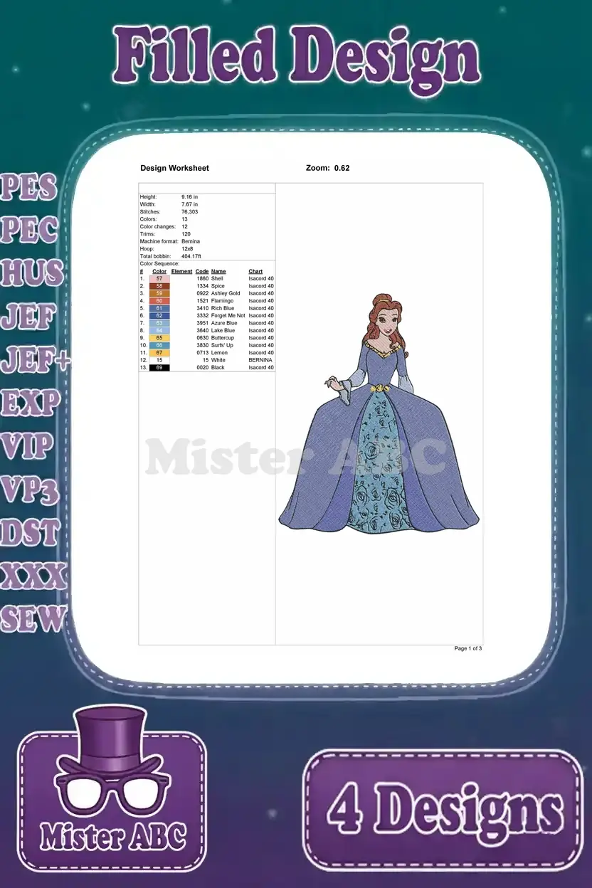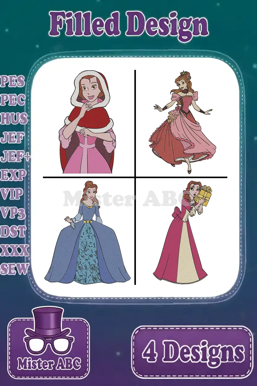 Disney Beauty Beast Belle Yellow Gown Blue Dress With Books Library Scenes – Filled Embroidery Design