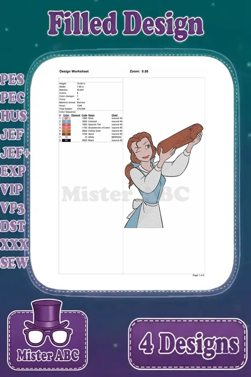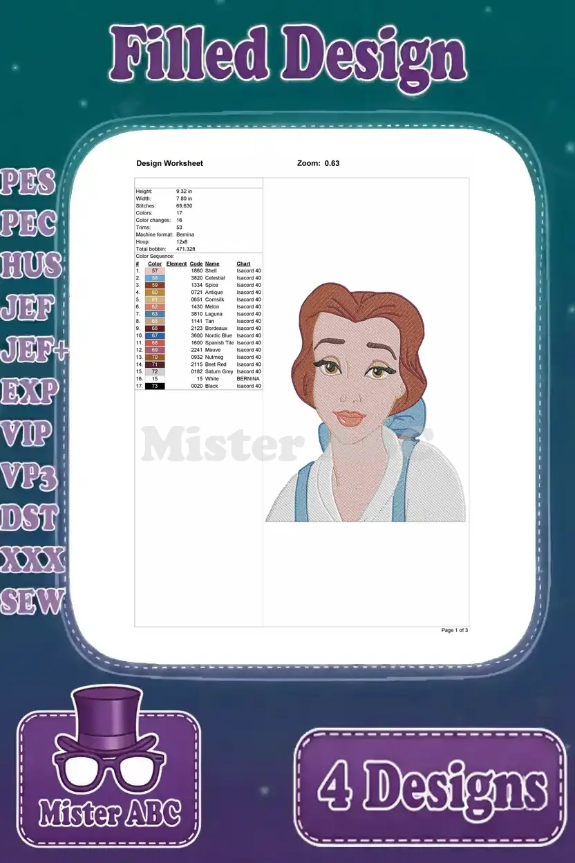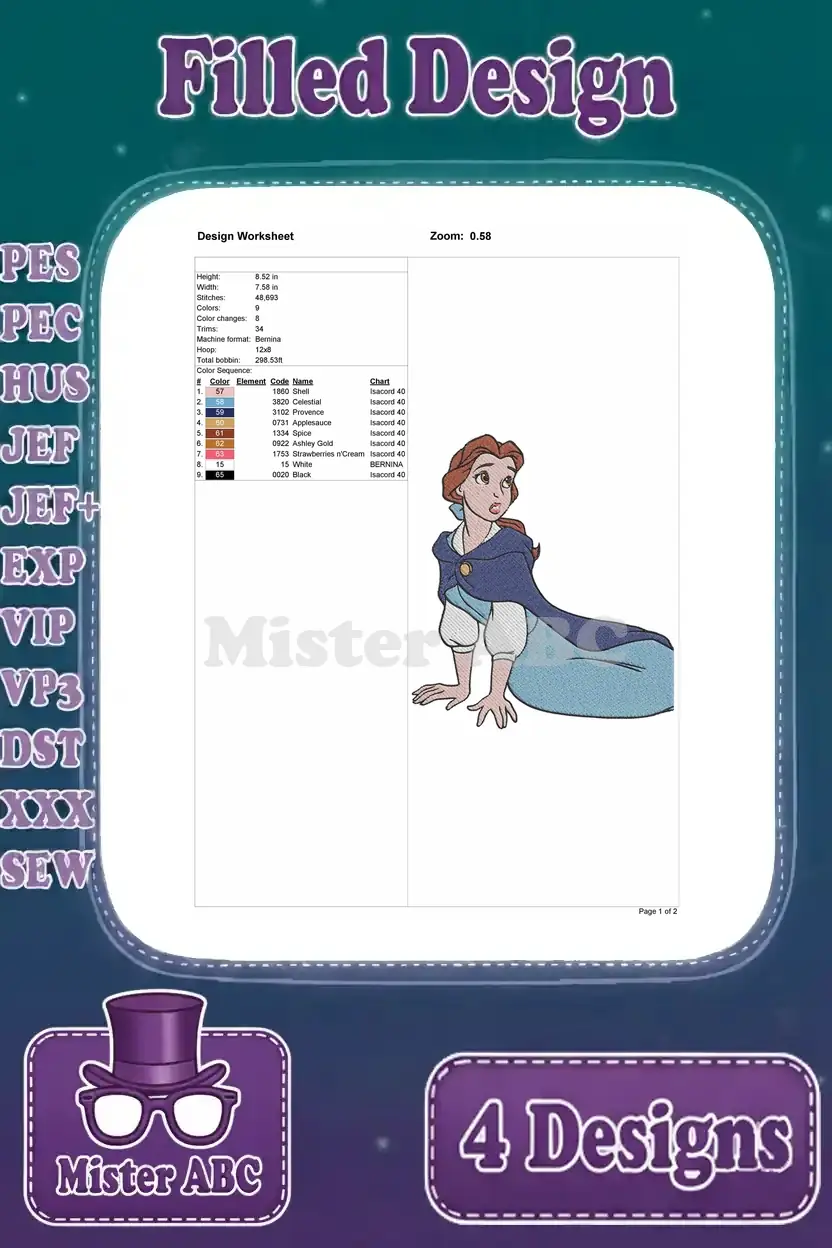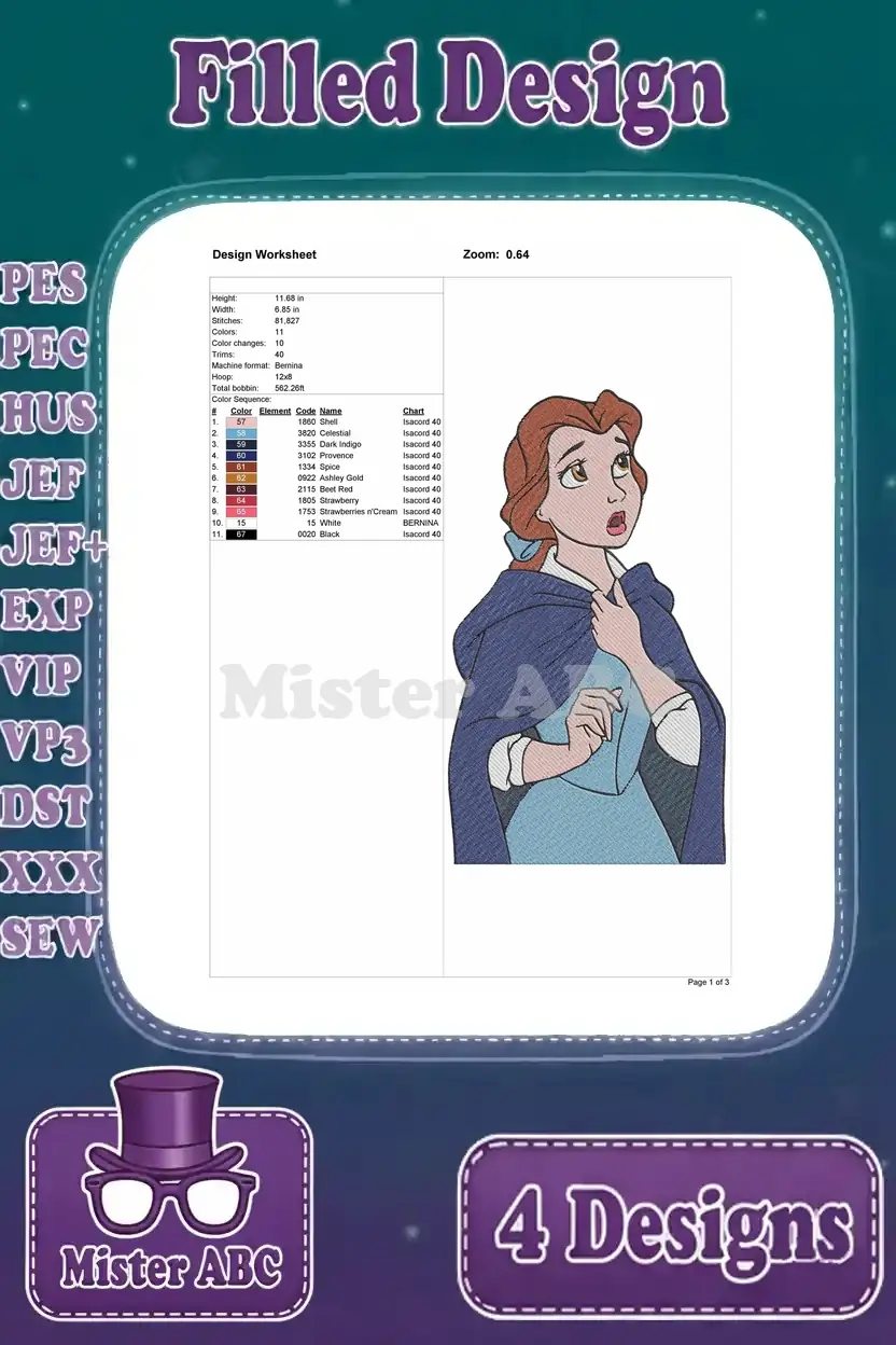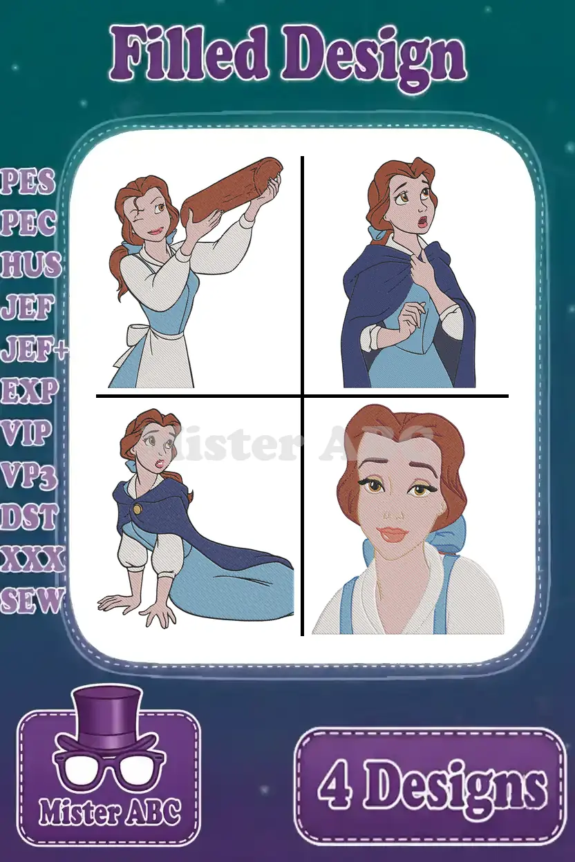 Disney Beauty Beast Belle With Magic Mirror Pink Hooded Cloak Red Ballgown Set – Filled Embroidery Design