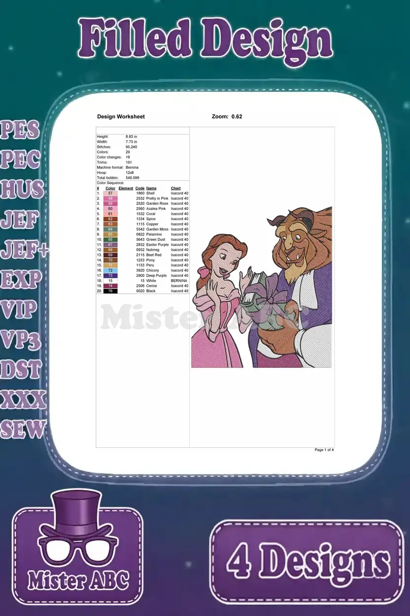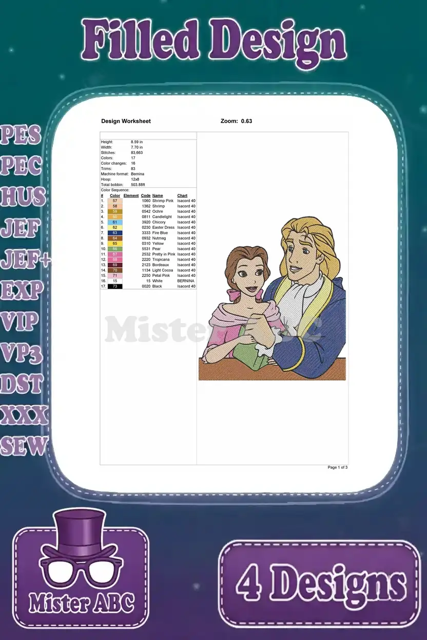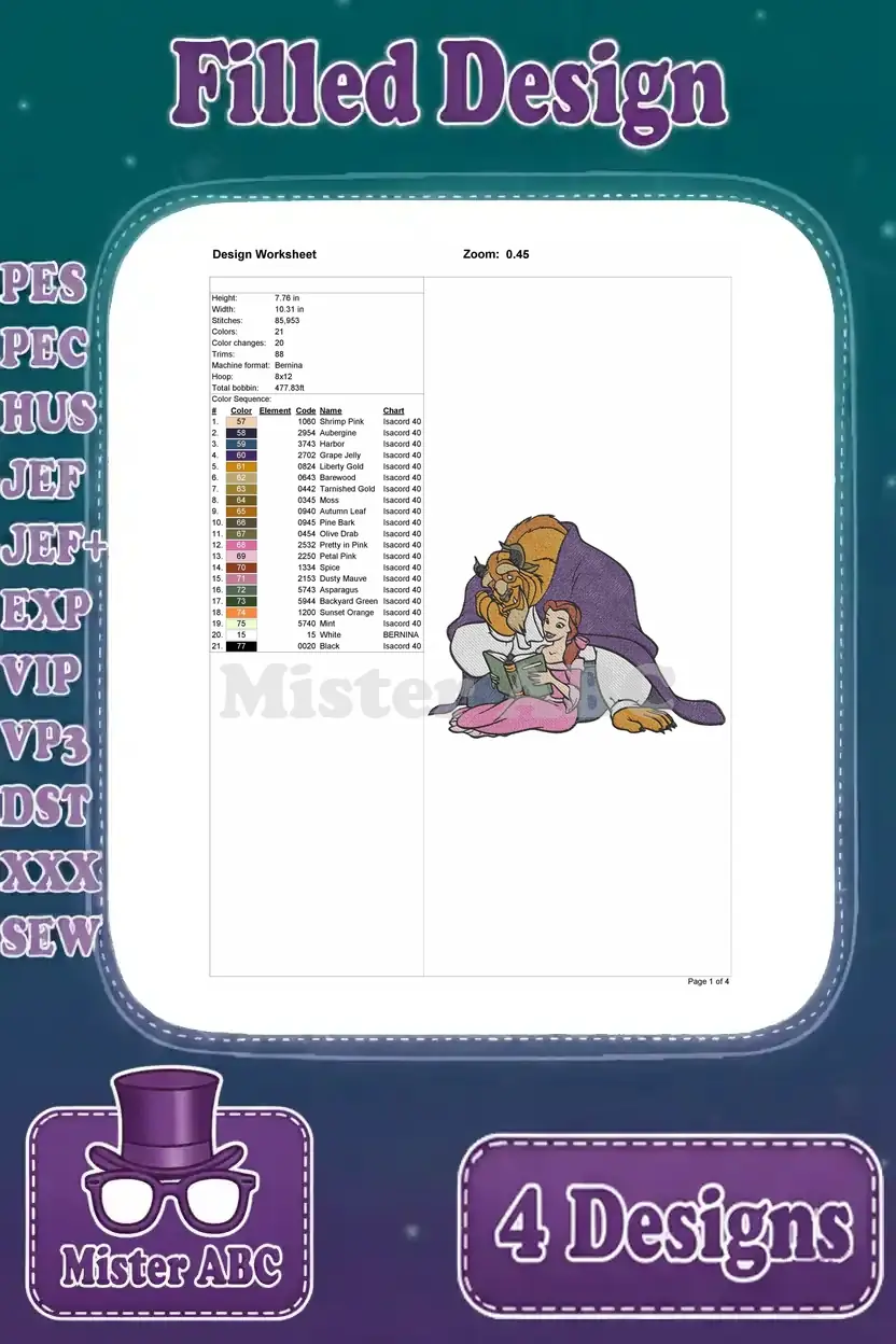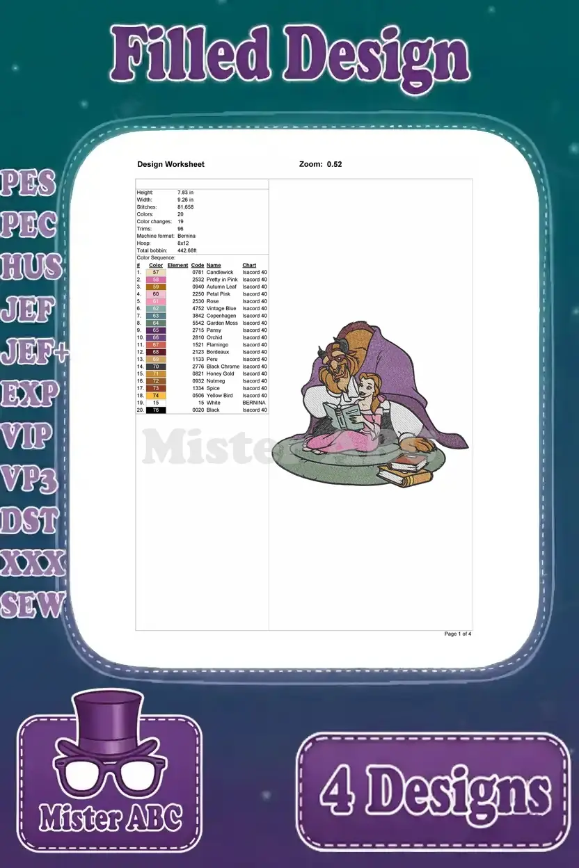 Disney Beauty Beast Belle Beast Reading Book Prince Adam Shared Moments – Filled Embroidery Design