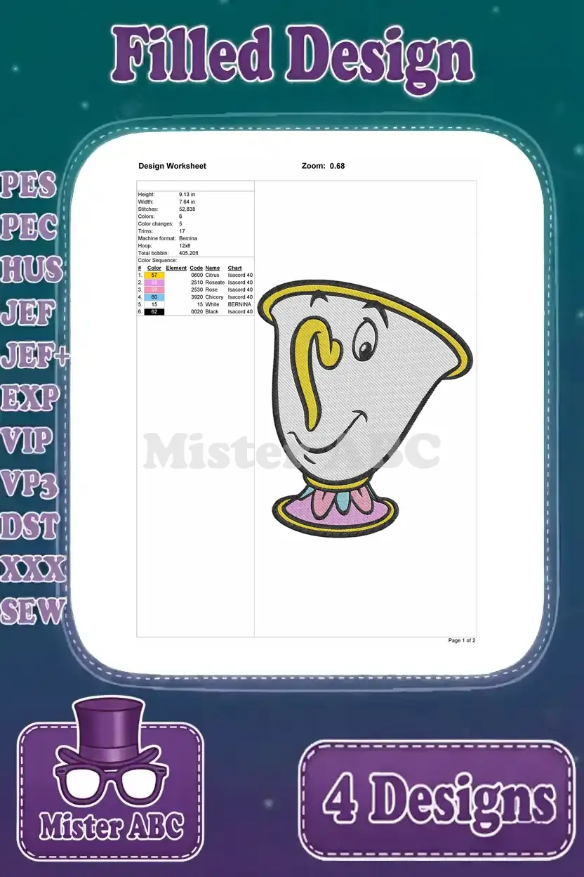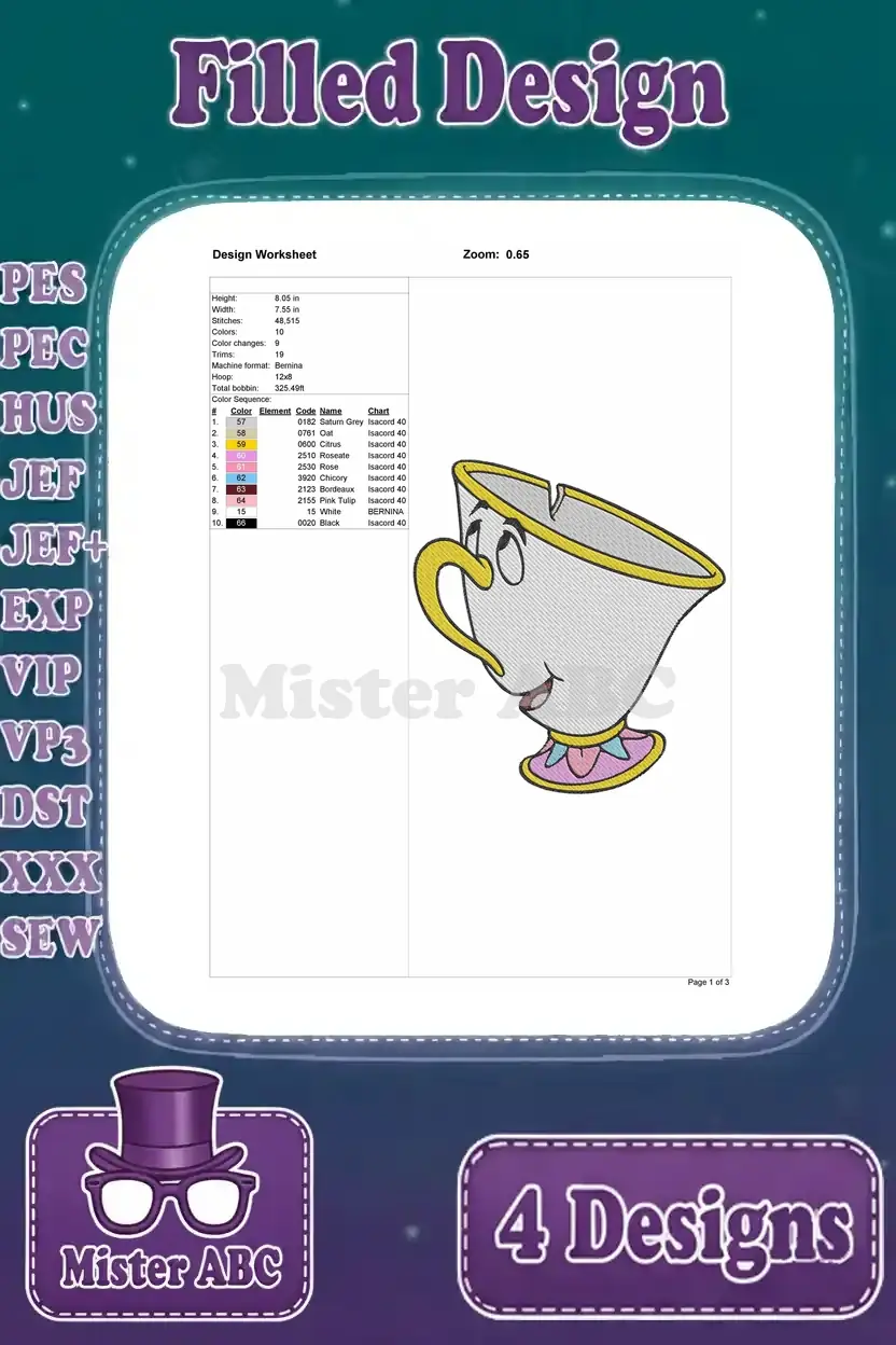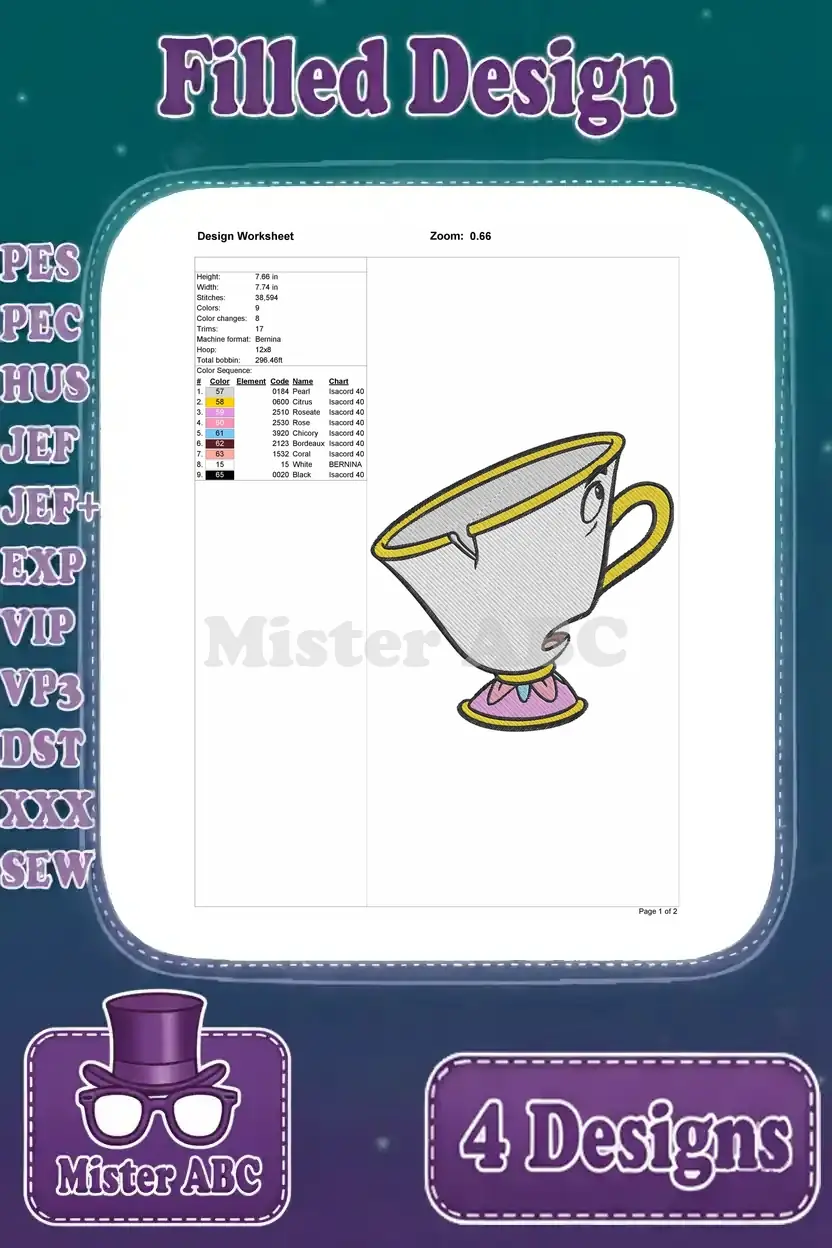 Disney Beauty Beast Chip Teacup Various Angles Looking Up Side View Cute Set – Filled Embroidery Design