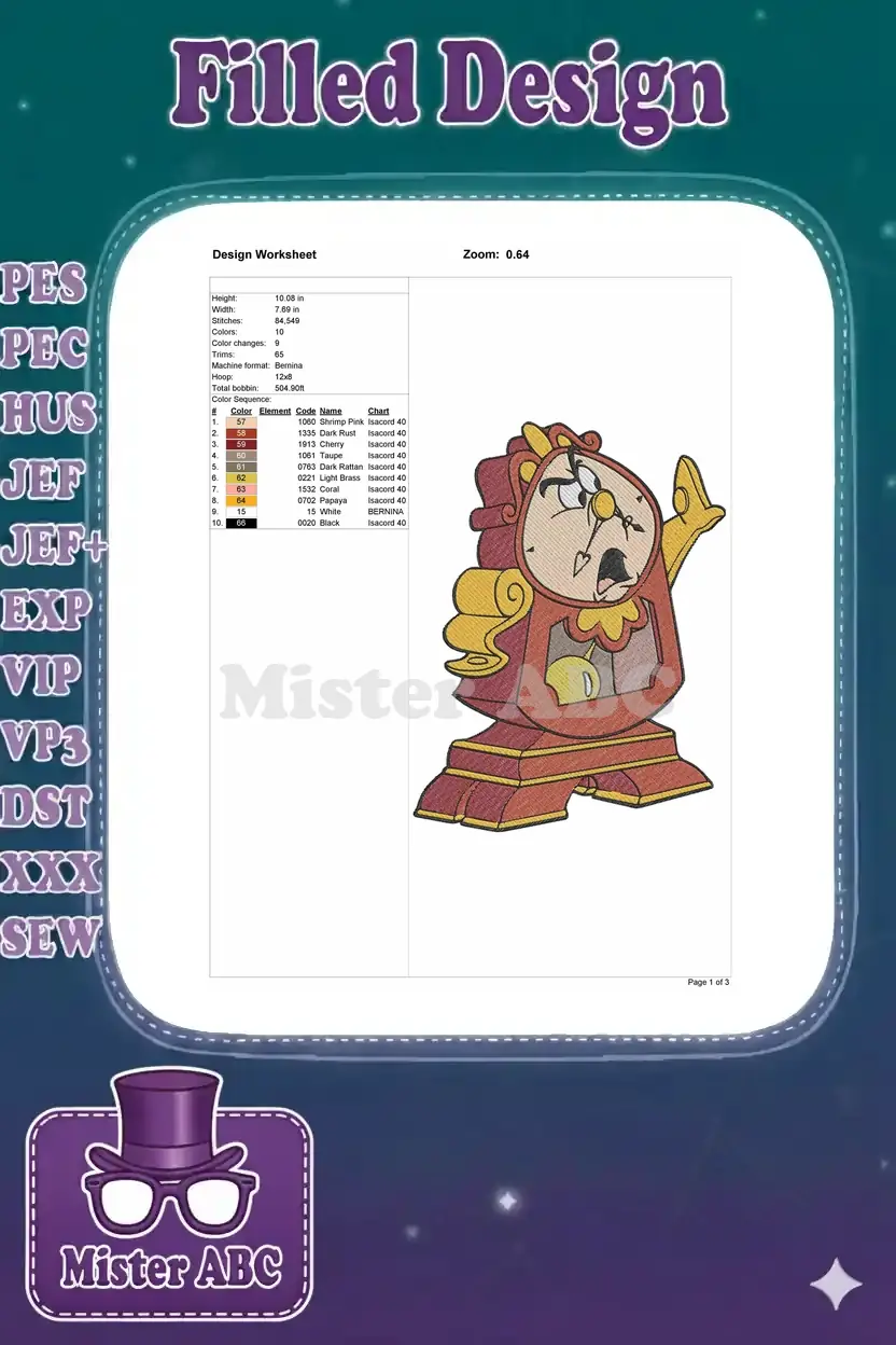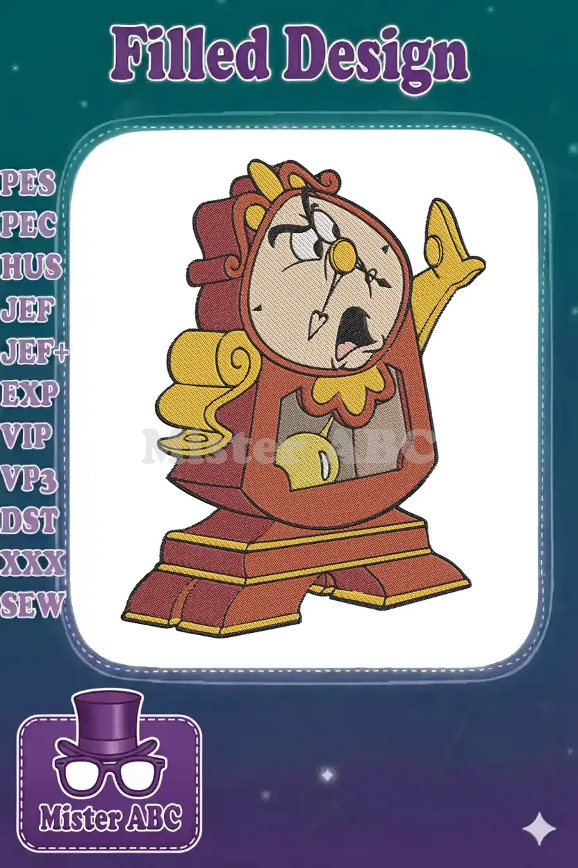 Disney Beauty and the Beast Cogsworth expressive clock embroidery designs