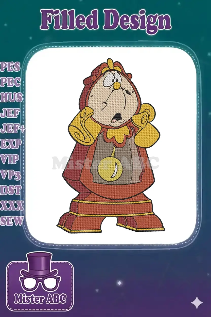 Bring the magic of Disney to life with this detailed Cogsworth embroidery design, perfect for fans of Beauty and the Beast. A charming and iconic character for your next project!