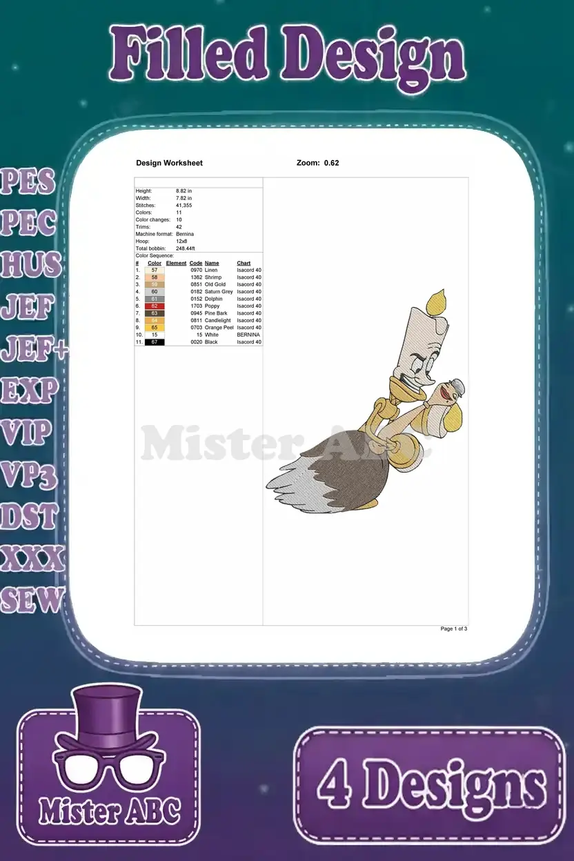 Disney Beauty Beast Lumiere Candelabra Featherduster Fifi Sweeping Dancing – Filled Embroidery Design