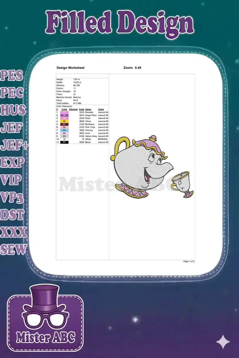 Disney Beauty and the Beast Mrs. Potts Chip Teapot embroidery designs