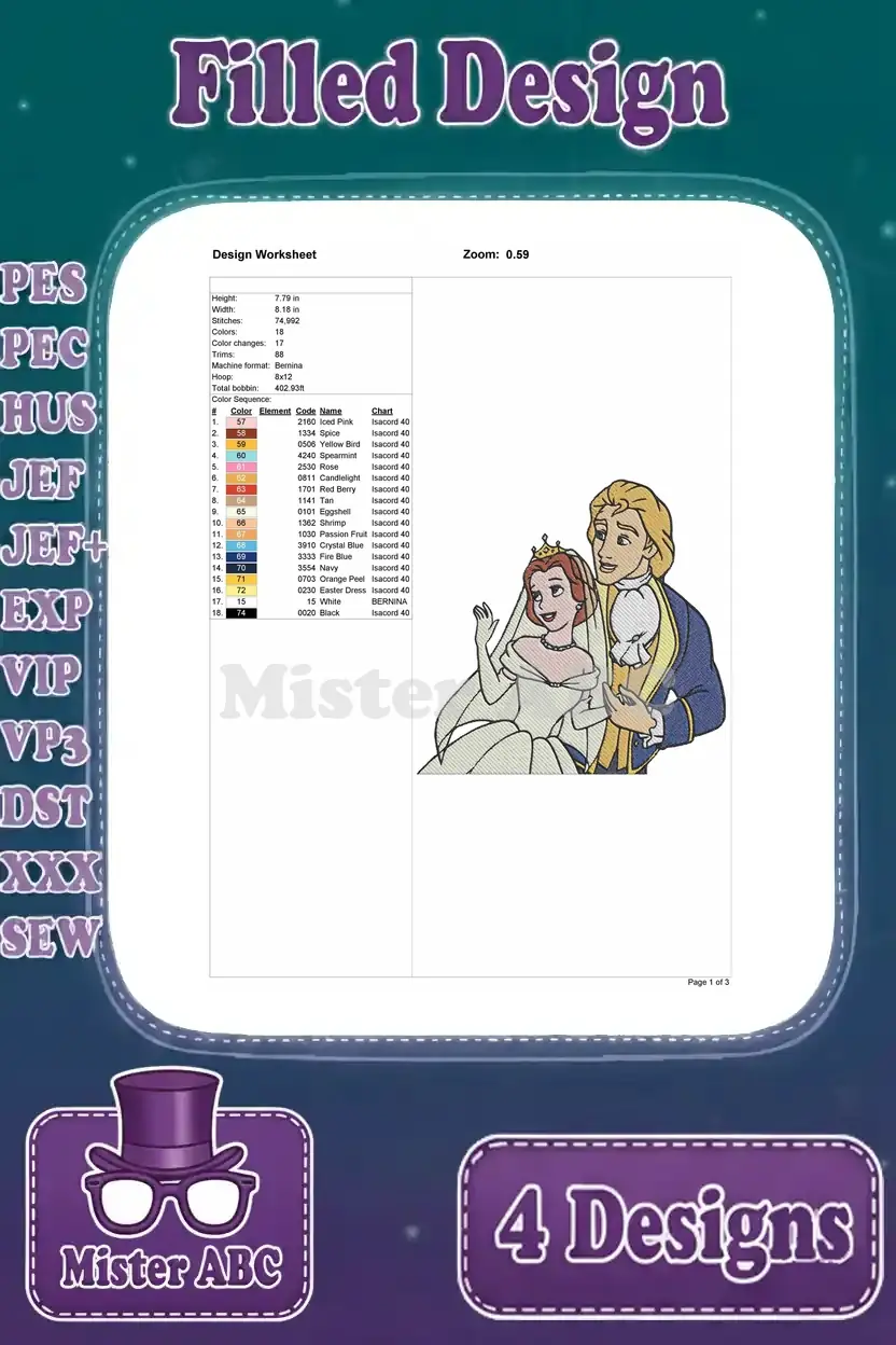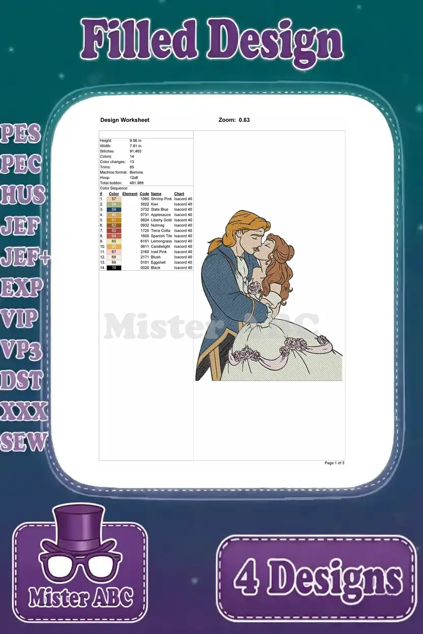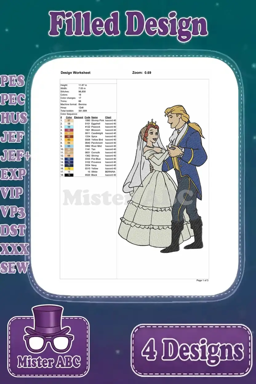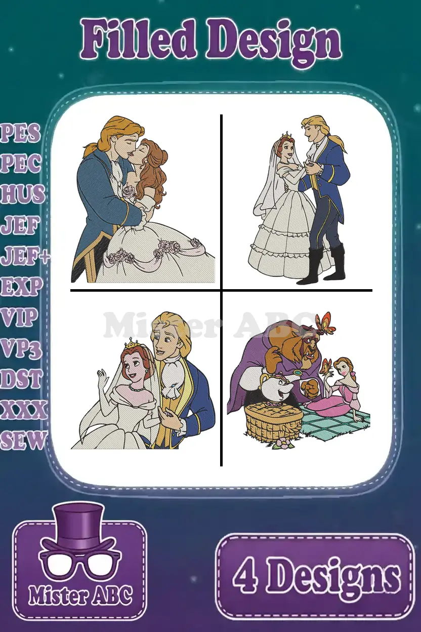 Disney Beauty Beast Prince Adam Belle Wedding Dance Beast Belle Picnic Romantic Designs – Filled Embroidery Design