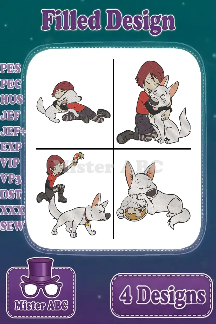 Disney Bolt Penny Forrester With Bolt Dog Owner And Pet Loyal Companions Set – Filled Embroidery Design