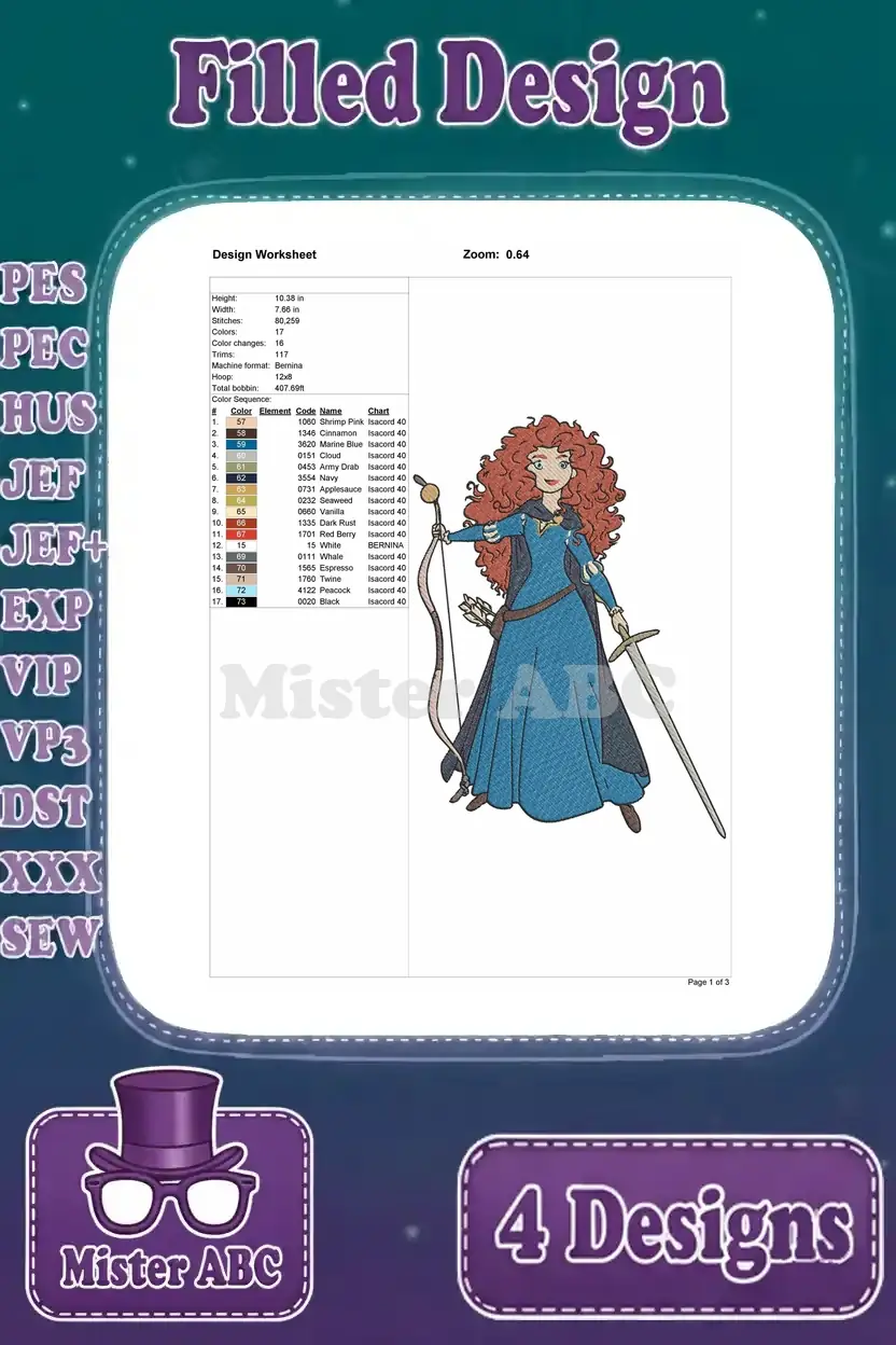 Discover a captivating bundle of 4 filled embroidery designs from Disney’s Brave, featuring Merida and two iconic lords. Perfect for adding a touch of Scottish adventure to your projects.