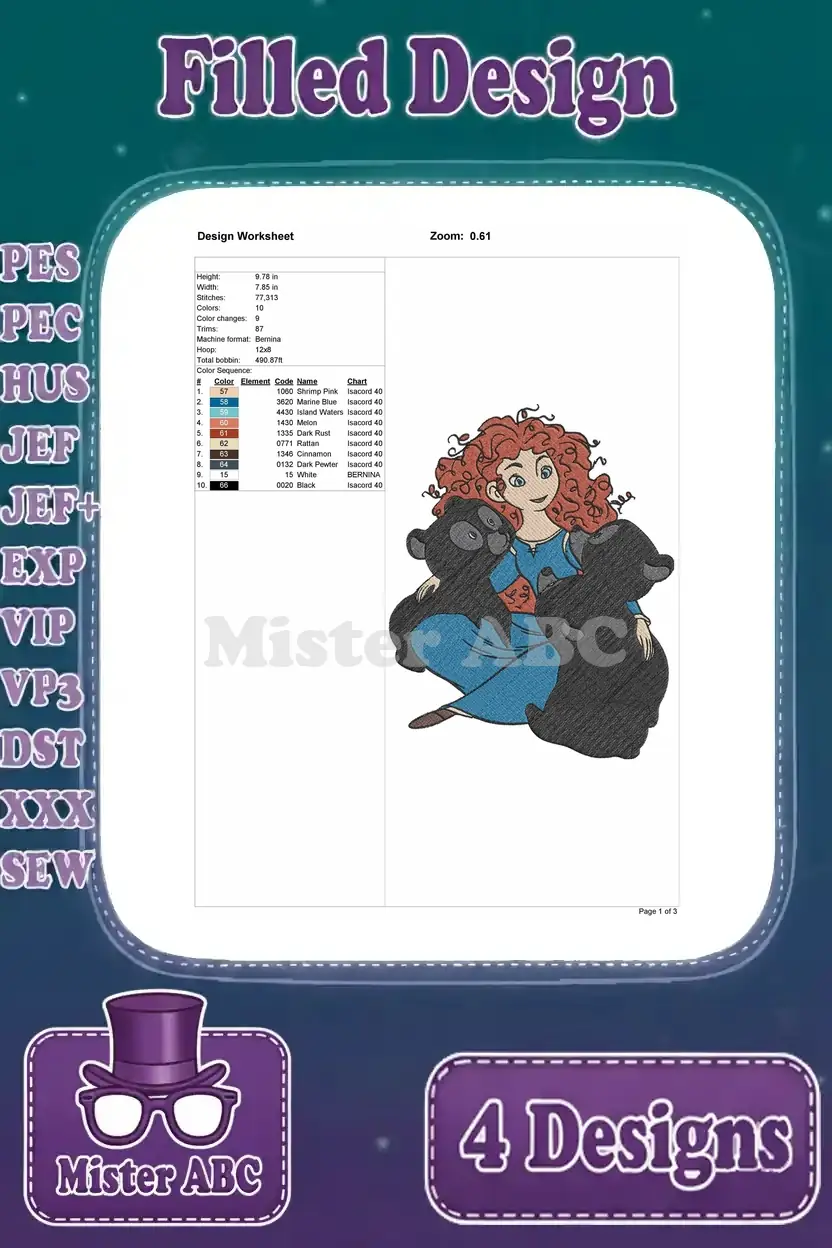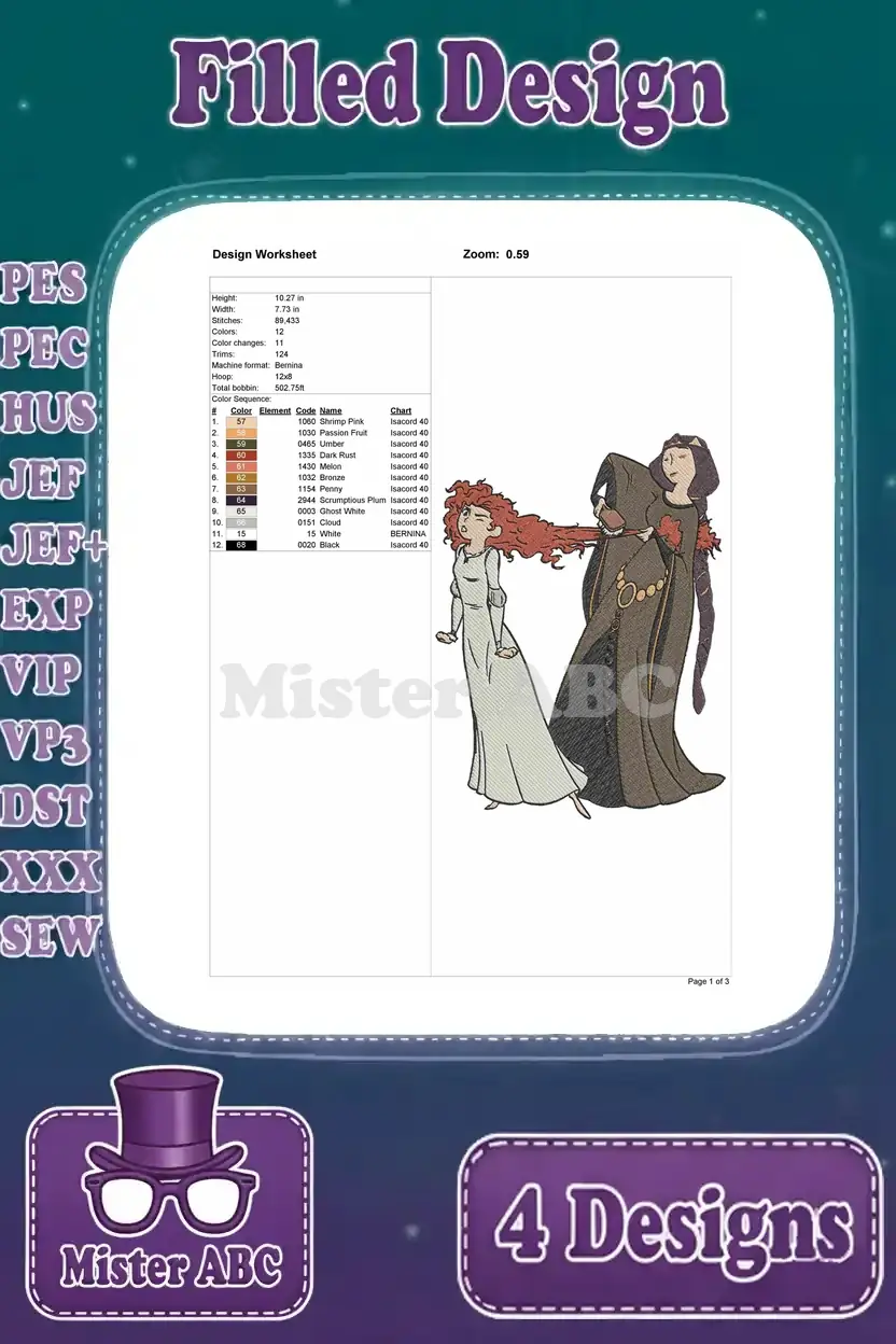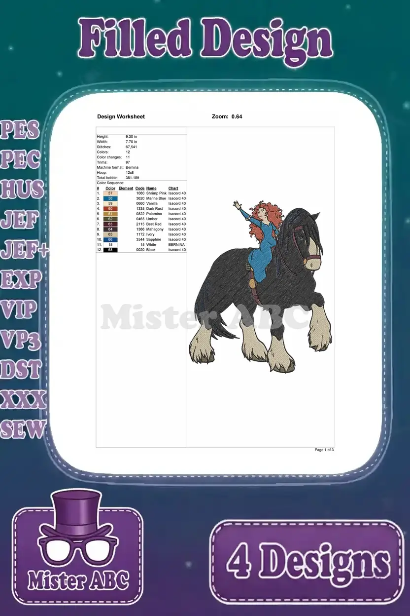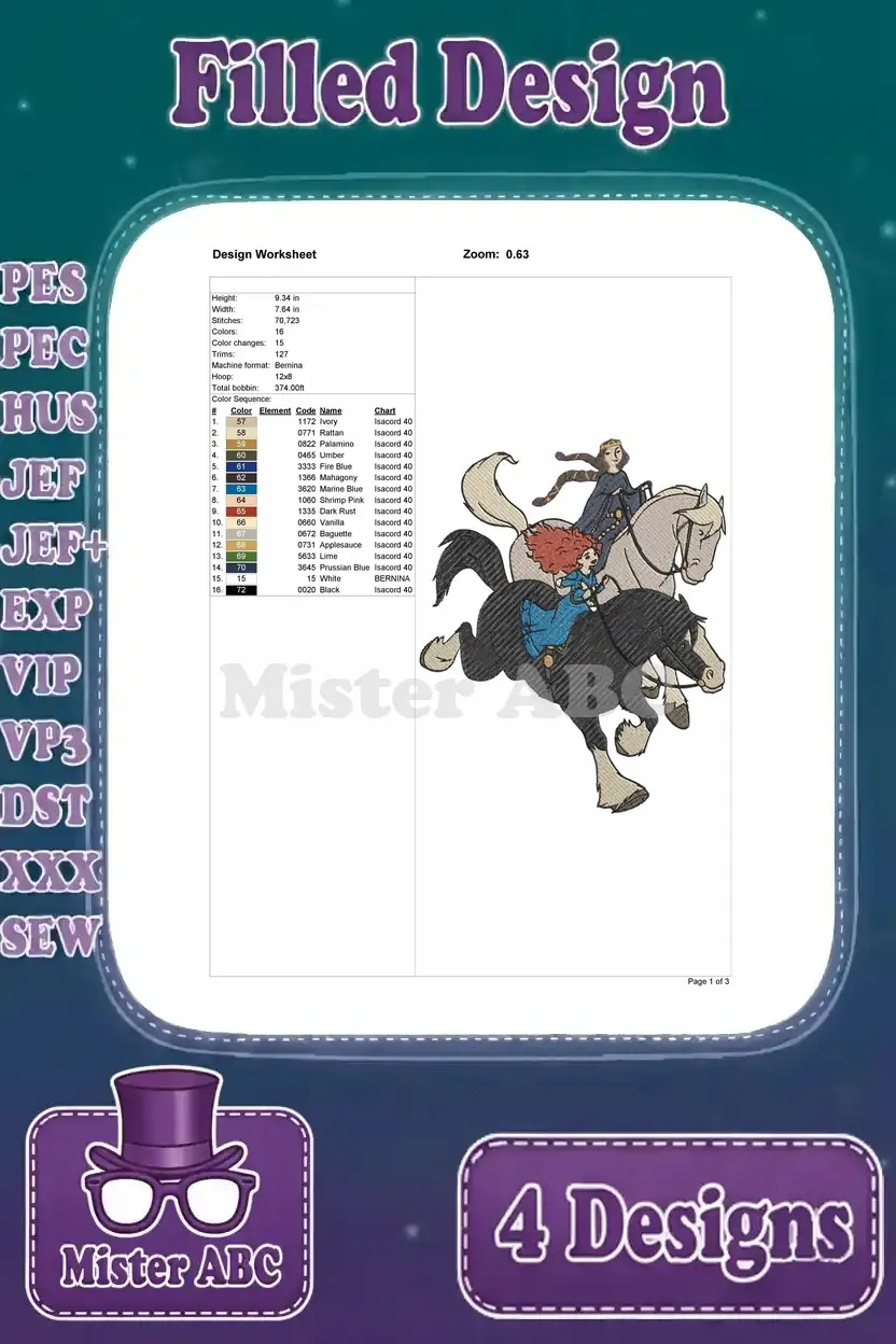 Disney Brave Merida Riding Angus Horse With Queen Elinor Mother Daughter – Filled Embroidery Design