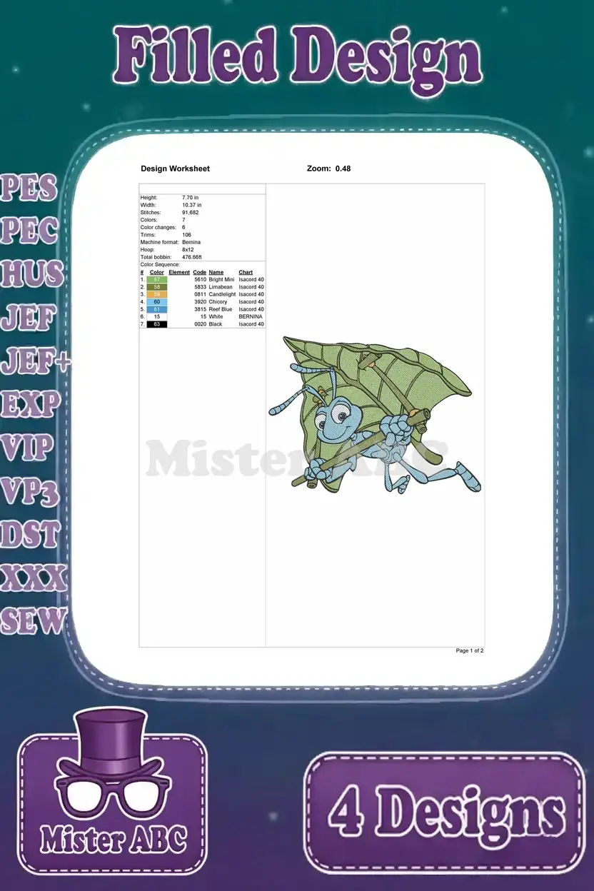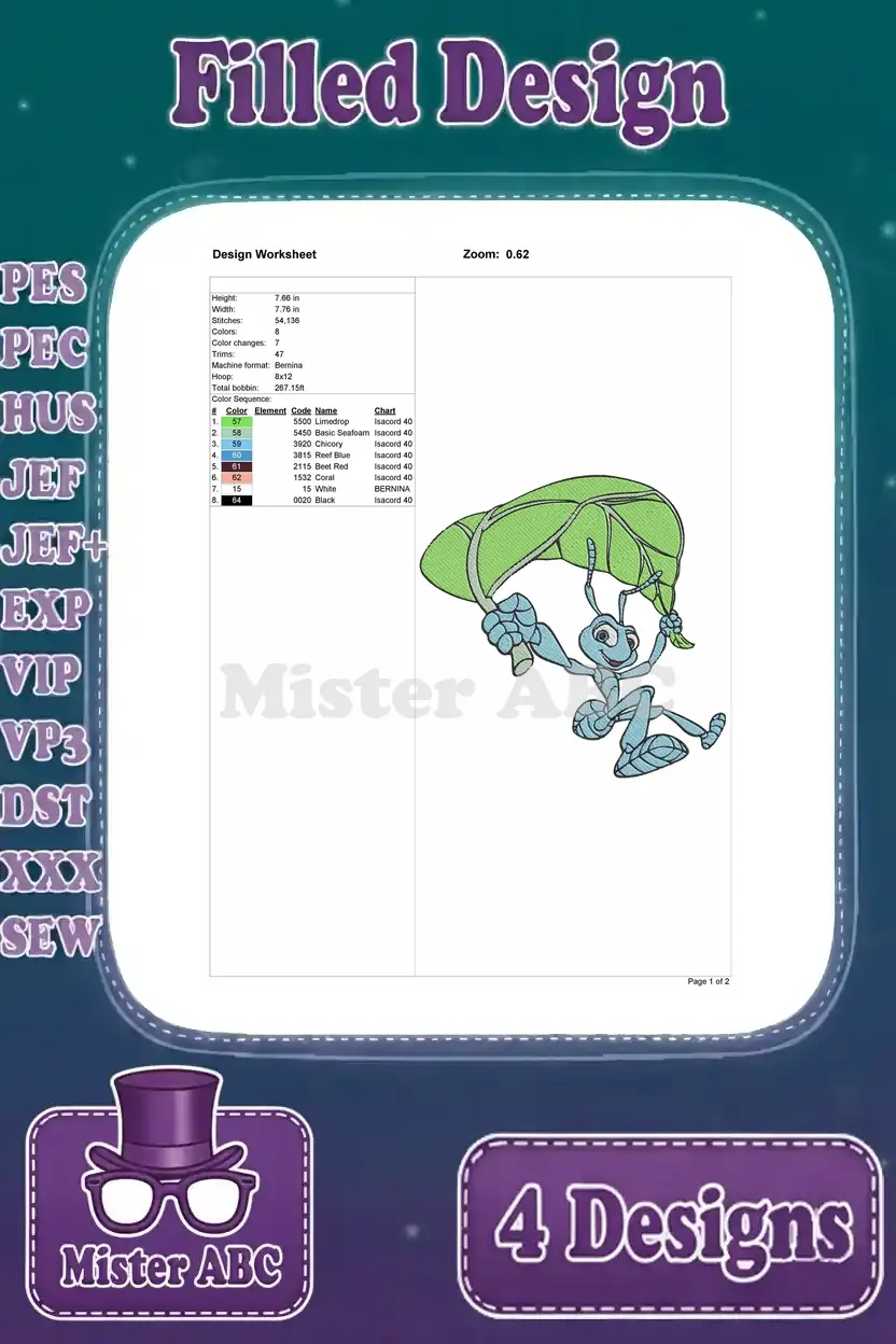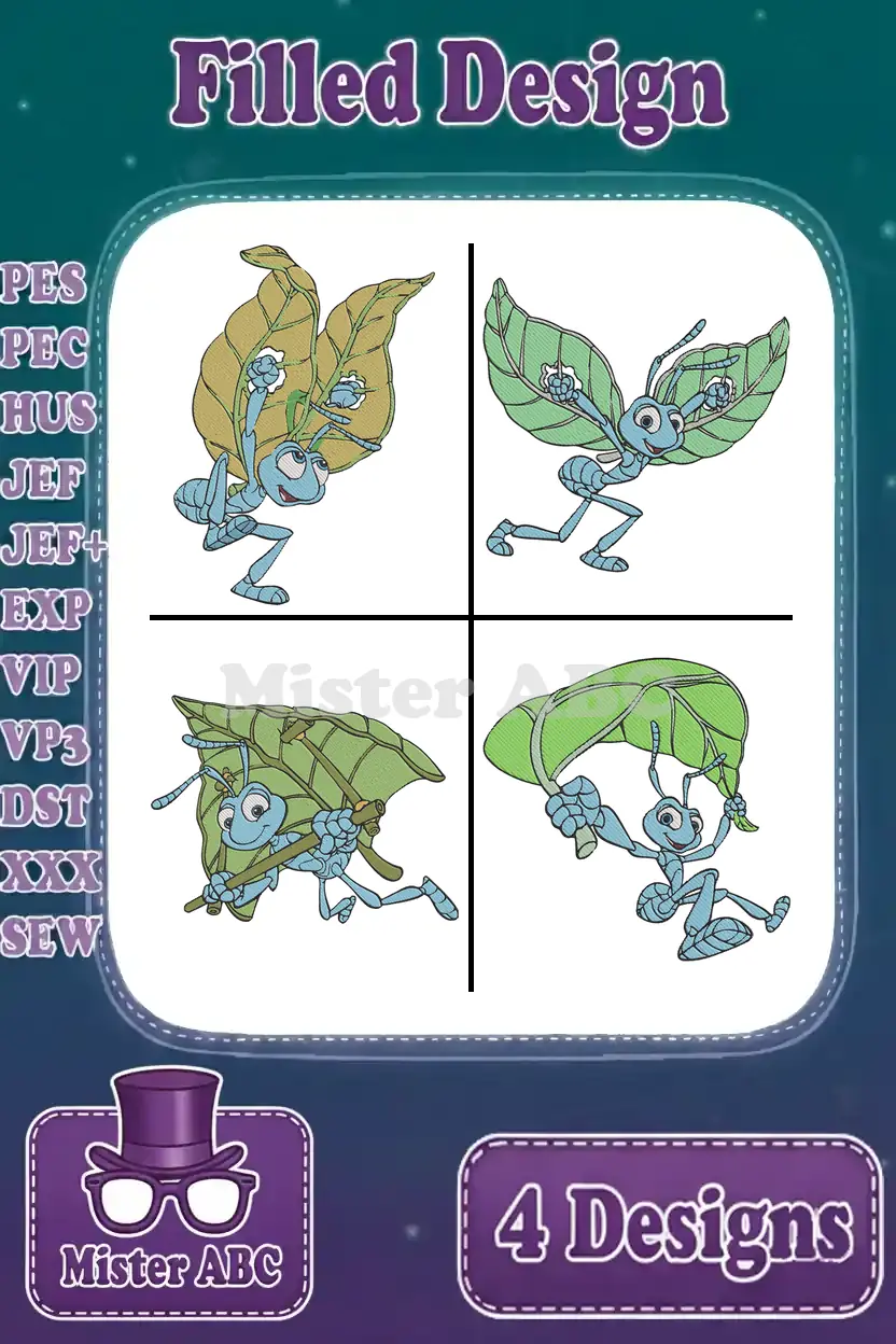 Disney A Bugs Life Flik Ant Using Leaves Gliding Shielding Flying Invention Set – Filled Embroidery Design