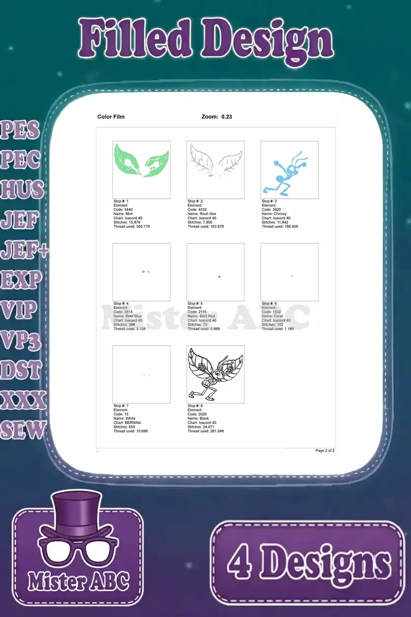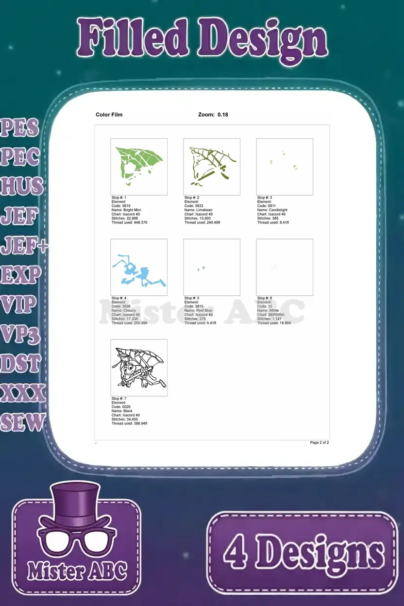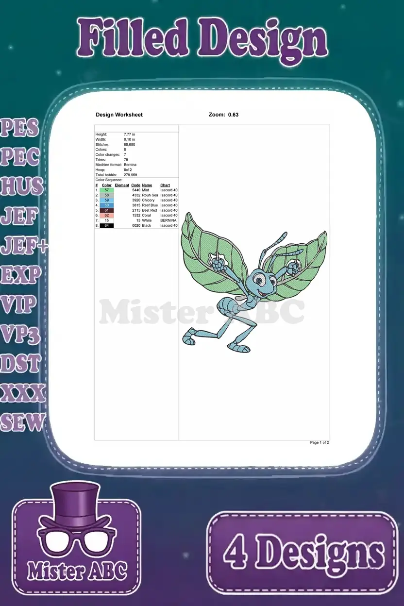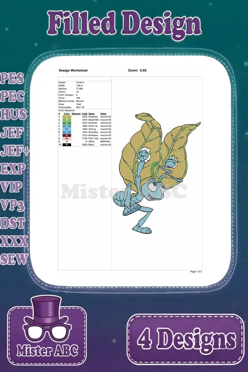 Disney A Bugs Life Flik Ant Using Leaves Gliding Shielding Flying Invention Set – Filled Embroidery Design