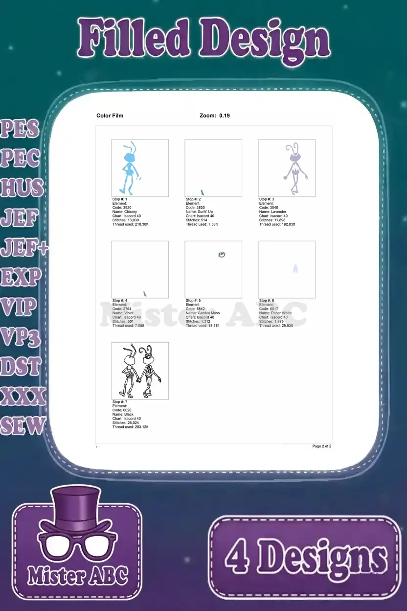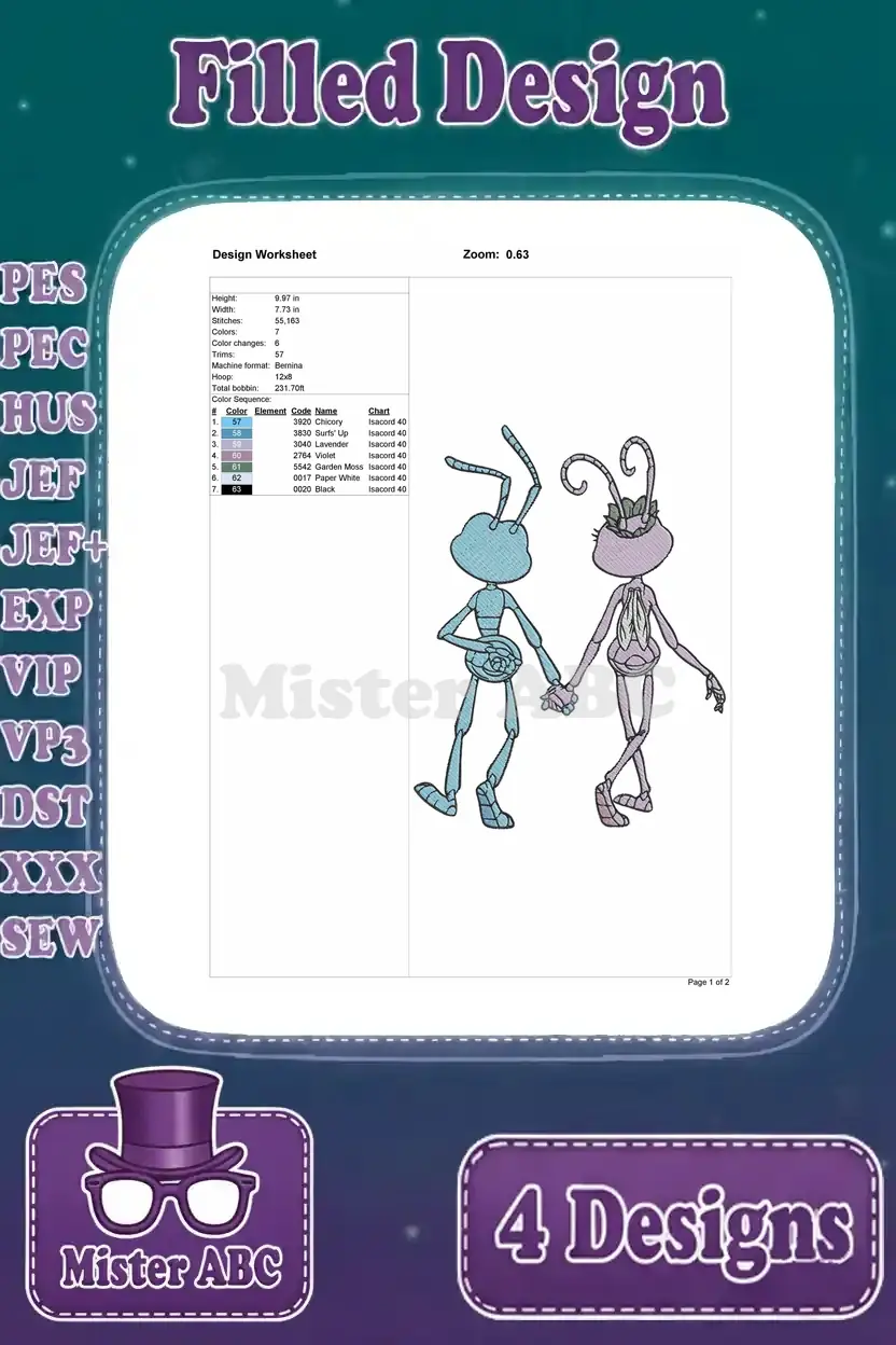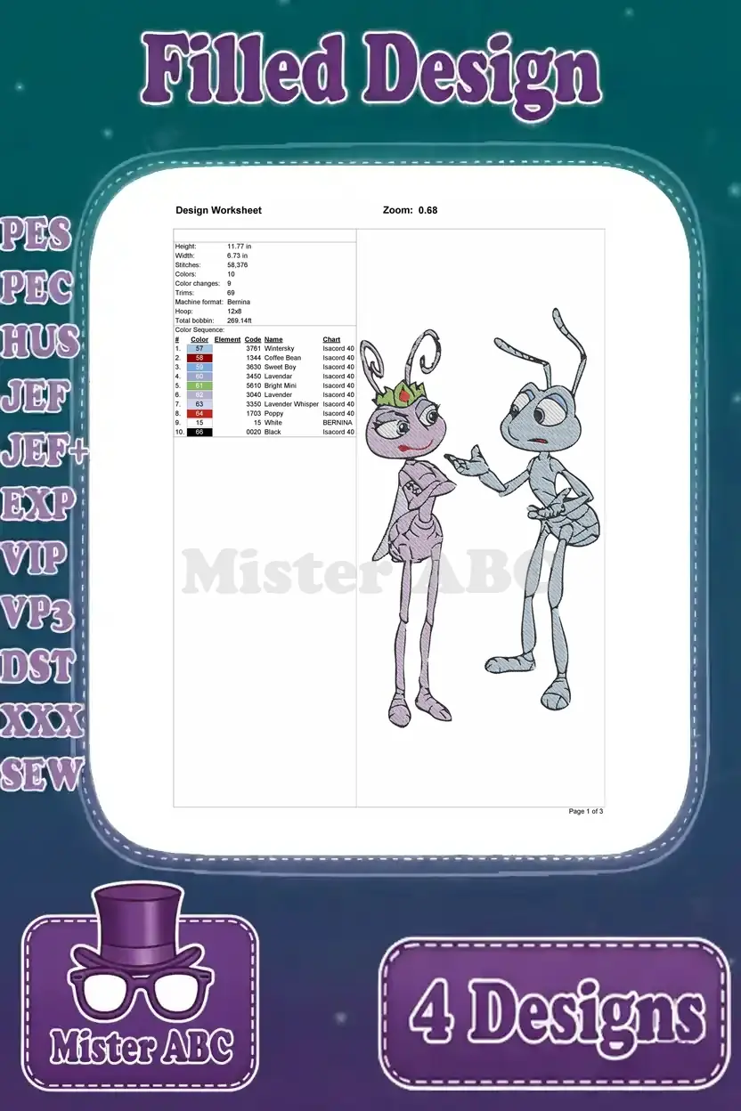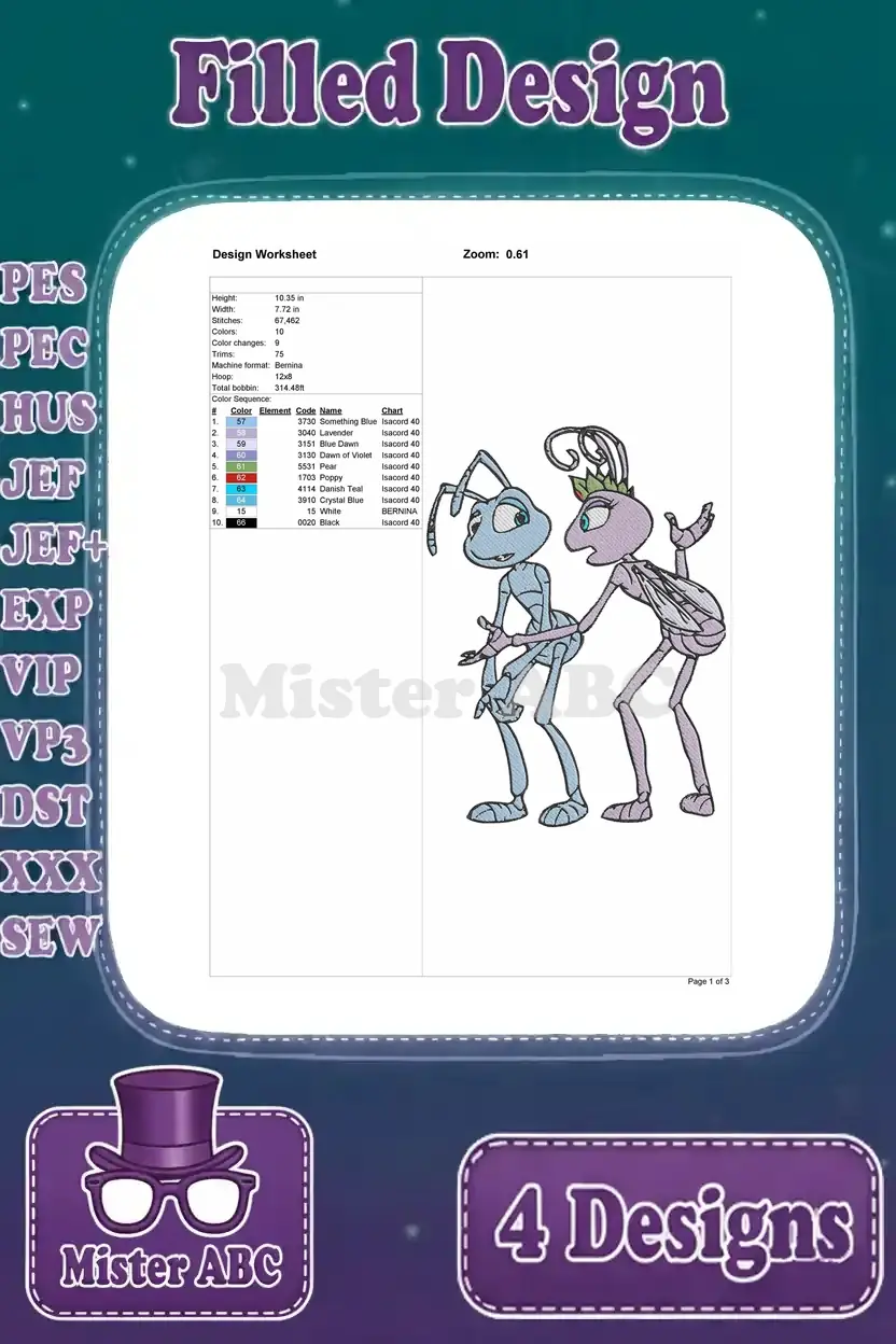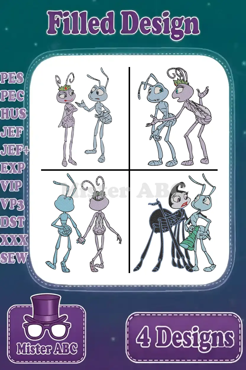 Disney A Bugs Life Flik And Princess Atta Poses With Gypsy Moth Ant Romance – Filled Embroidery Design