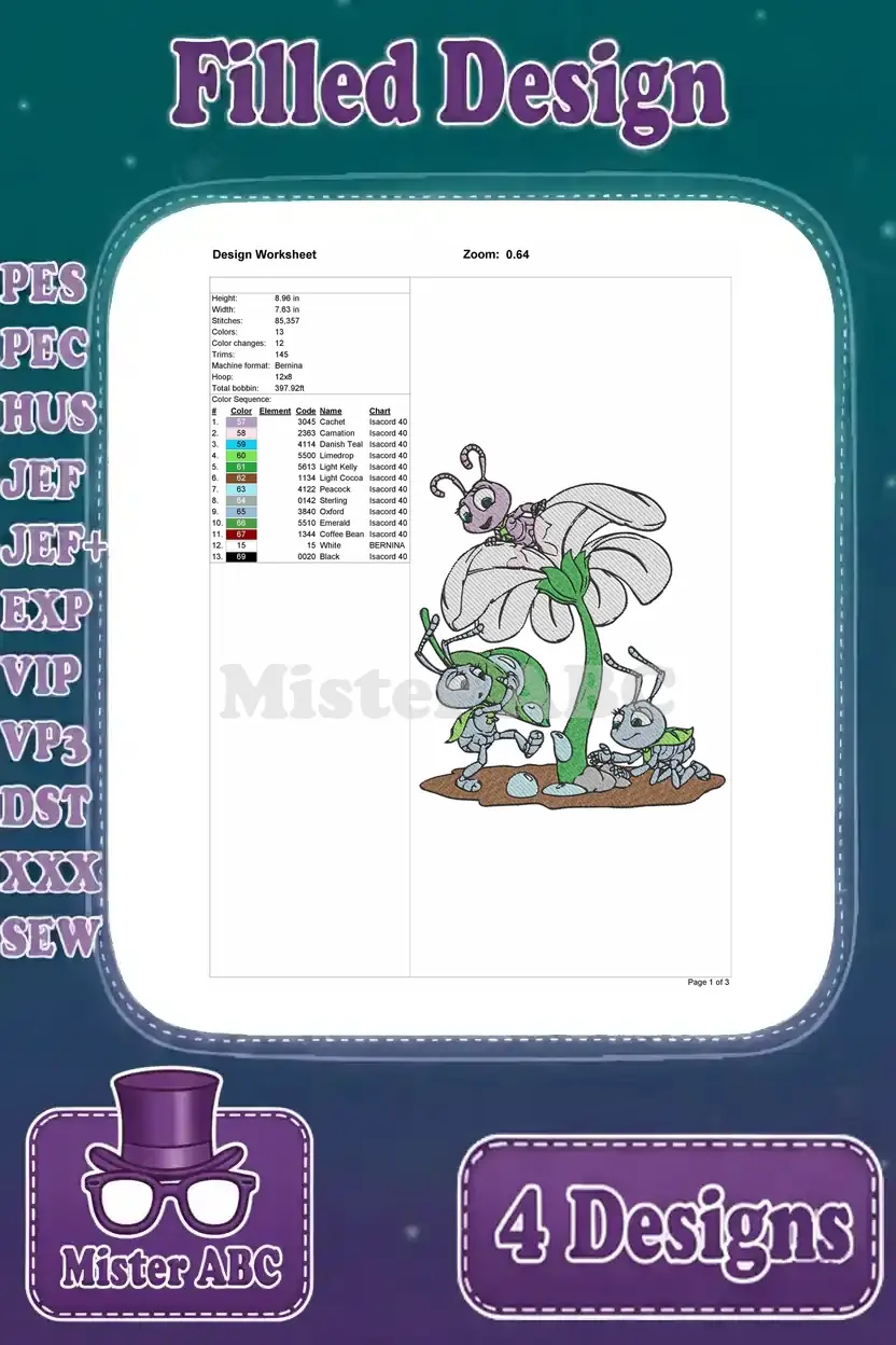 Transform your textiles with this delightful “A Bug’s Life” embroidery bundle! Four filled designs bring beloved characters to life, perfect for fans.