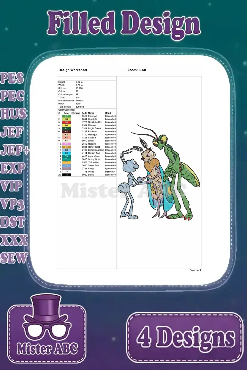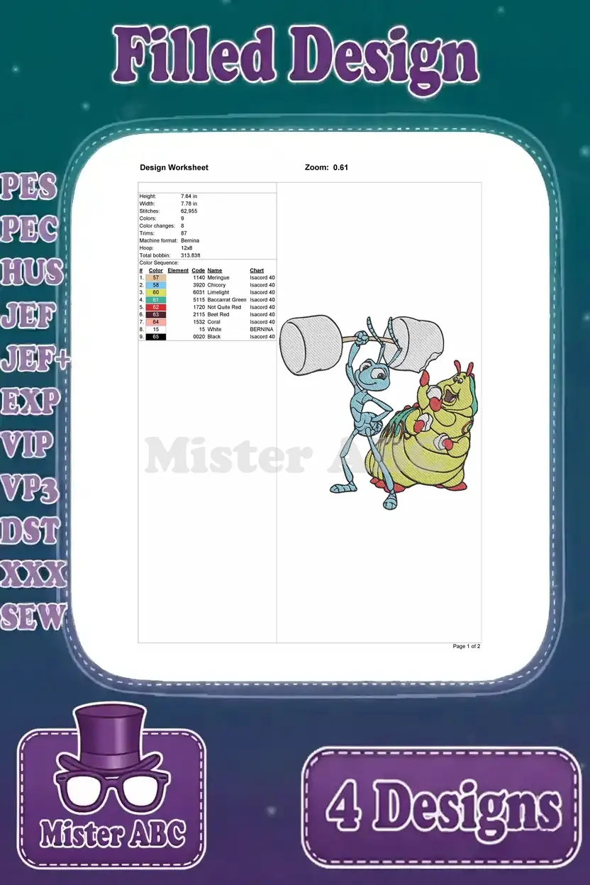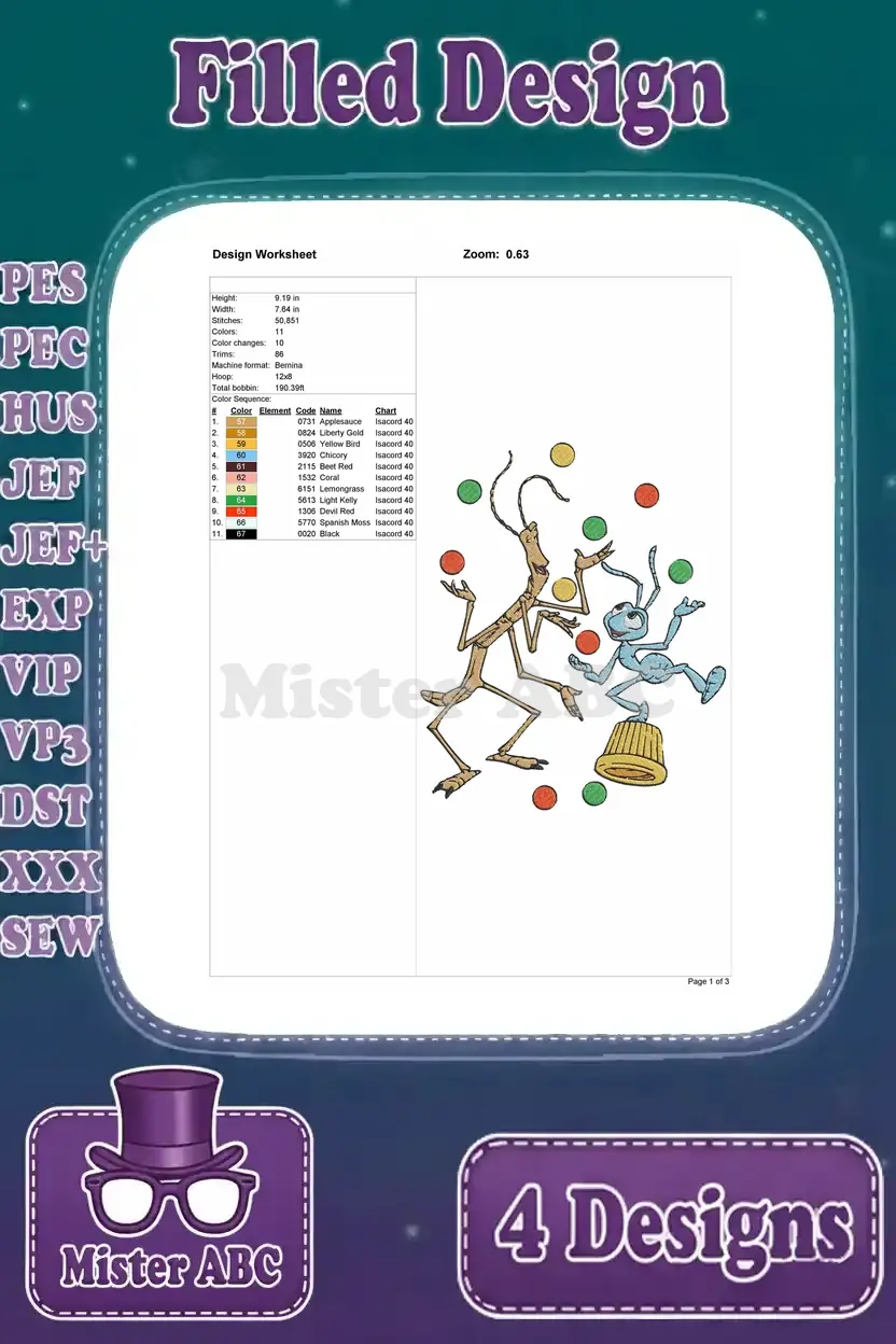 Disney A Bugs Life Manny Gypsy Flik Heimlich Molt Circus Performers Ant Interactions Bundle – Filled Embroidery Design