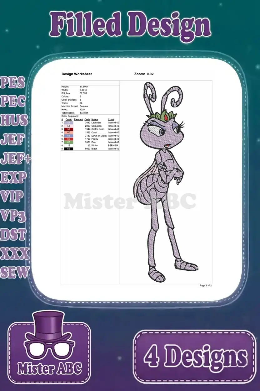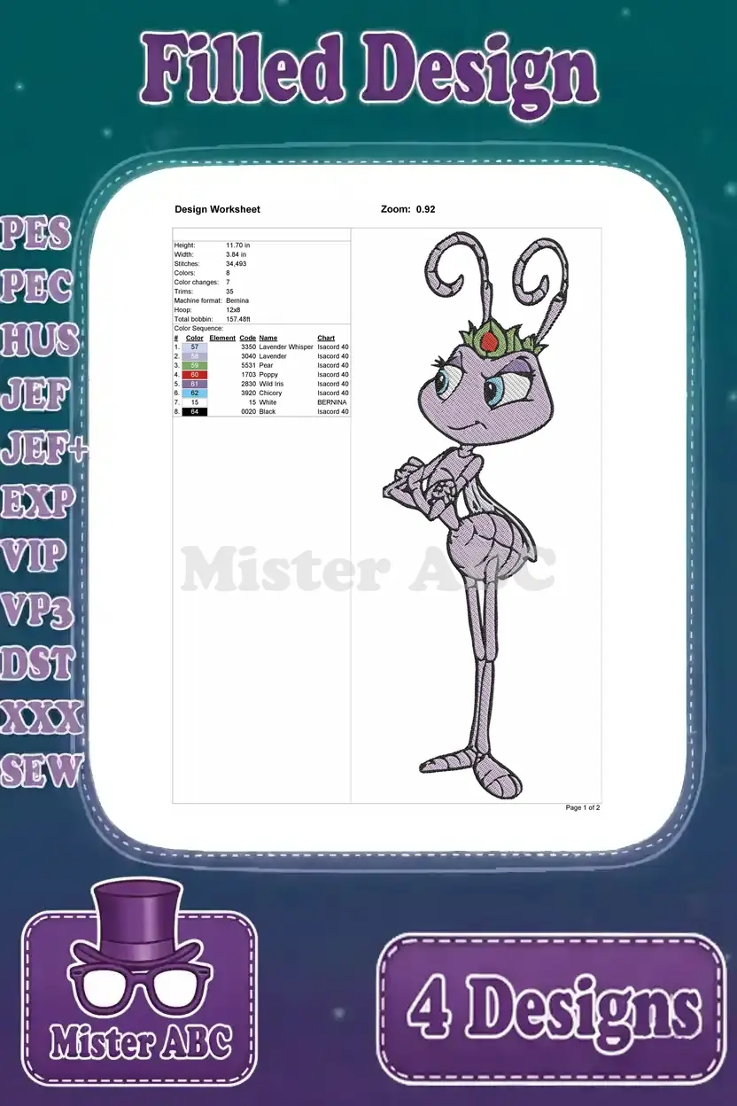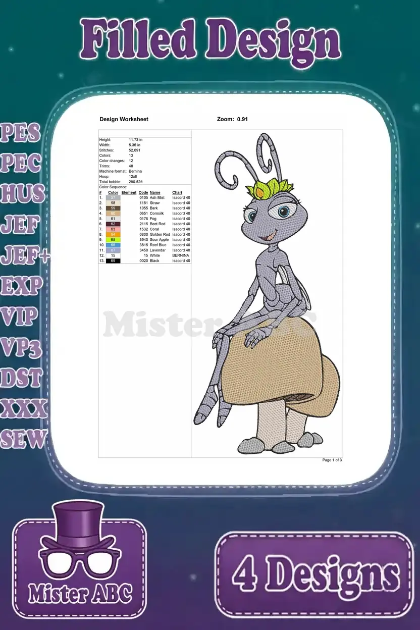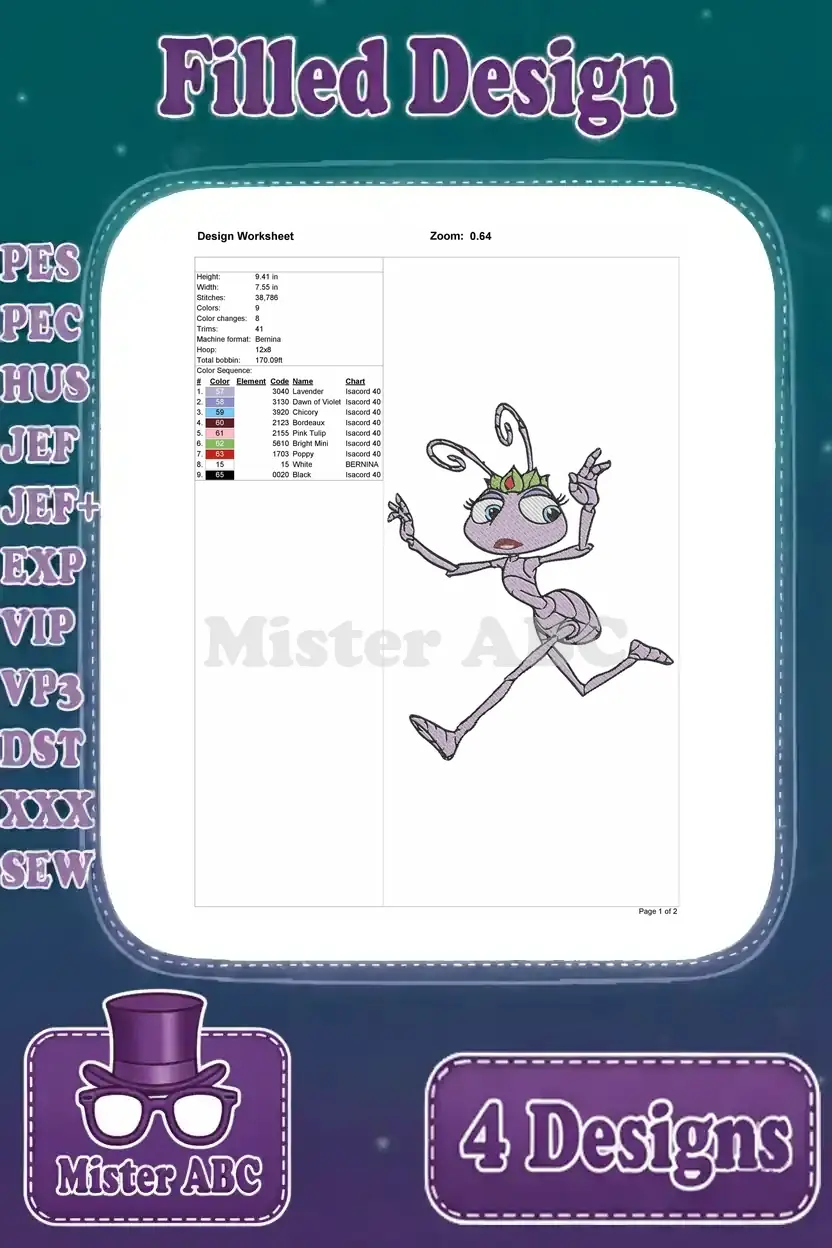Disney A Bugs Life Princess Atta Queen Ant Royal Figures Standing Graceful Poses Set – Filled Embroidery Design