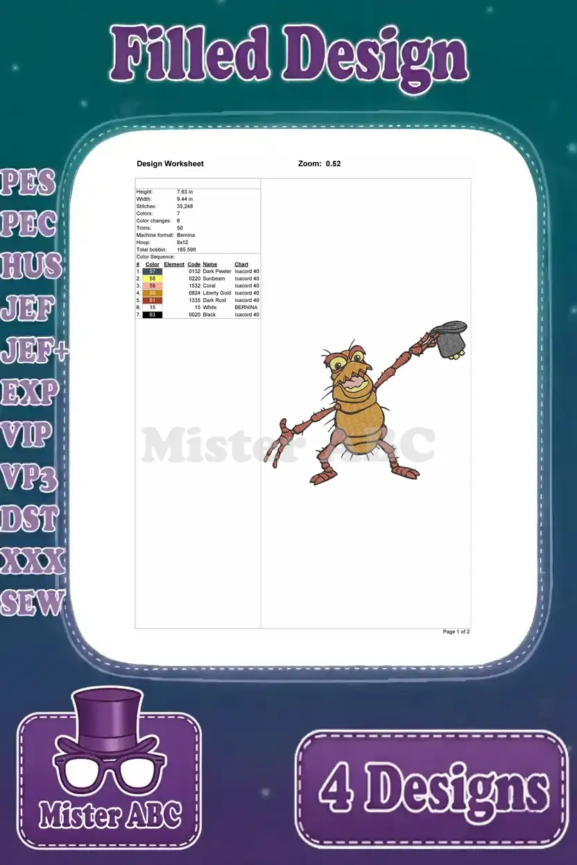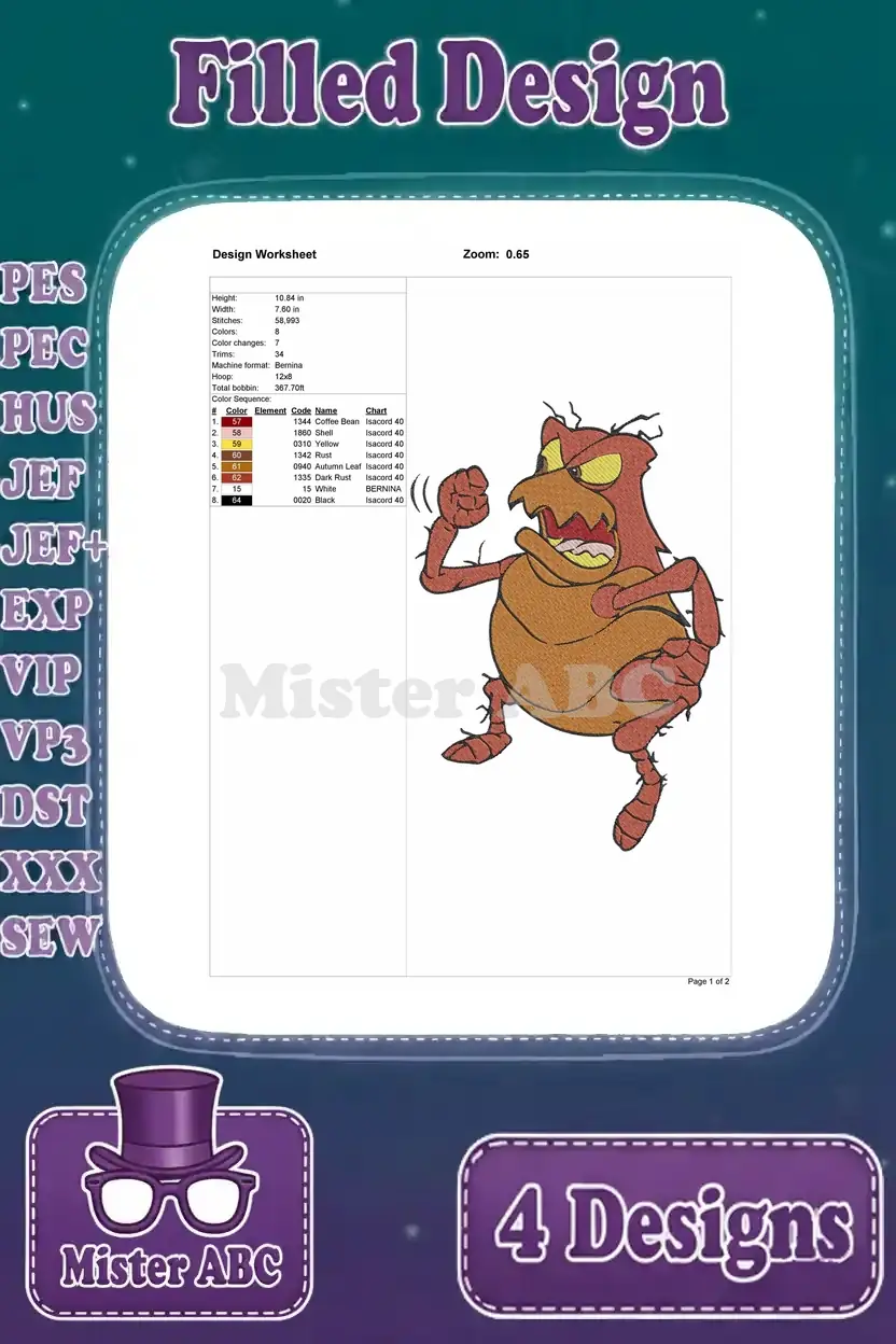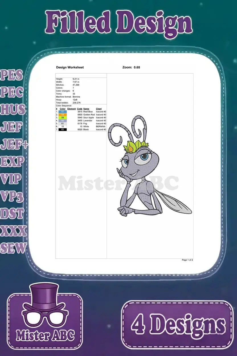 Disney A Bugs Life Thumper Grasshopper Aggressive Poses Princess Dot Flying Ant – Filled Embroidery Design