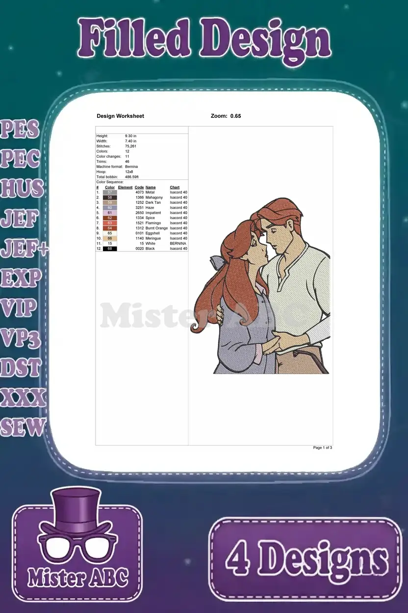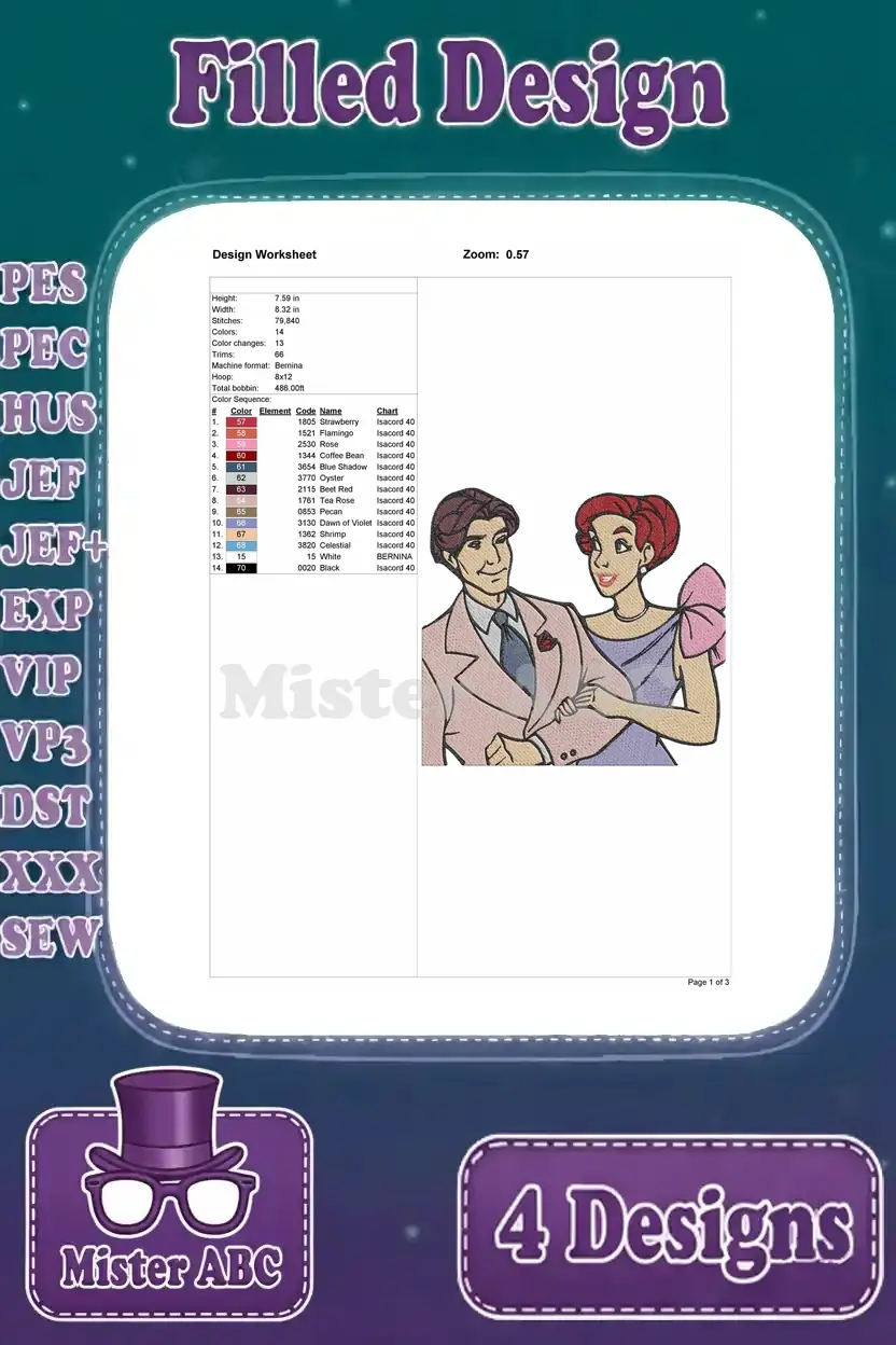 Disney Character Couples Bernard Bianca Rescuers Adam Belle Beauty Beast – Filled Embroidery Design