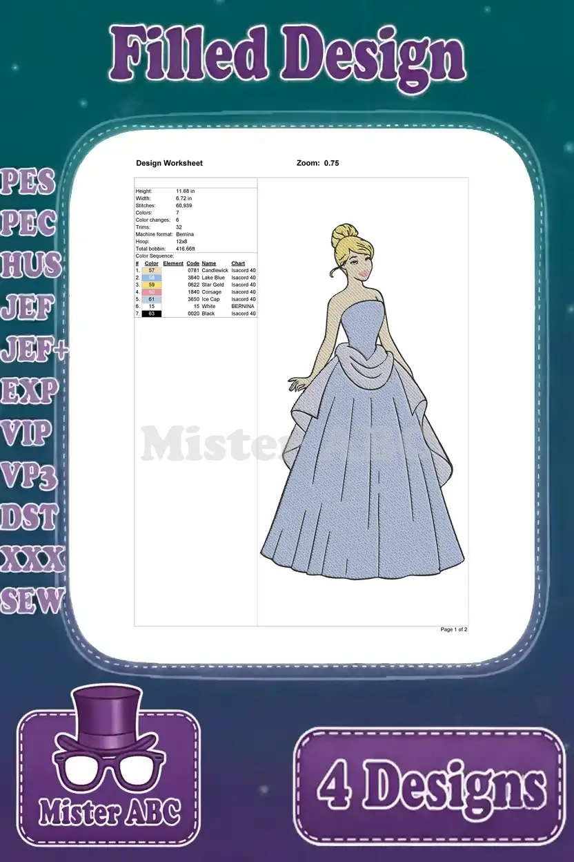 Disney Cinderella Blue Ballgown Elegant Poses Dancing Holding Dress Princess Bundle – Filled Embroidery Design