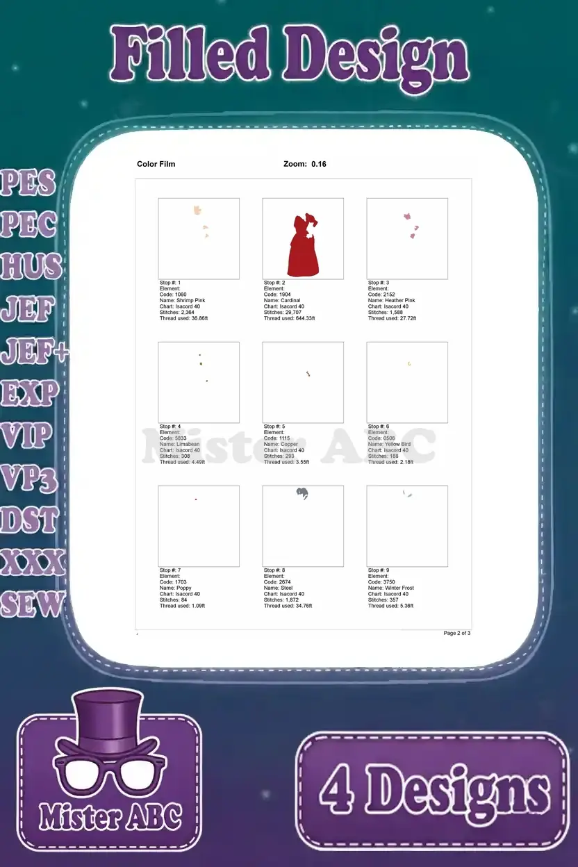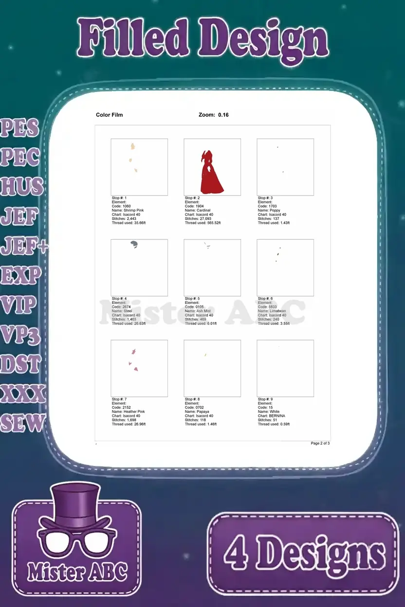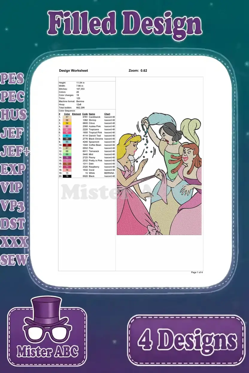 Enchanting filled embroidery designs featuring Cinderella’s stepfamily and stepsisters, perfect for fairy tale fans and crafters.