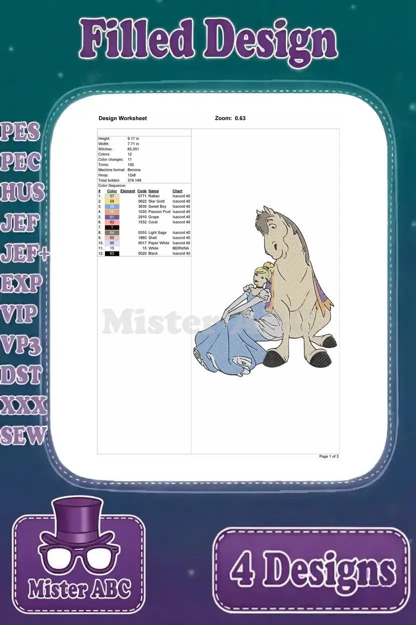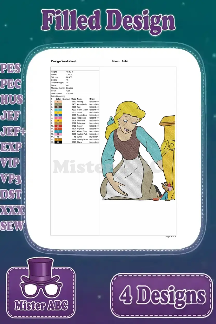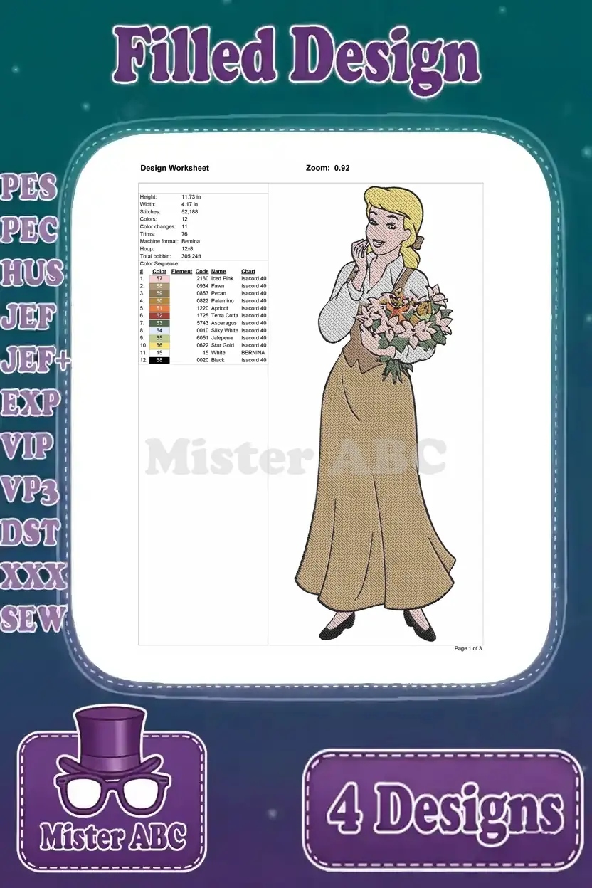 Disney Cinderella Peasant Dress Flowers Pumpkins Bruno Dog Gentle Princess – Filled Embroidery Design