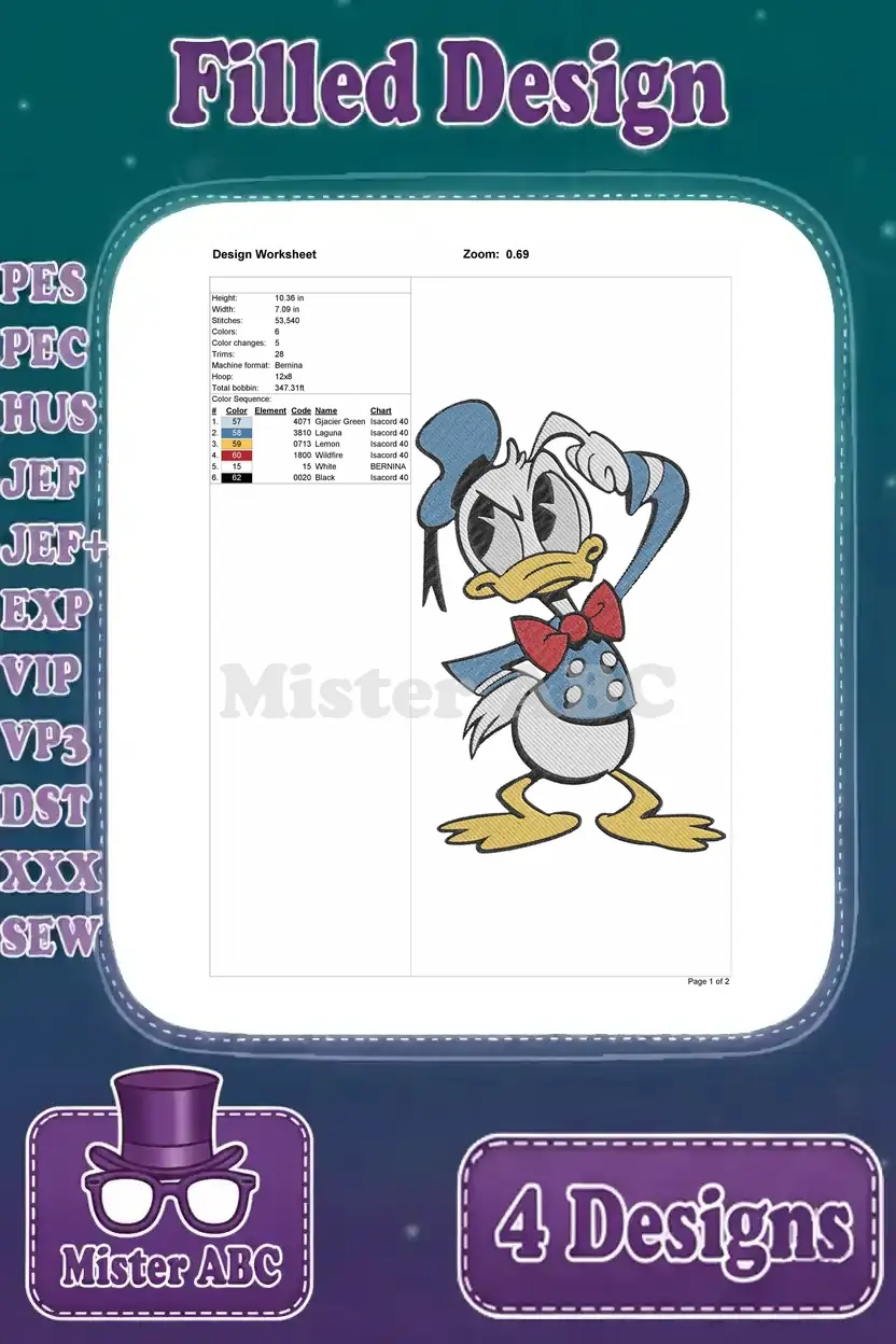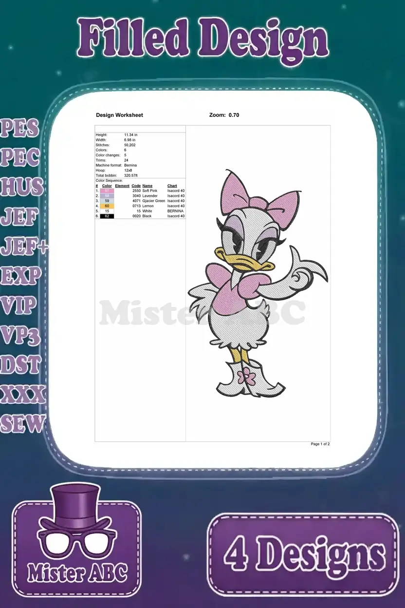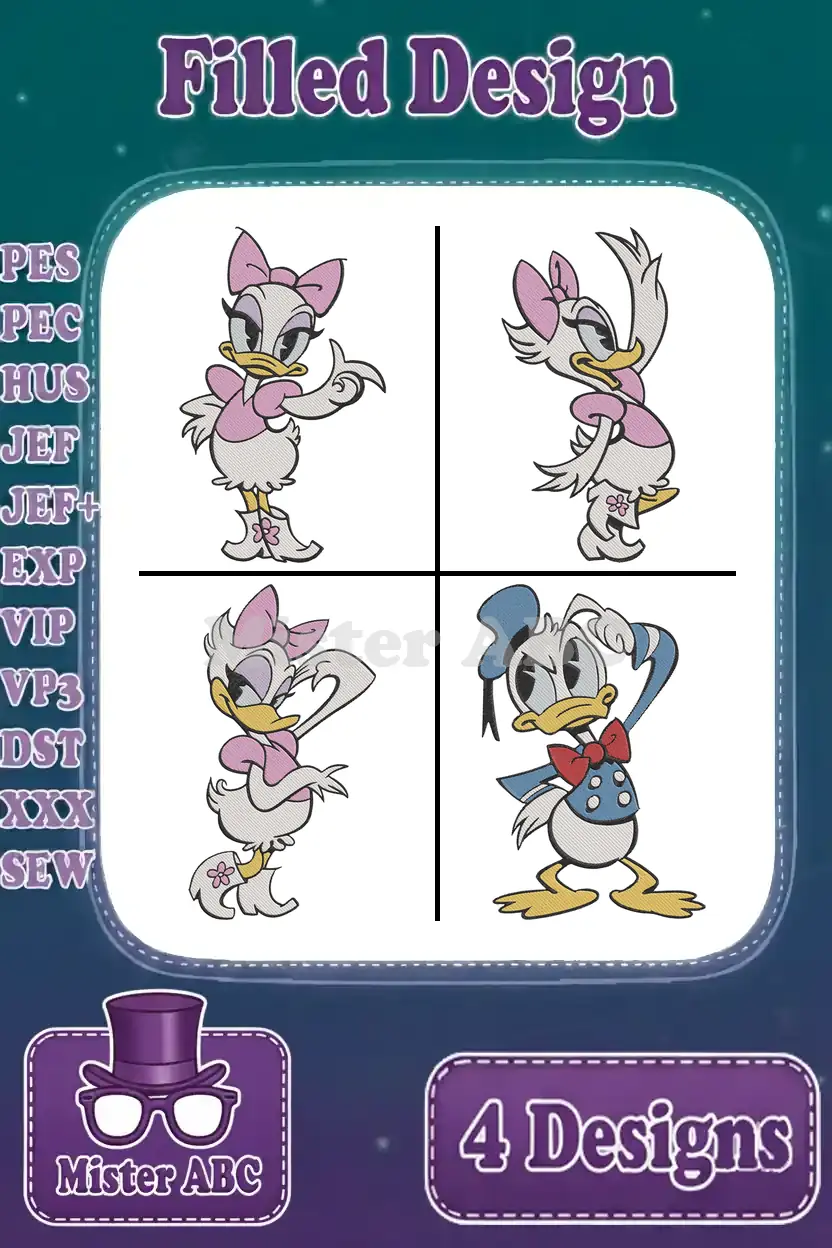 Discover this charming embroidery bundle featuring three delightful Daisy Duck poses and a classic Donald Duck design. Perfect for Disney fans!